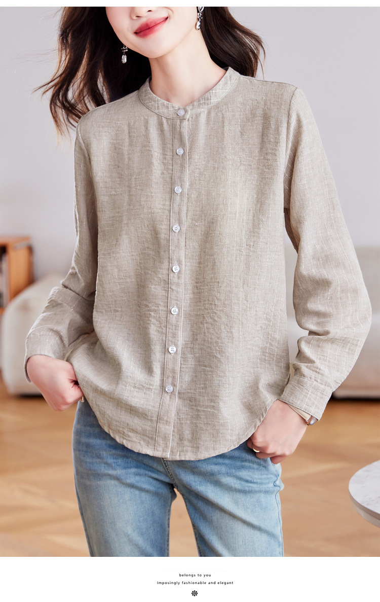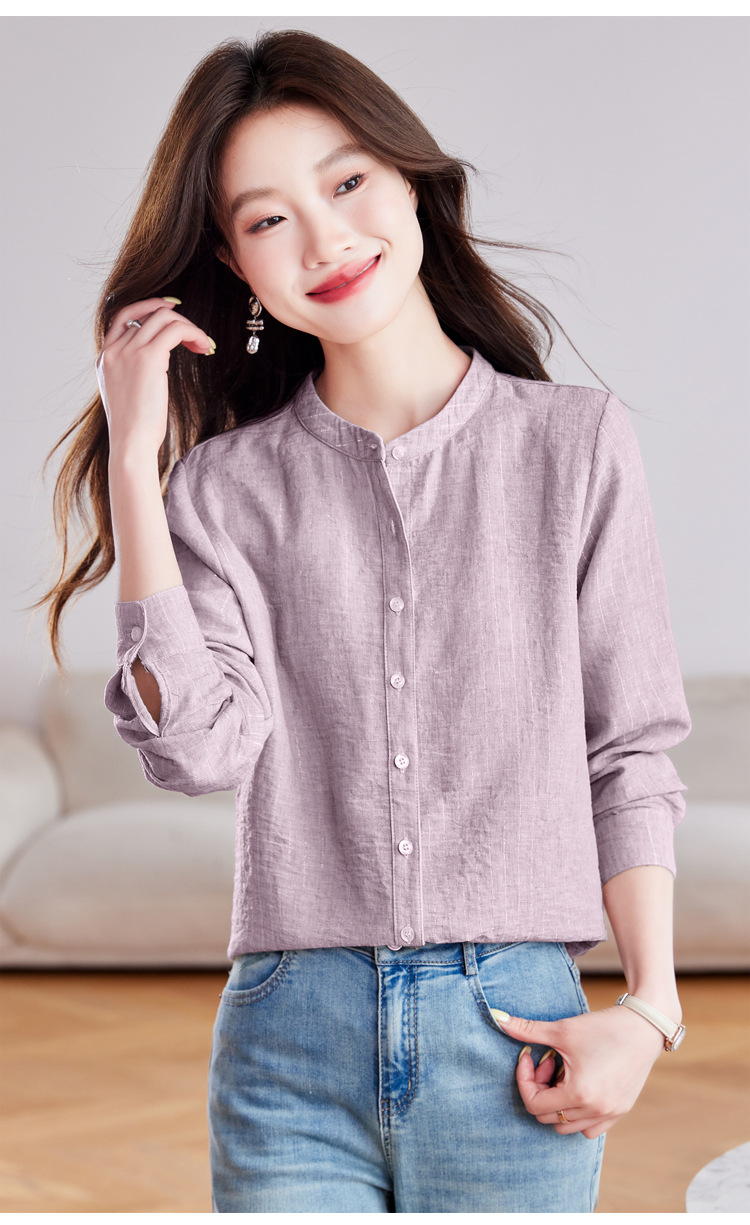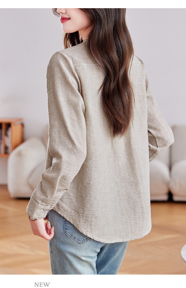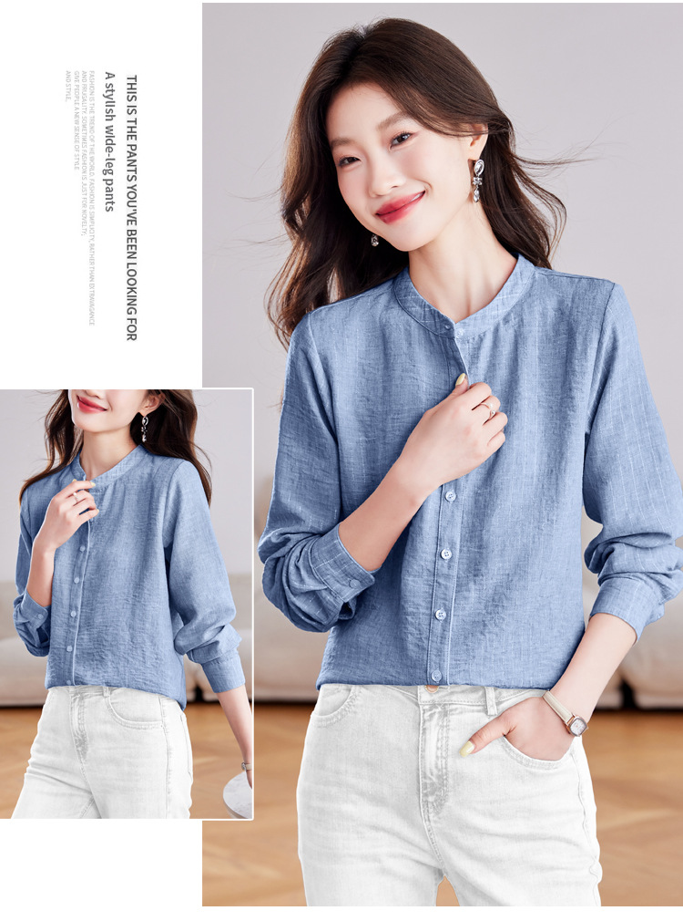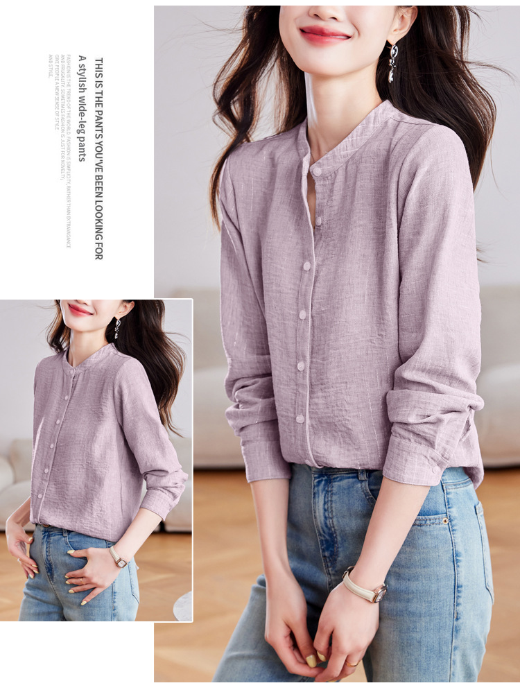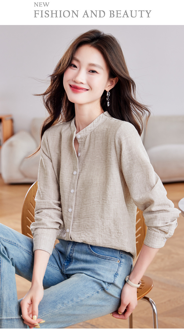 KQL2025春秋高端银丝仿麻长袖单排扣立领宽松显瘦纯色女装衬衫上衣