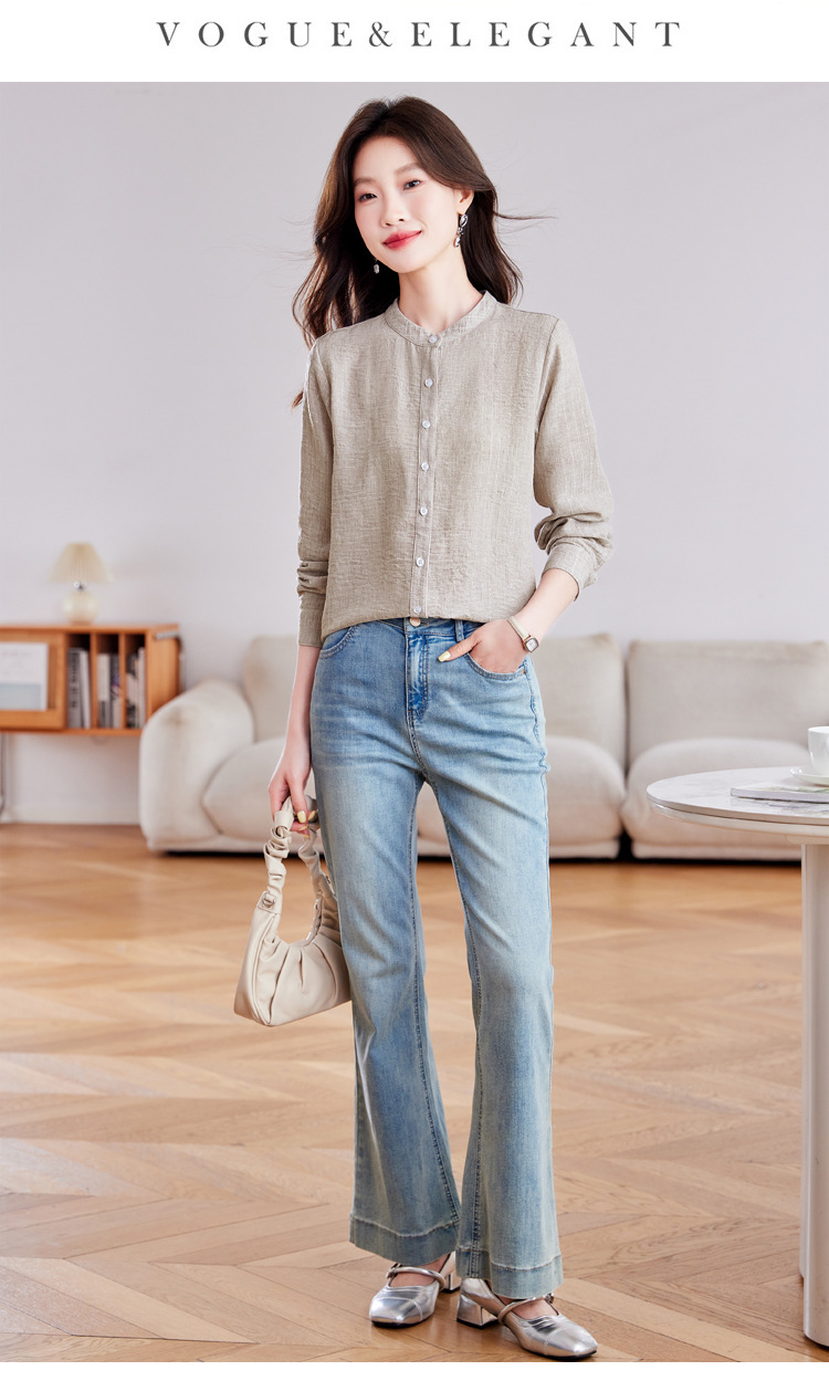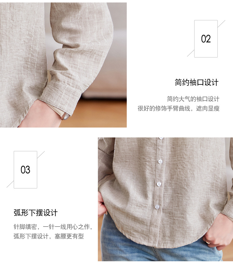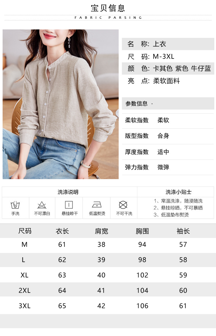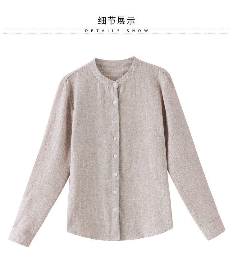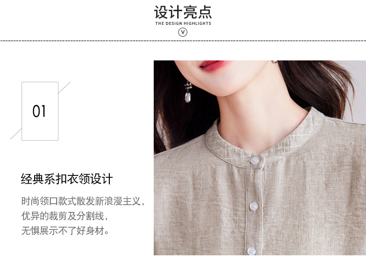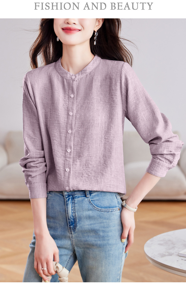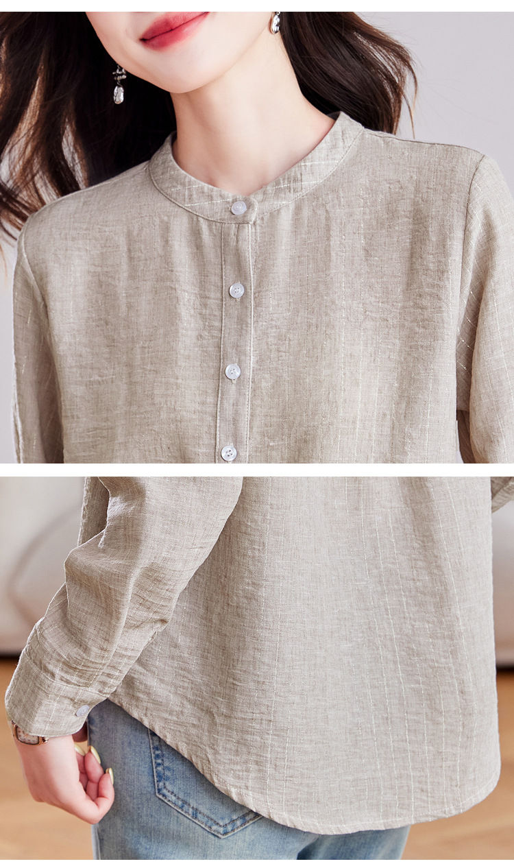 KQL2025春秋高端银丝仿麻长袖单排扣立领宽松显瘦纯色女装衬衫上衣