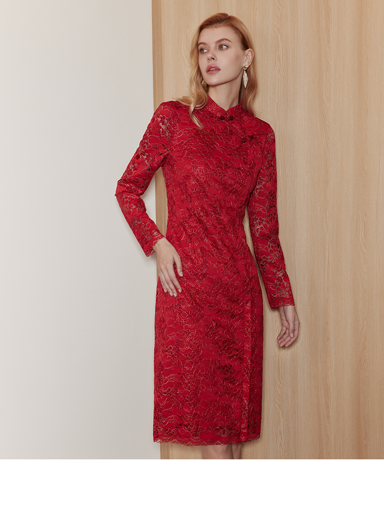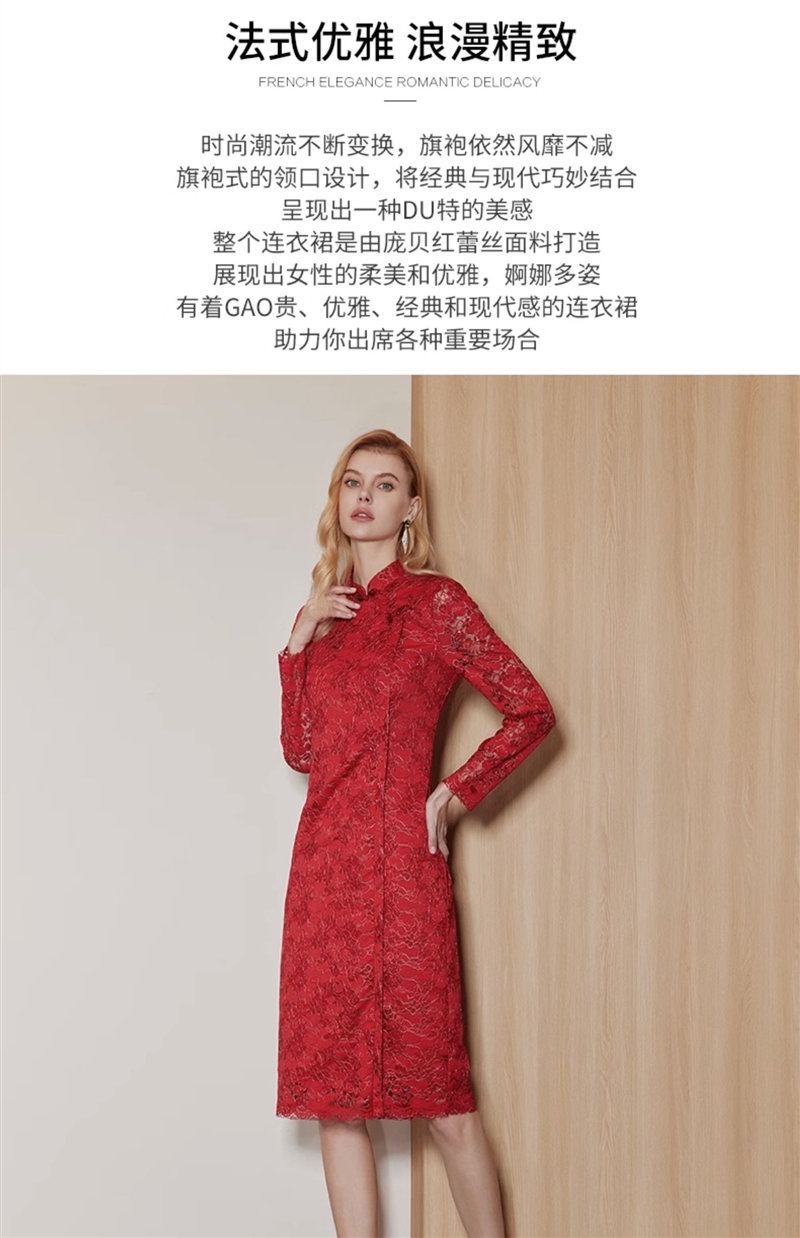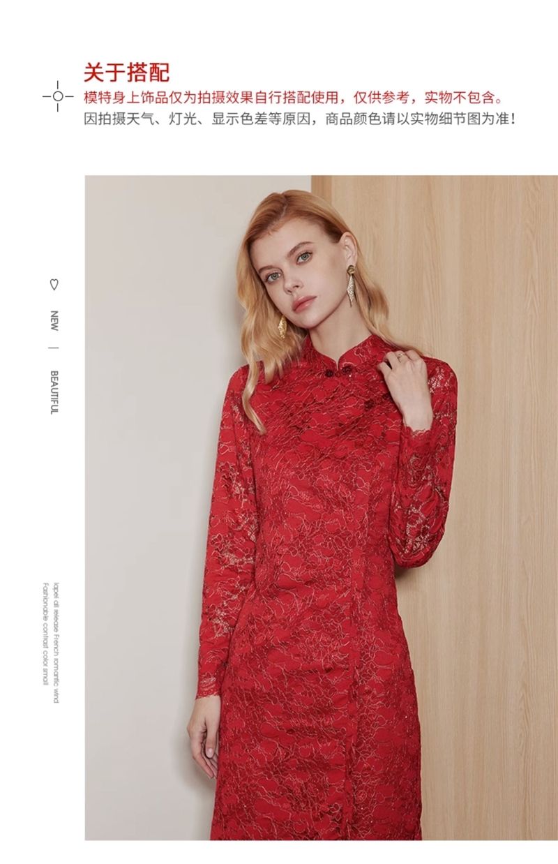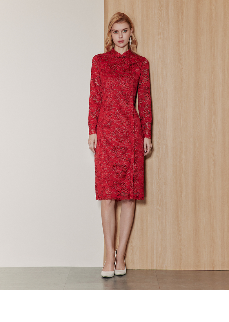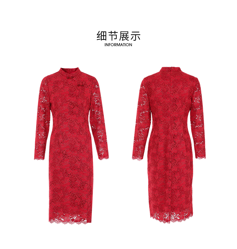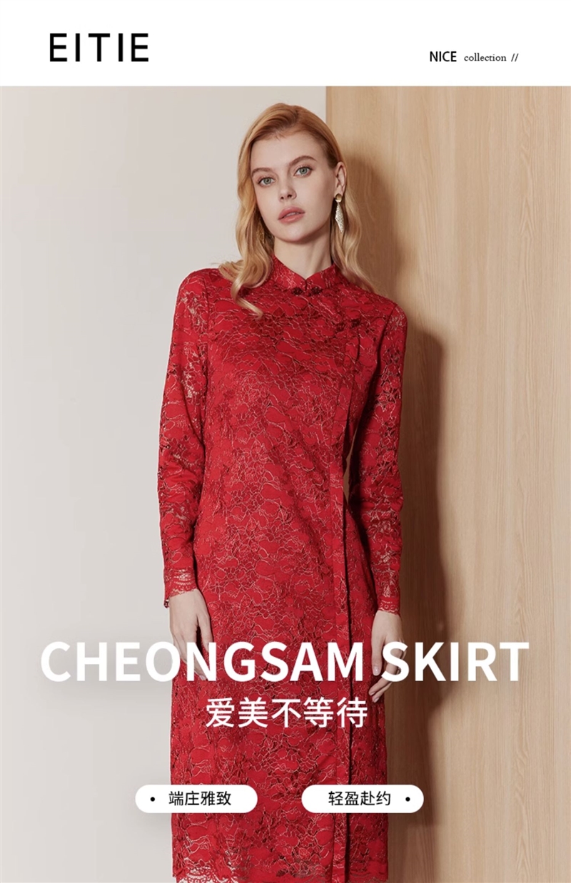 EITIE爱特爱复古中式立领盘扣改良旗袍红色蕾丝连衣裙秋季新款C07202
