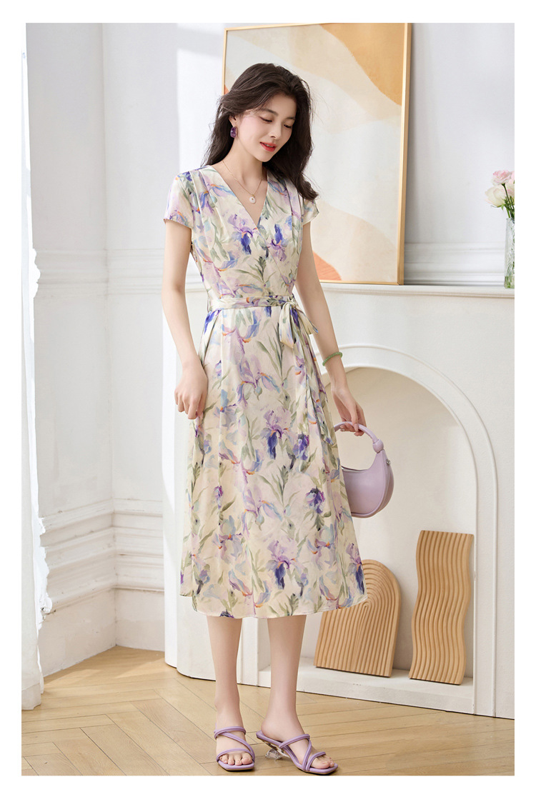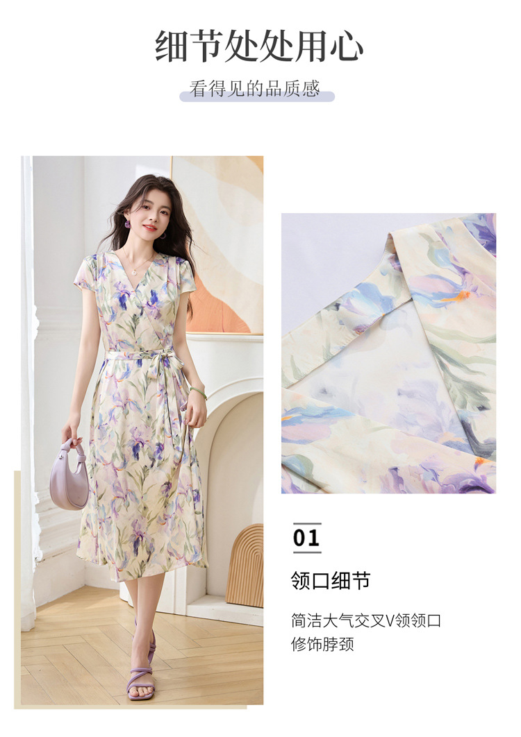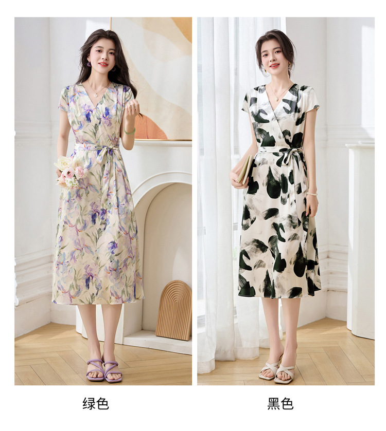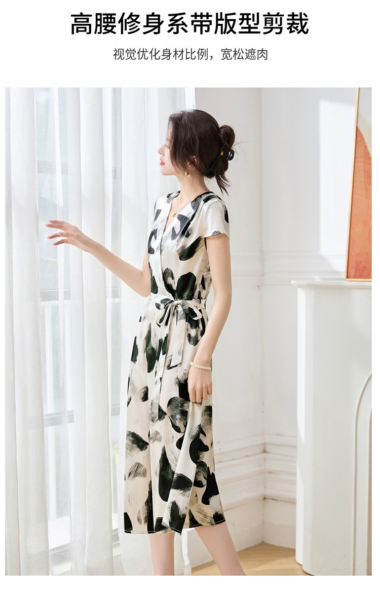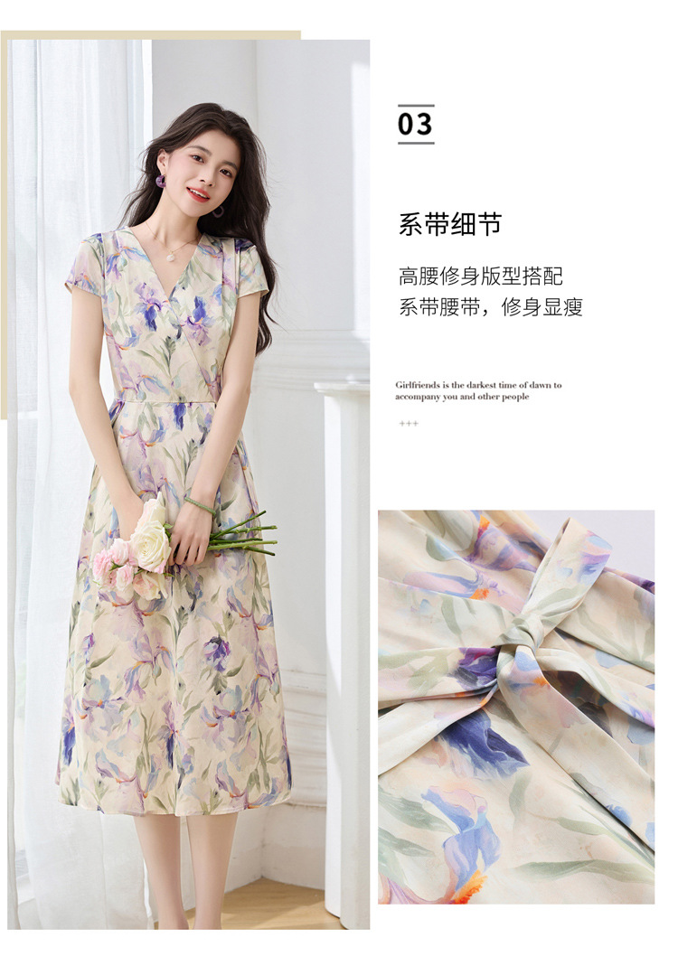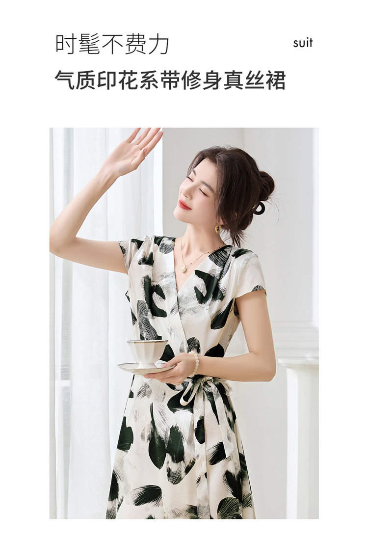 丁摩时尚真丝连衣裙新款夏季V领系带印花收腰桑蚕丝碎花长裙AL25038