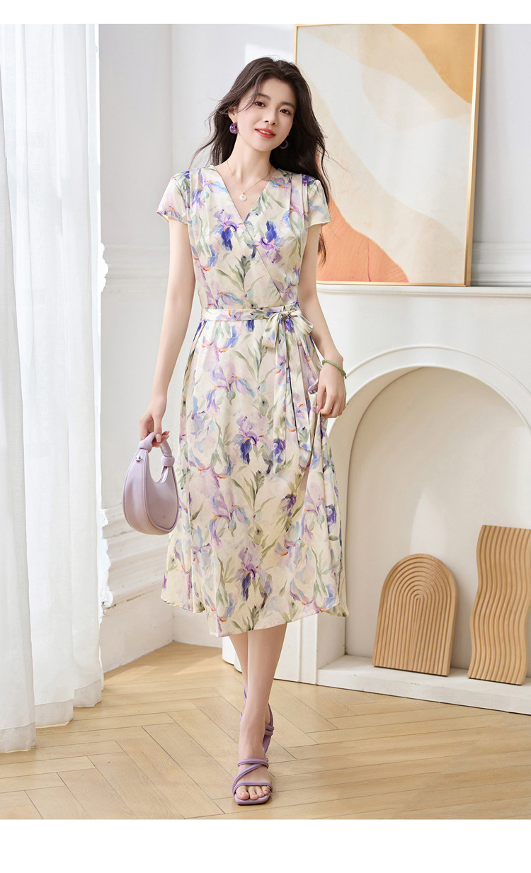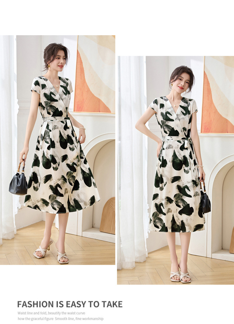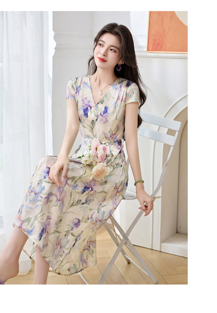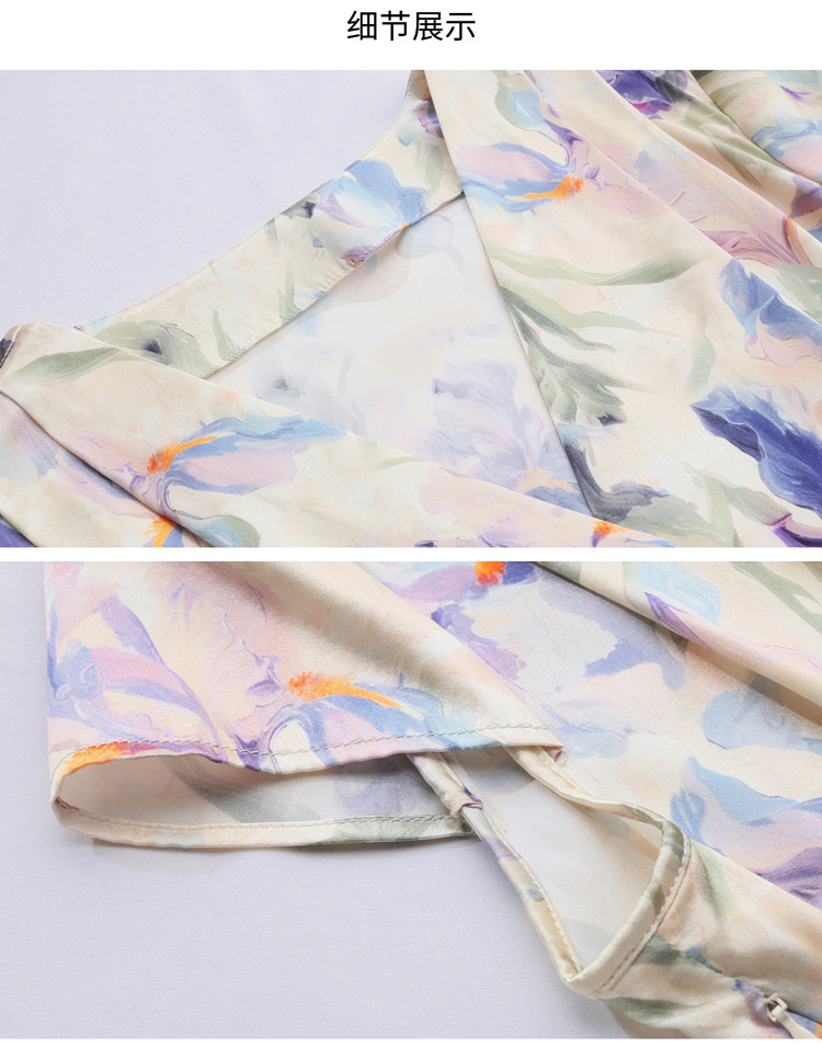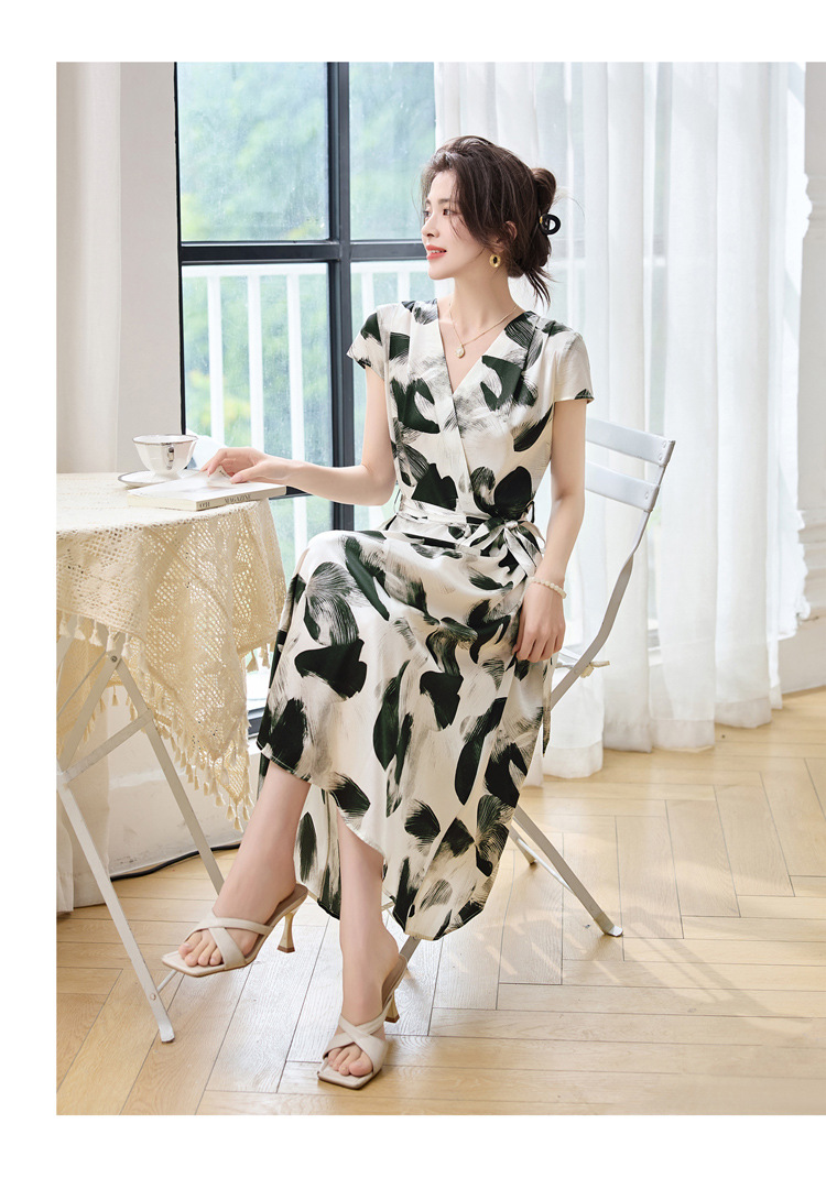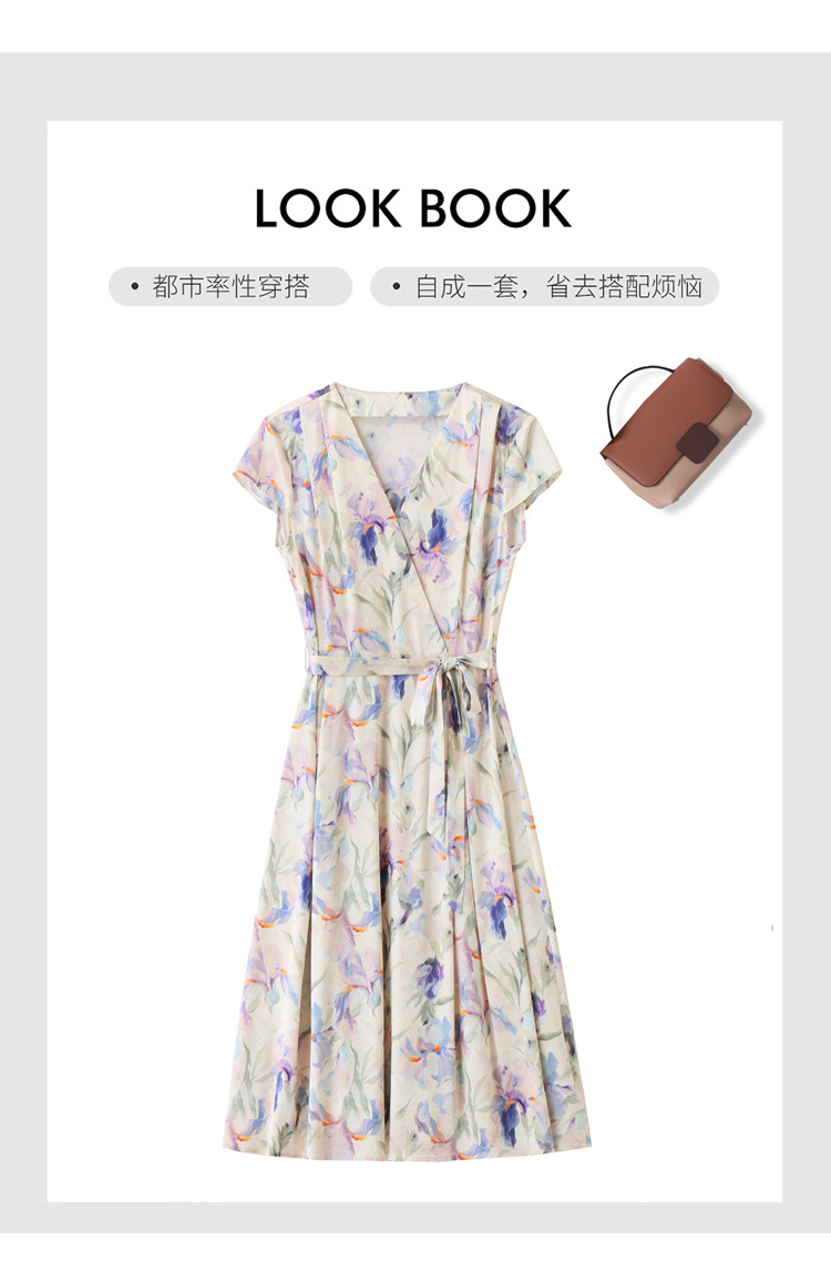 丁摩时尚真丝连衣裙新款夏季V领系带印花收腰桑蚕丝碎花长裙AL25038