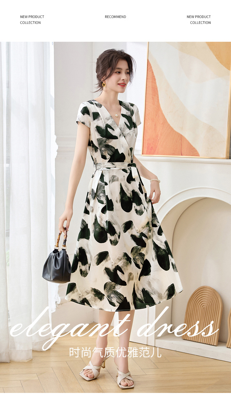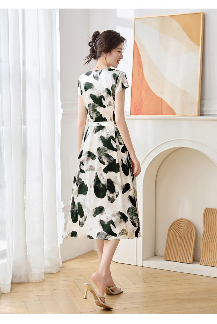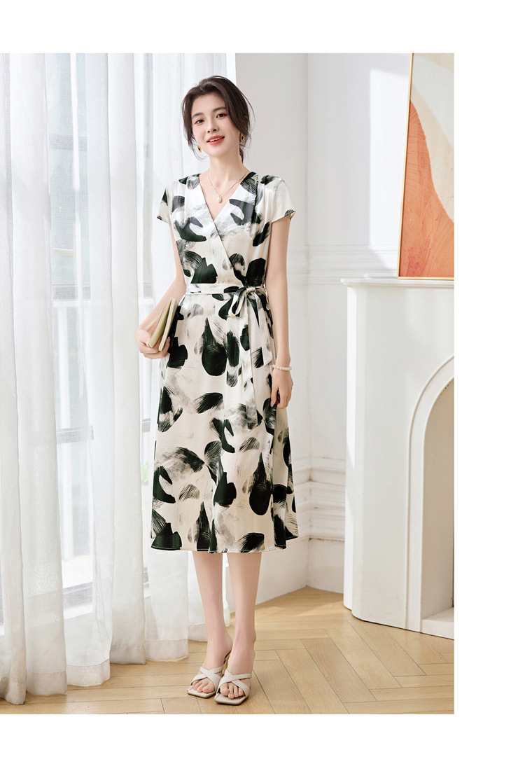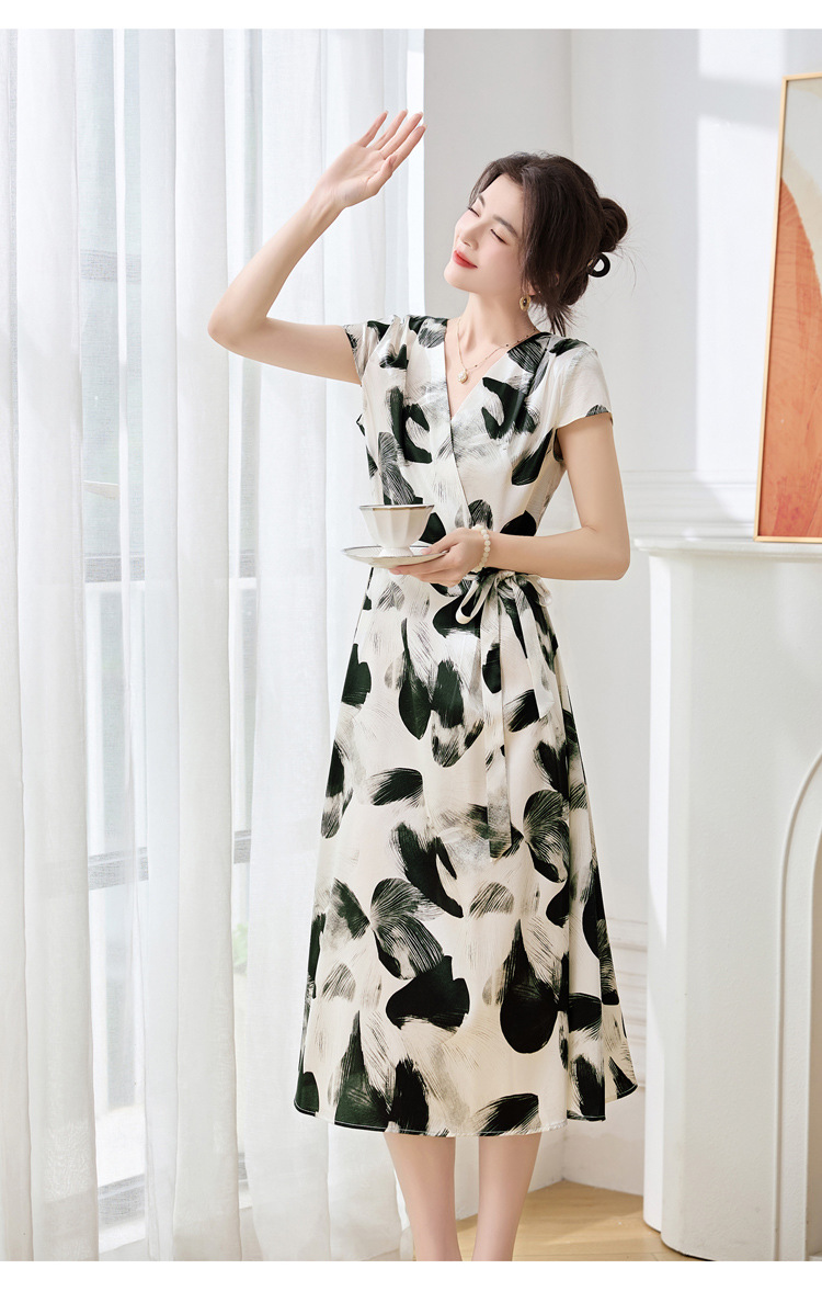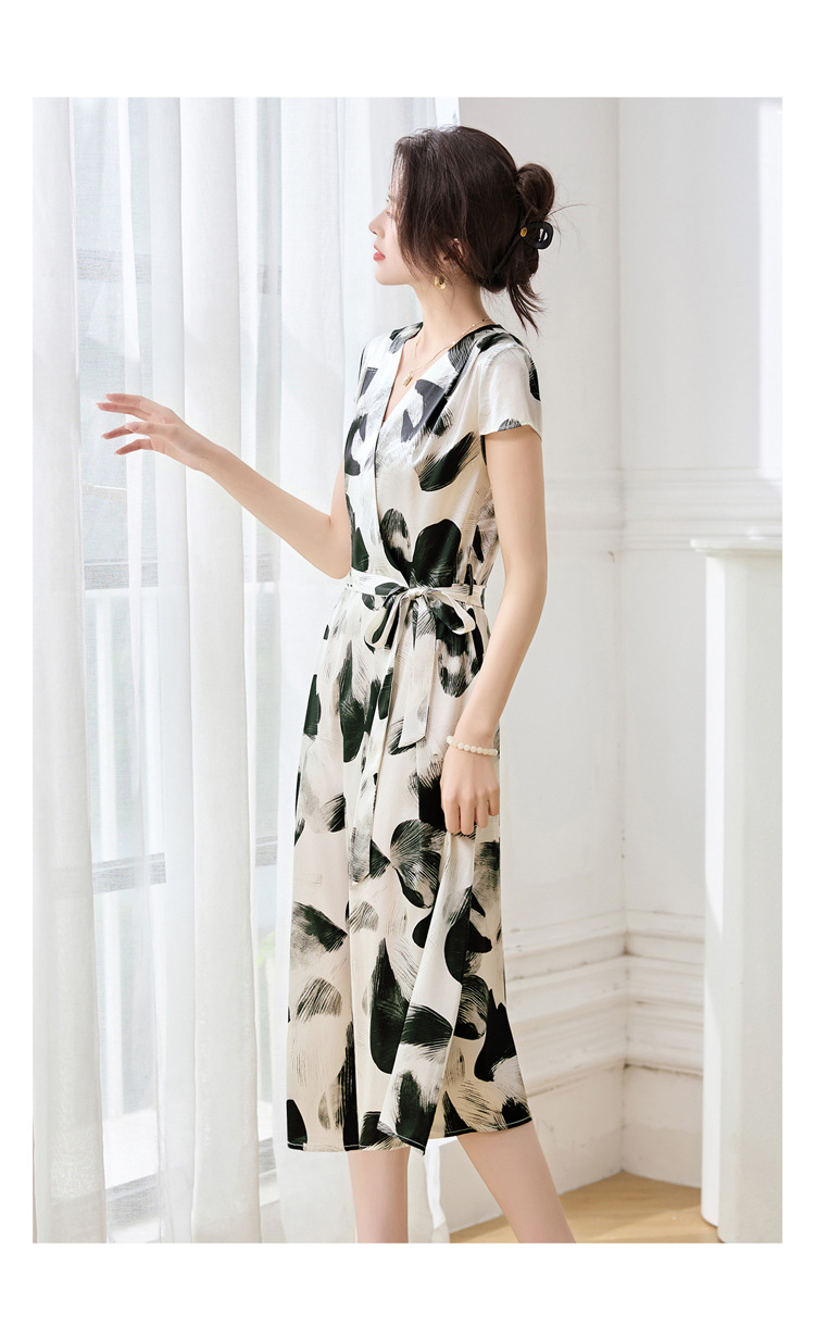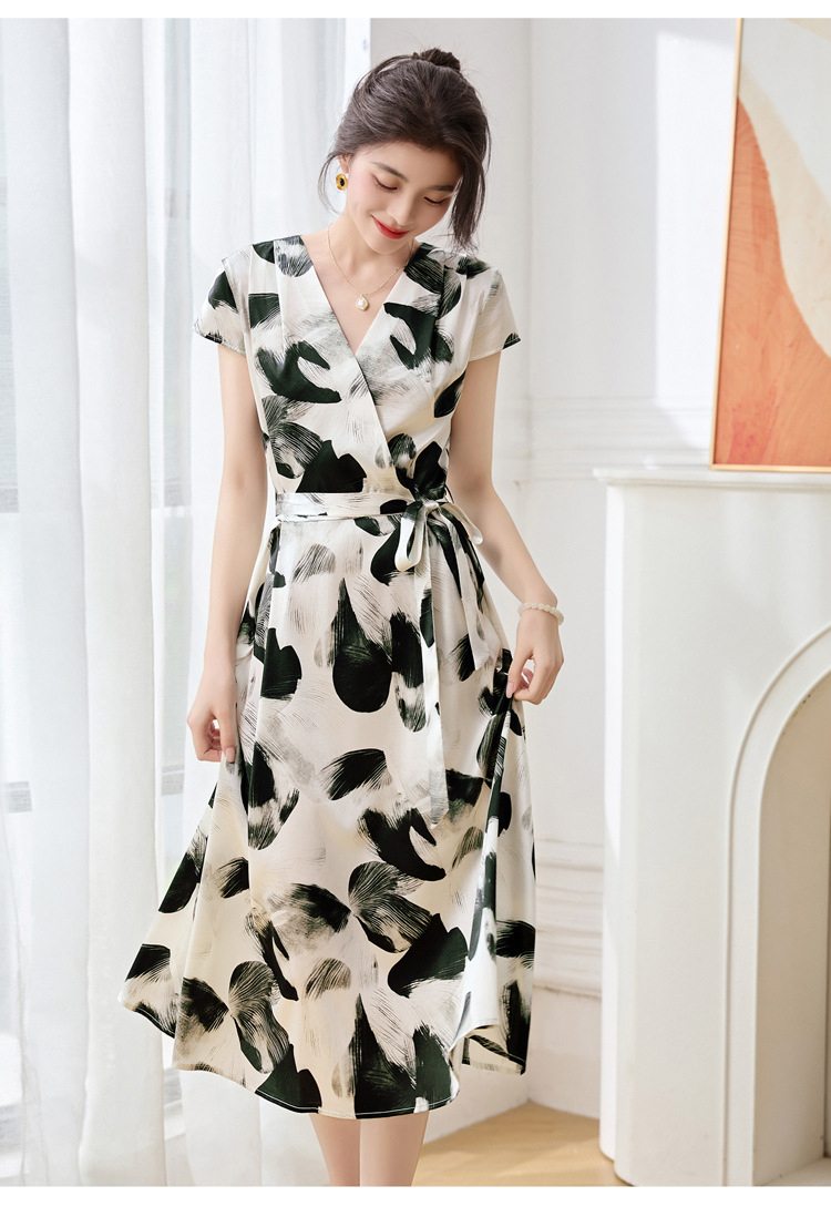 丁摩时尚真丝连衣裙新款夏季V领系带印花收腰桑蚕丝碎花长裙AL25038