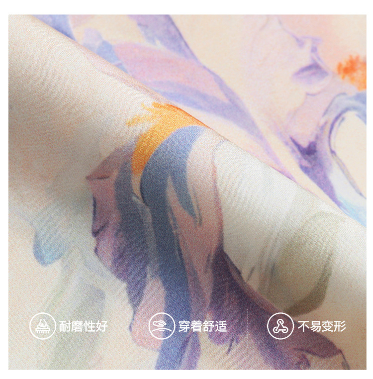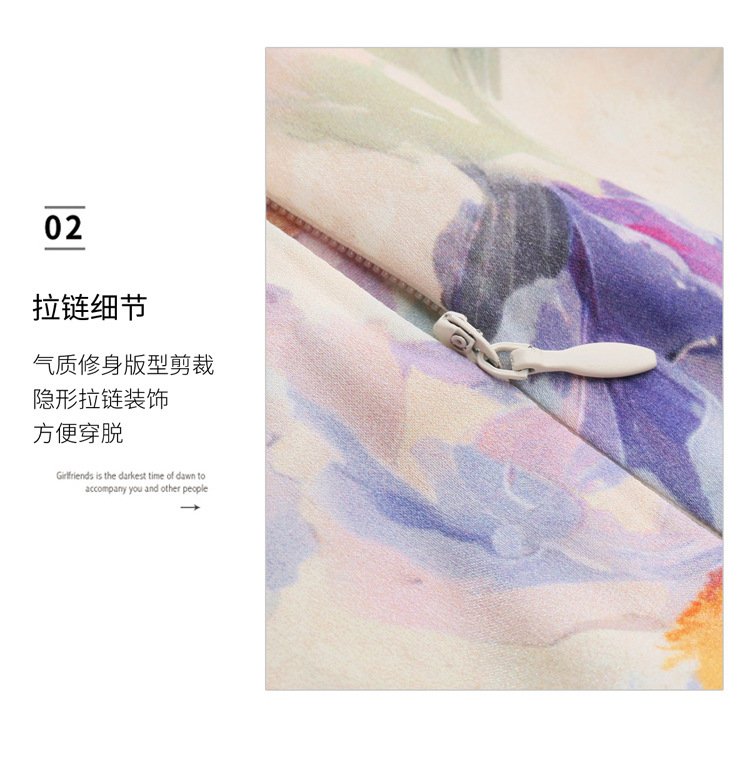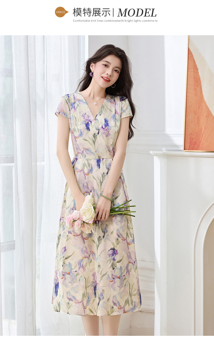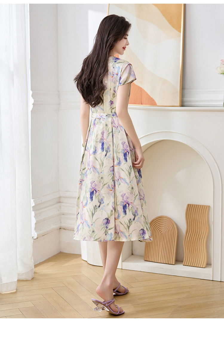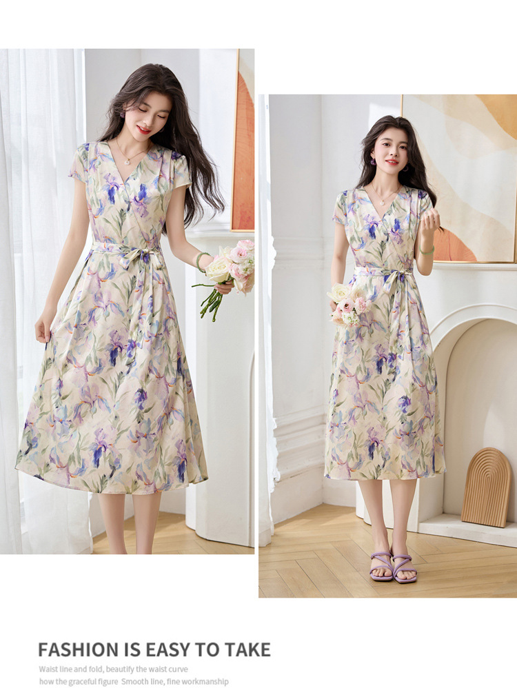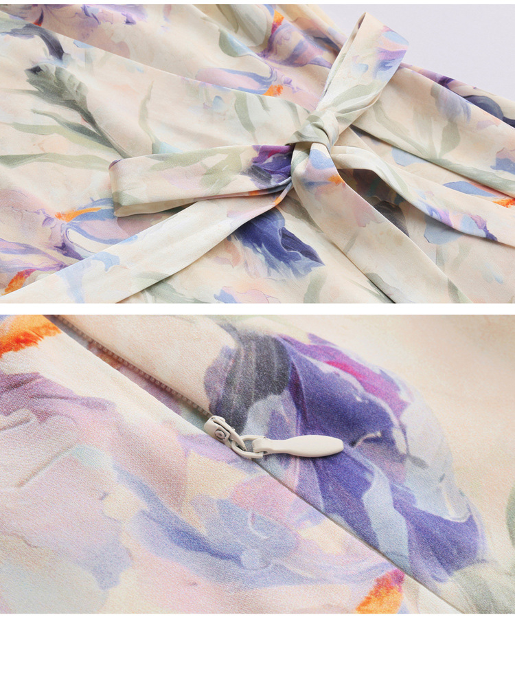 丁摩时尚真丝连衣裙新款夏季V领系带印花收腰桑蚕丝碎花长裙AL25038