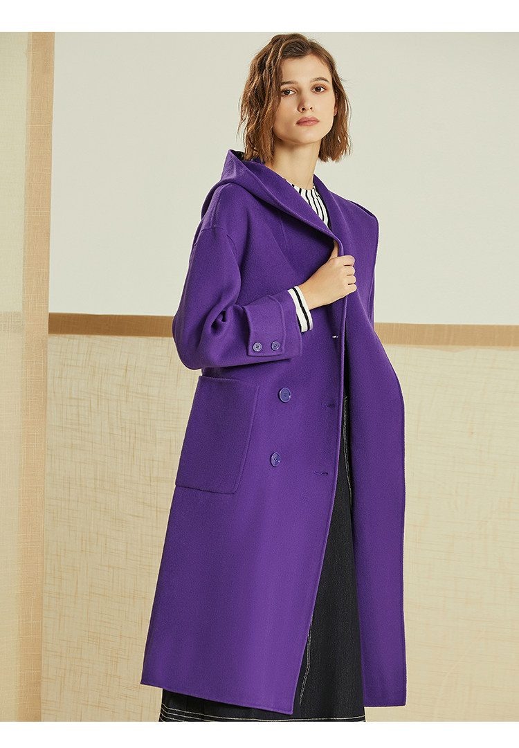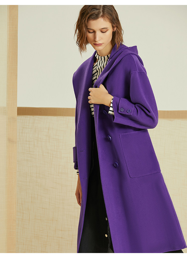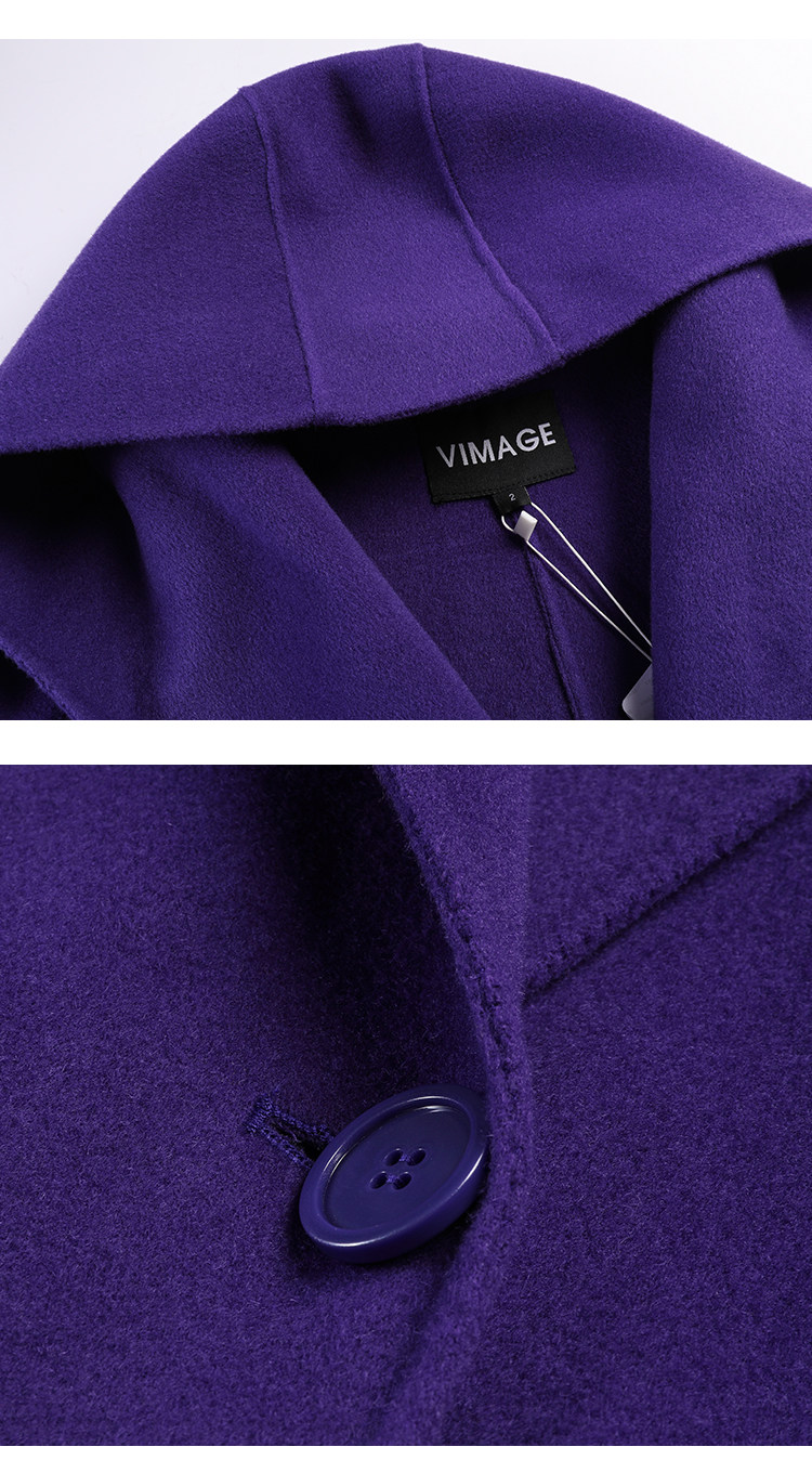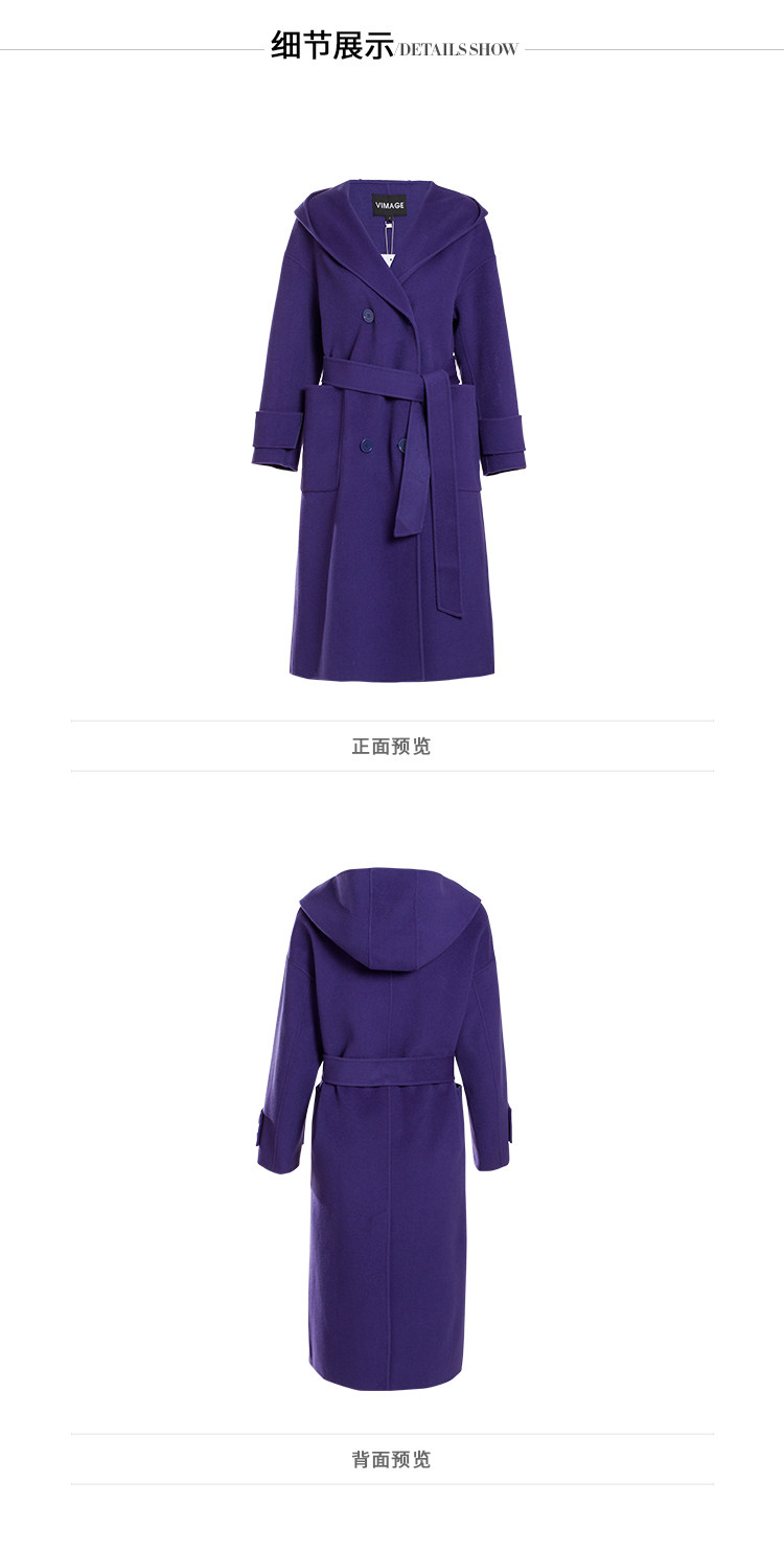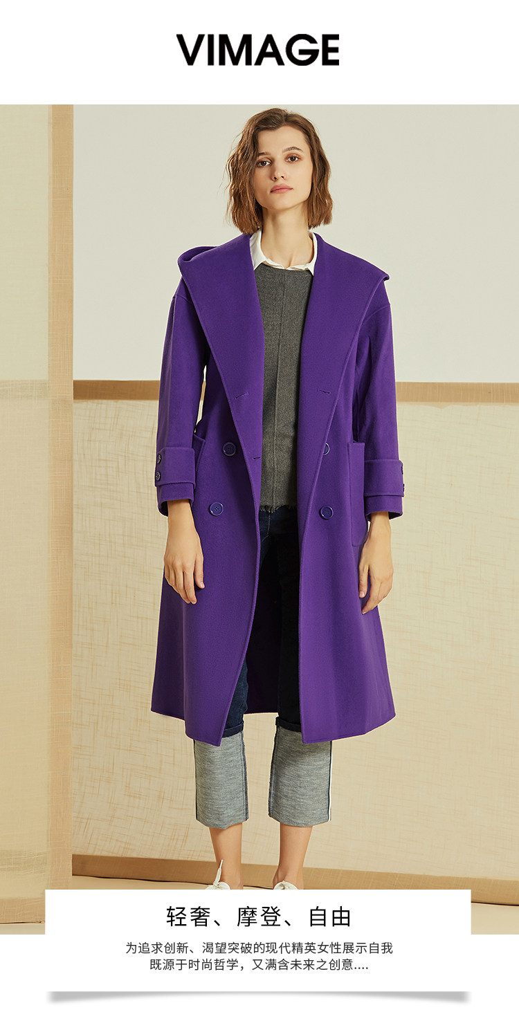 VIMAGE纬漫纪冬季双排扣英伦风连帽羊毛呢大衣中长款女V1214810