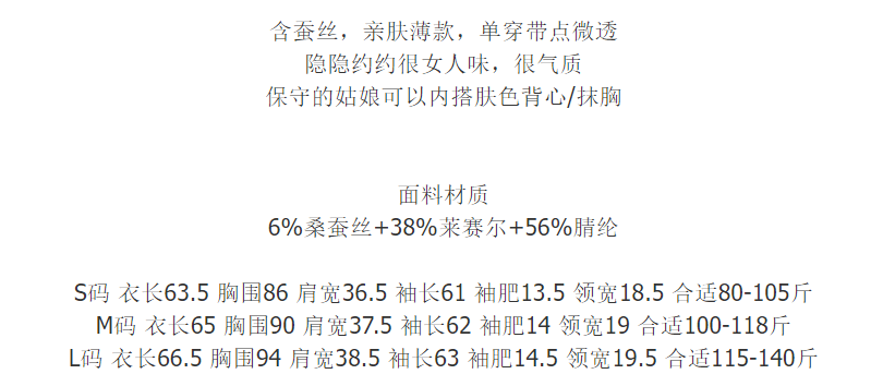 面料:6%桑蚕丝+38%莱赛尔+56%腈纶