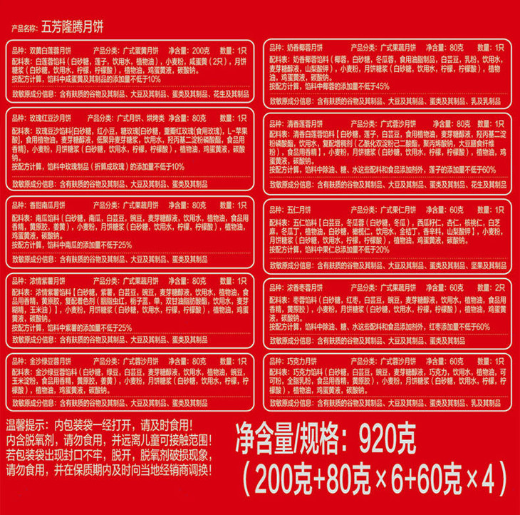 五芳斋【11饼10味920g】五芳隆腾广式月饼礼盒 蛋黄莲蓉豆沙五仁多口味广式中秋送礼