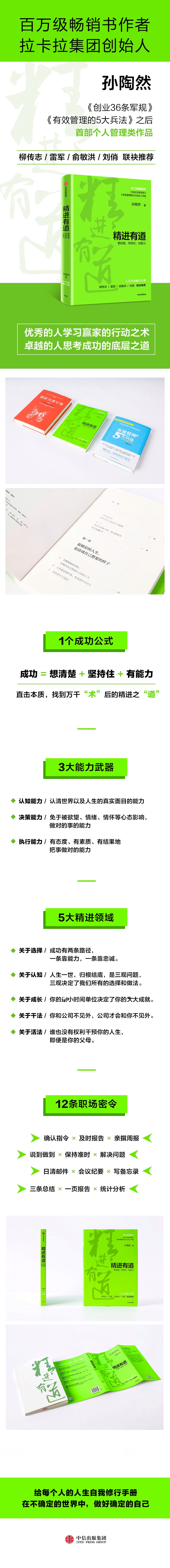 《精进有道:想清楚,坚持住,有能力》是百万册畅销书作者,中国知名科学家,拉卡拉集团董事长孙陶然认为,不论世界如何变化,成功的人生逻辑逻辑都是不变的:想清楚,坚持住和有能力。而普通人和赢家能力的差异,往往体现在他在书中深度复盘自己求学,创业,管理和生活经验,从选择,认知,成长,干法和活法五大维度来看,认知,决策和执行这三项“根能力”的修炼上。亲既精进之道,帮助读者提升个人核心竞争力,以应对这个不确定的世界。书中既有做人做事的具体方法,又有跃迁精进的逻辑,是每一位年轻人必备的人生自我修炼手册。