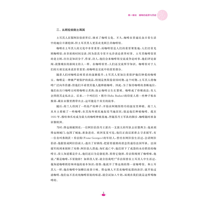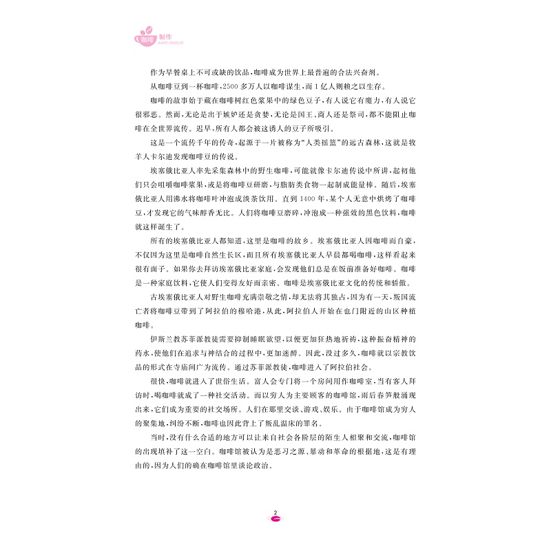 本教材通过介绍咖啡起源与历史、咖啡馆筹建与经营、咖啡豆烘焙与研磨、意式和单品咖啡制作、咖啡礼仪及点单技巧以及咖啡馆文创设计等内容,旨在培养和提升学习者的咖啡制作技巧、咖啡文化知识以及职业素养。希望为咖啡爱好者及致力于成为咖啡师的学习者开启一扇步入咖啡文化殿堂的大门。修订版在第一版内容的基础上新增了咖啡行业的新型业态的相关内容,更贴近时代发展和潮流趋势。全书配套了相应的咖啡制作及教学视频,增加了实操性。