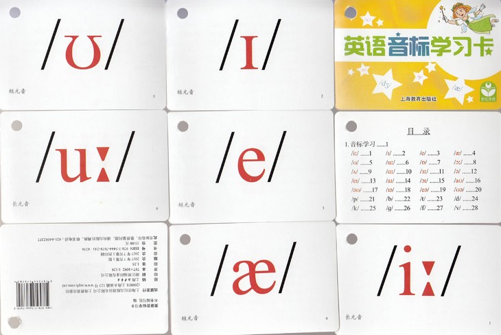 本书针对小学四、五年级。经过一至三年级的学习,学生已经初步掌握字母及字母组合的发音。此阶段适合帮助学生把这些发音以音标的形式进行总结和归纳。卡片的音标包括48个国际音标。每个音标根据字母或字母组合的实际情况安排1—2张卡片的学习内容。卡片的正面为音标、例词及图片;卡片的反面列出含此发音的核心单词