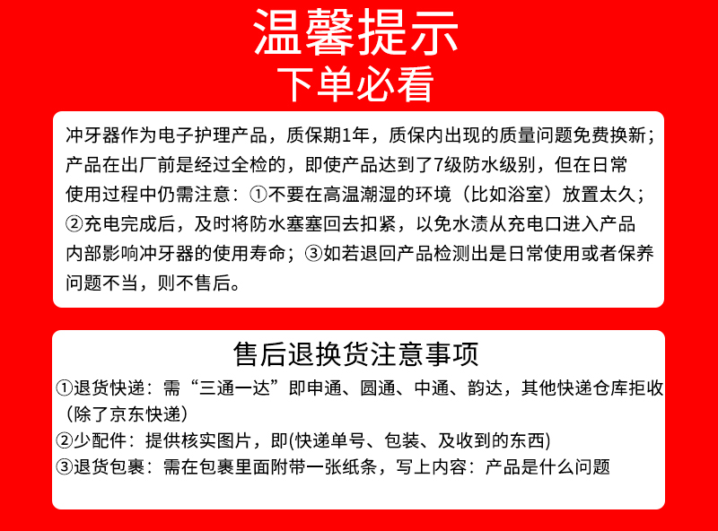 冲牙器属于私人用品,为了您和他人的安全健康考虑,拆封使用后不支持退换,不接受以个人不合适等各种理由无条件退货,感谢理解!