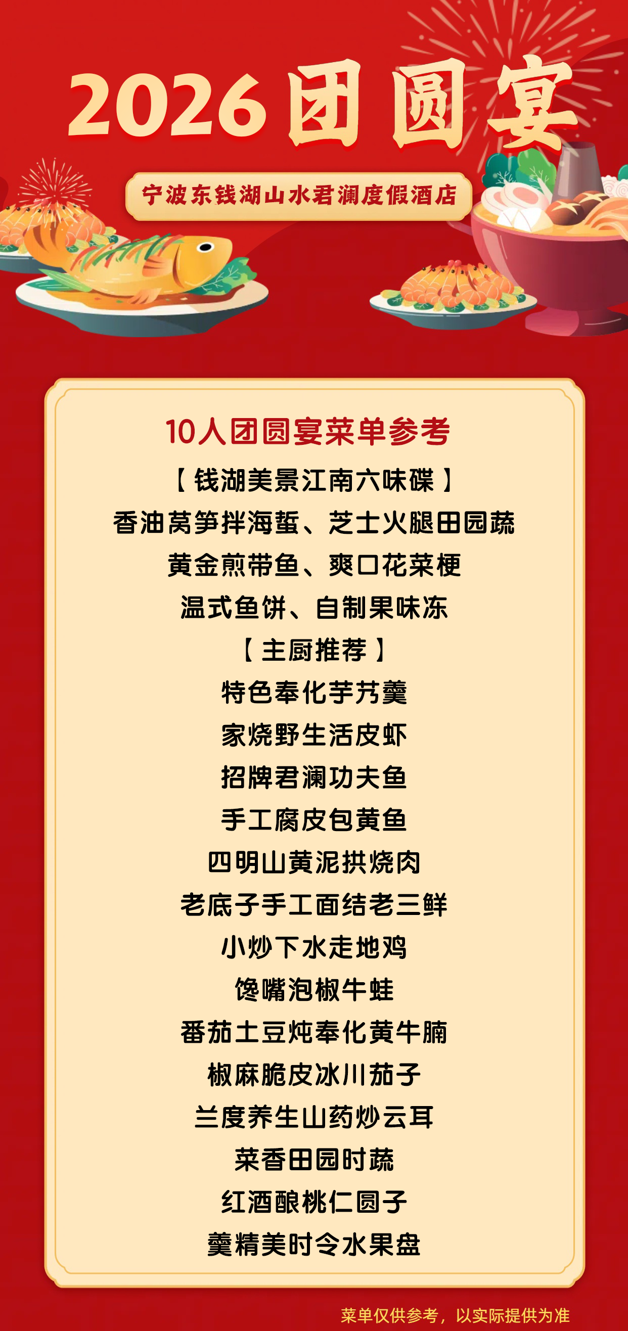 ★浙江年夜饭★¥1399起/人,连住2晚【宁波东钱湖山水君澜度假酒店】享田隐房+自助早餐+10人大年夜桌餐+10人年初一团圆宴+温泉票,满10人赠送棋牌室!有效期2026年2月16日专享