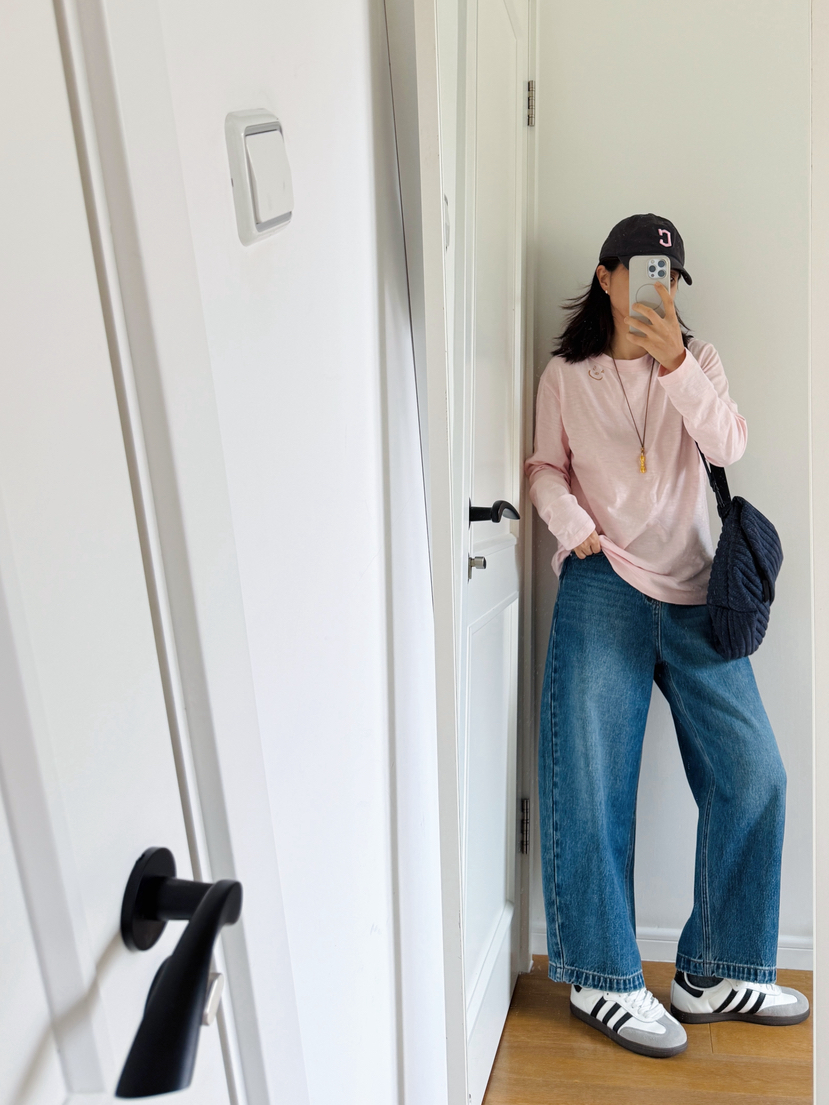 白色和粉色在面料阶段,先进行水洗处理,水洗工艺让竹节棉面料更加柔软,原本纤维间的硬挺感被去除,使得面料提前适应穿着过程中的摩擦,手感更加细腻亲肤。同时,水洗也让面料的色泽变得柔和自然,竹节纹理更加清晰,呈现出一种复古的质感。水洗蓝成衣制作完成后,进行了成衣水洗。通过专业的成衣水洗工序,进一步塑造了牛仔蓝的独特风格。经过水洗过程中,达到最终的颜色和风格,如同经过岁月沉淀,形成独一无二的陈旧感与复古氛围。