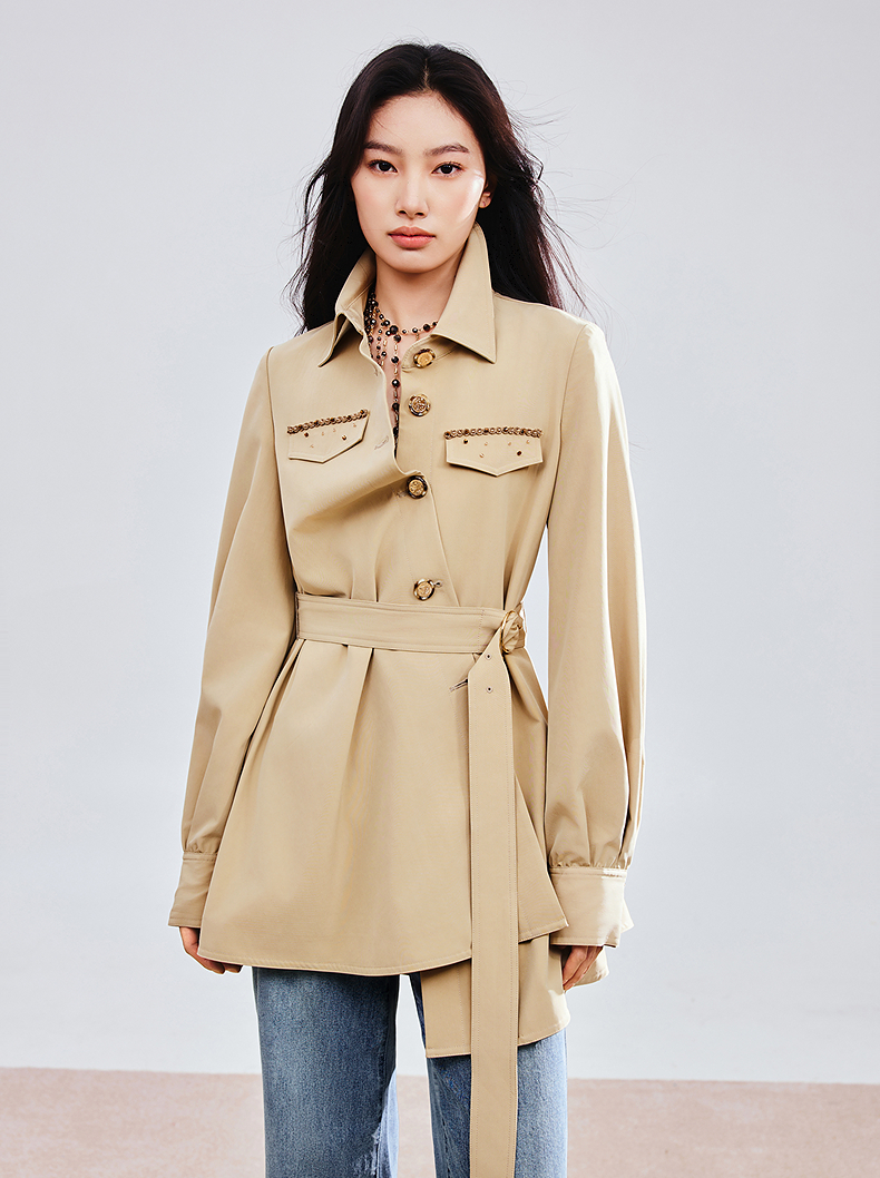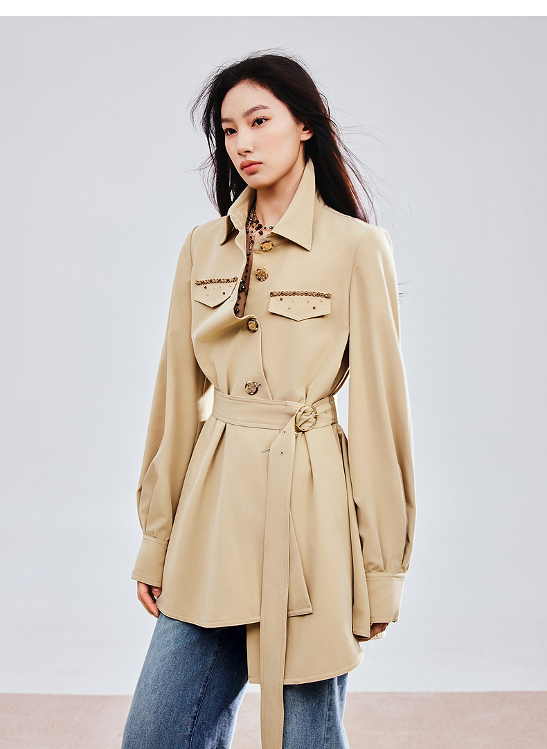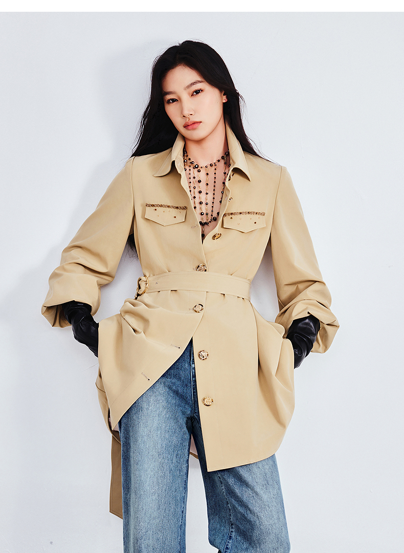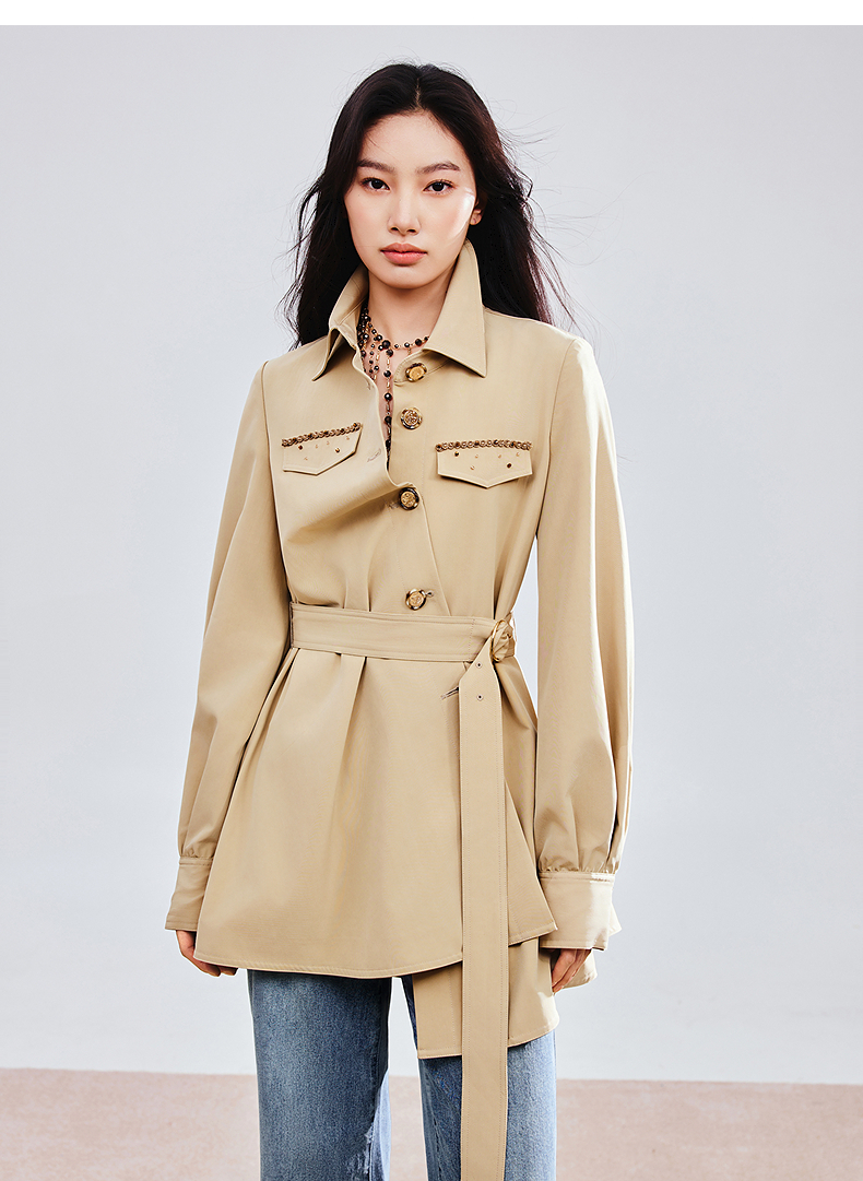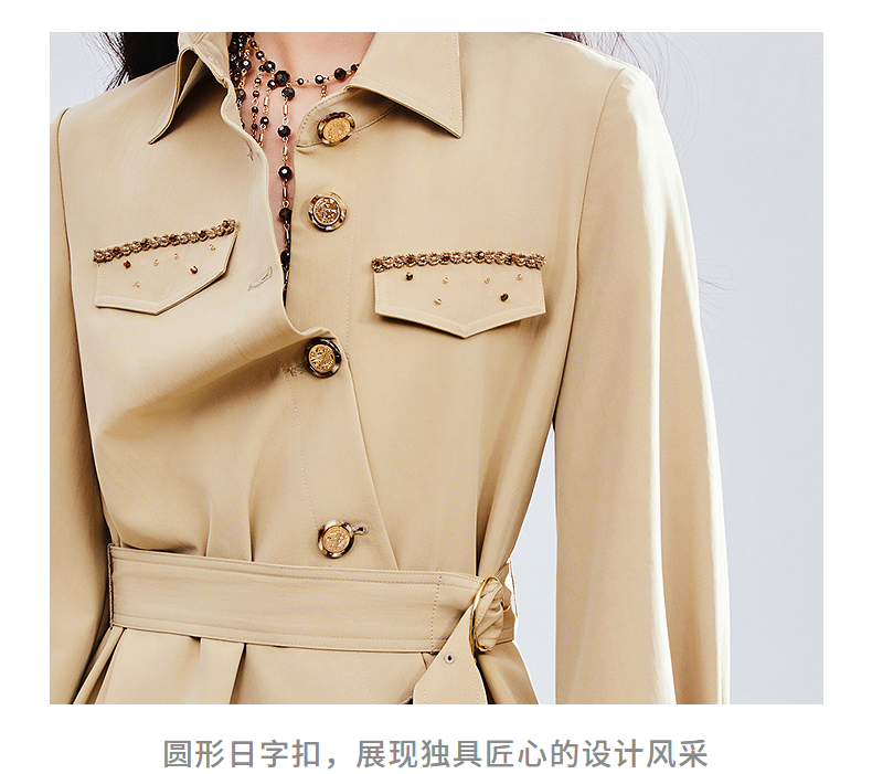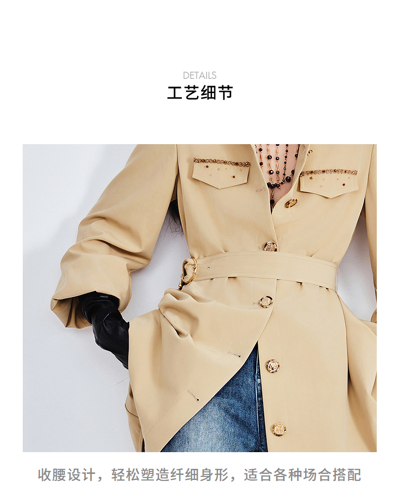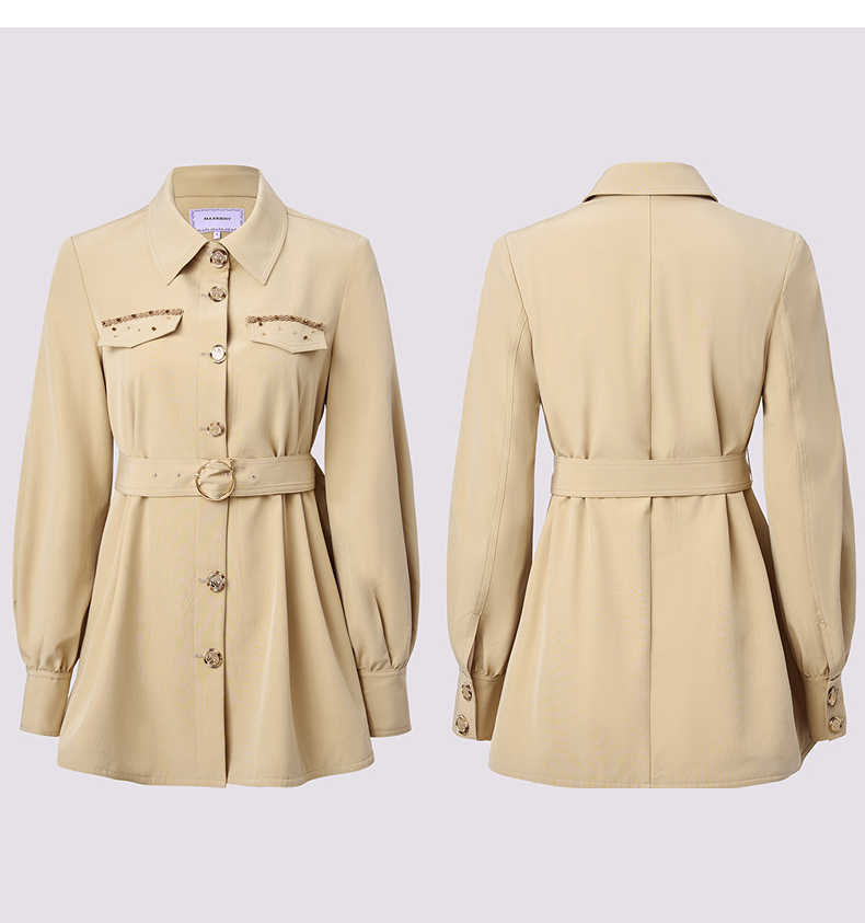 MAXRIENY精致优雅感风衣女浅春系穿搭圆形日字扣率性风收腰外套(货号:MS85WB751)