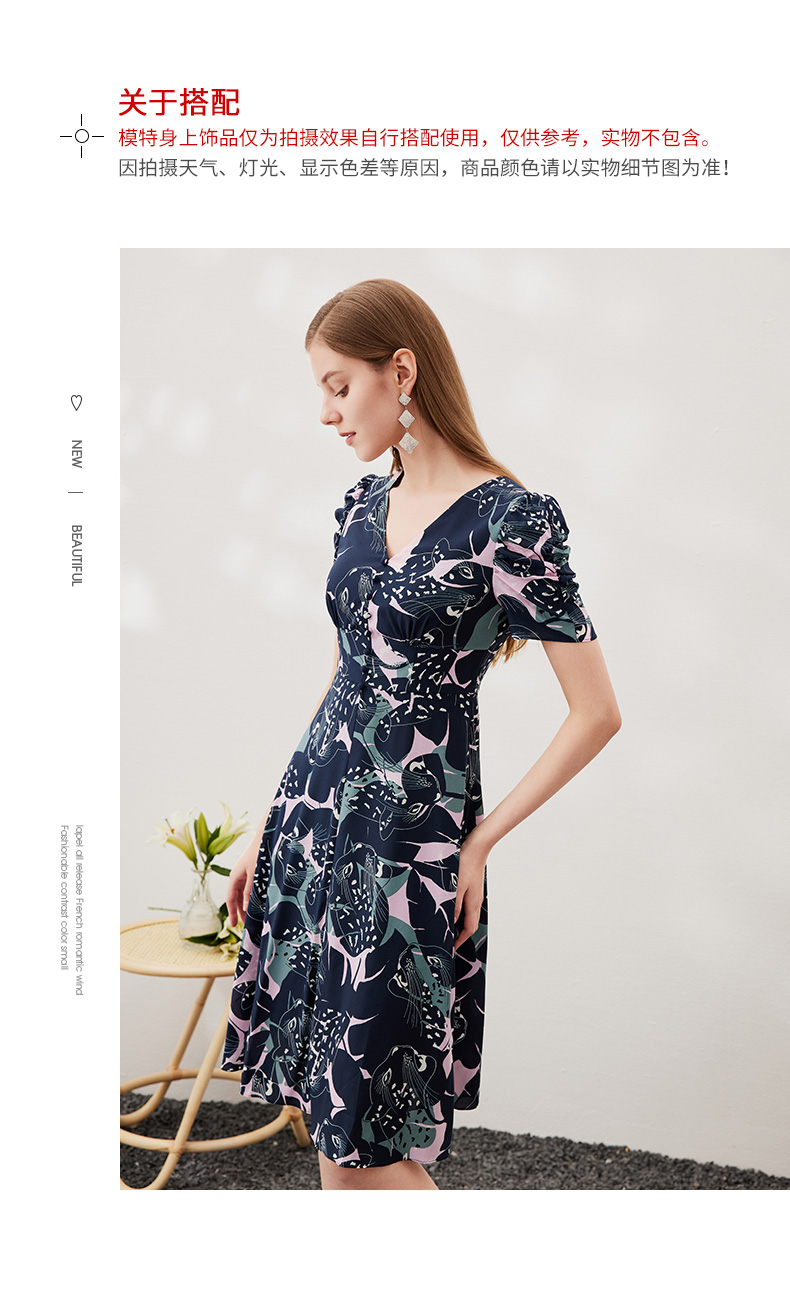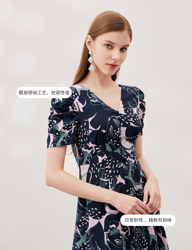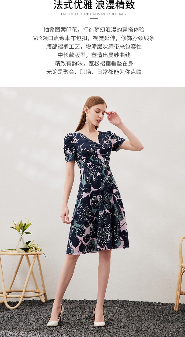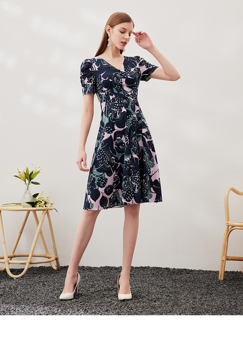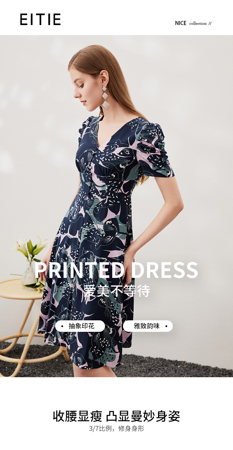 EITIE爱特爱夏款新品时尚V领显瘦高腰舒适印花连衣裙7007769
