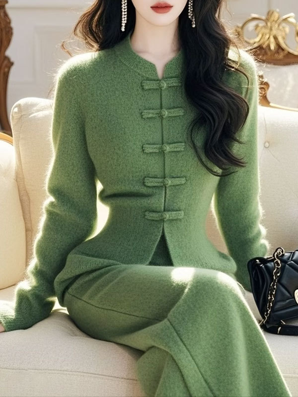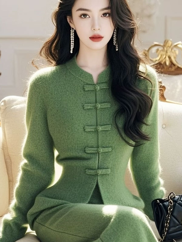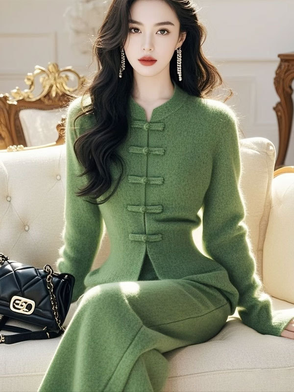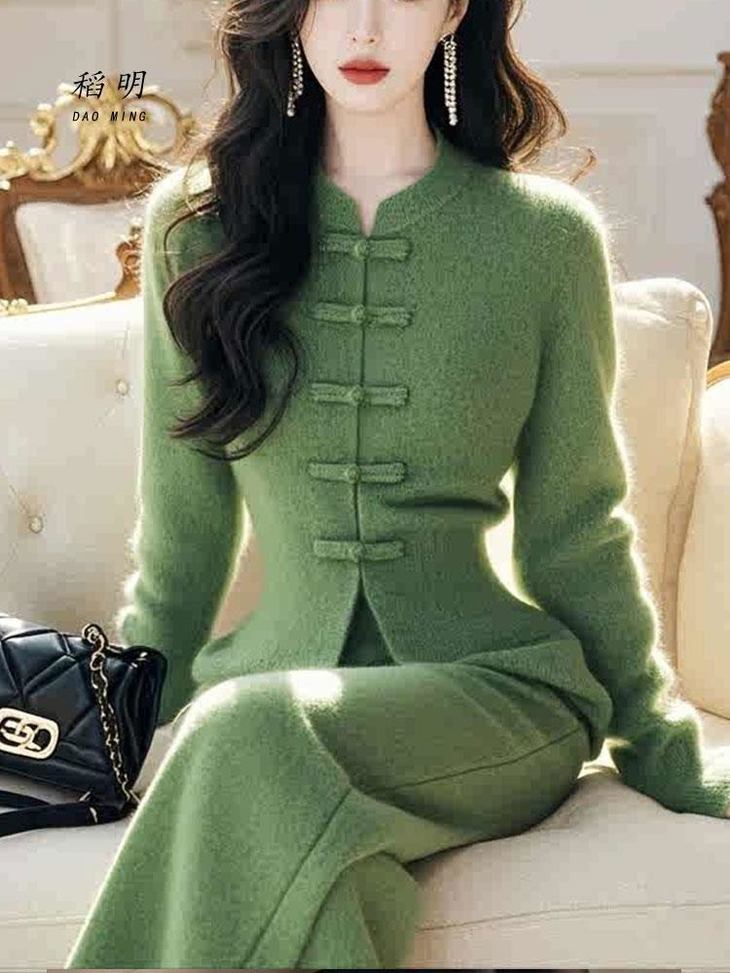 秋冬高级感小香风新中式国风盘扣毛衣裤子套装