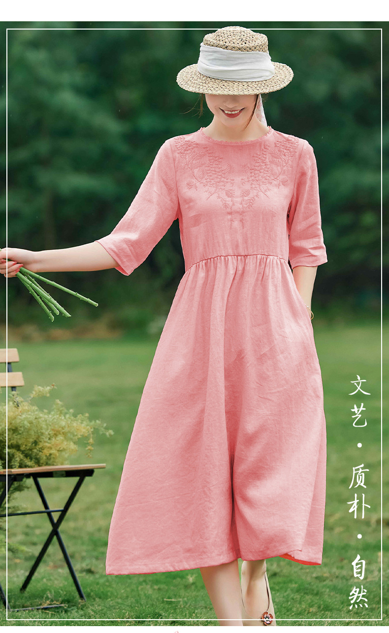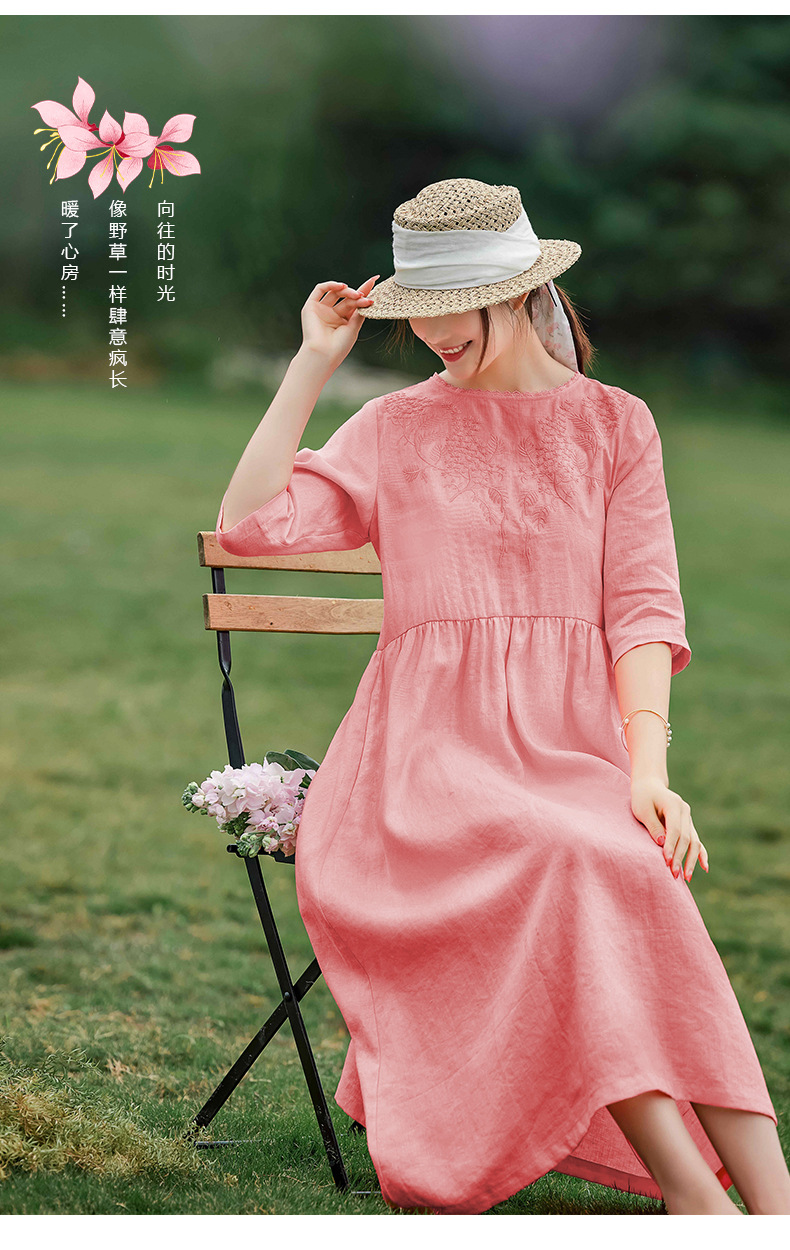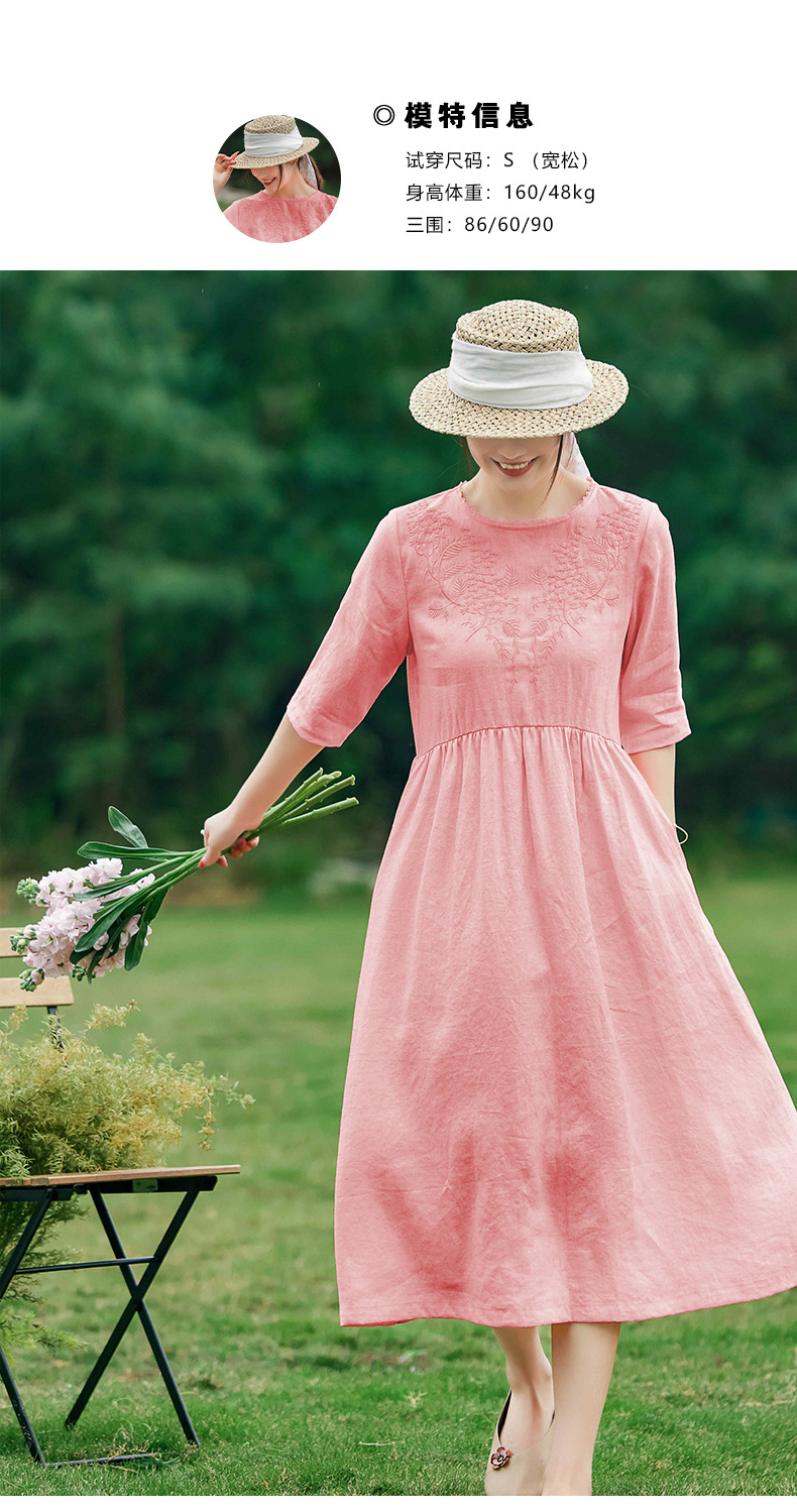 HM-C004春季新款 原创设计亚麻刺绣连衣裙仙女纯色高腰圆领长裙