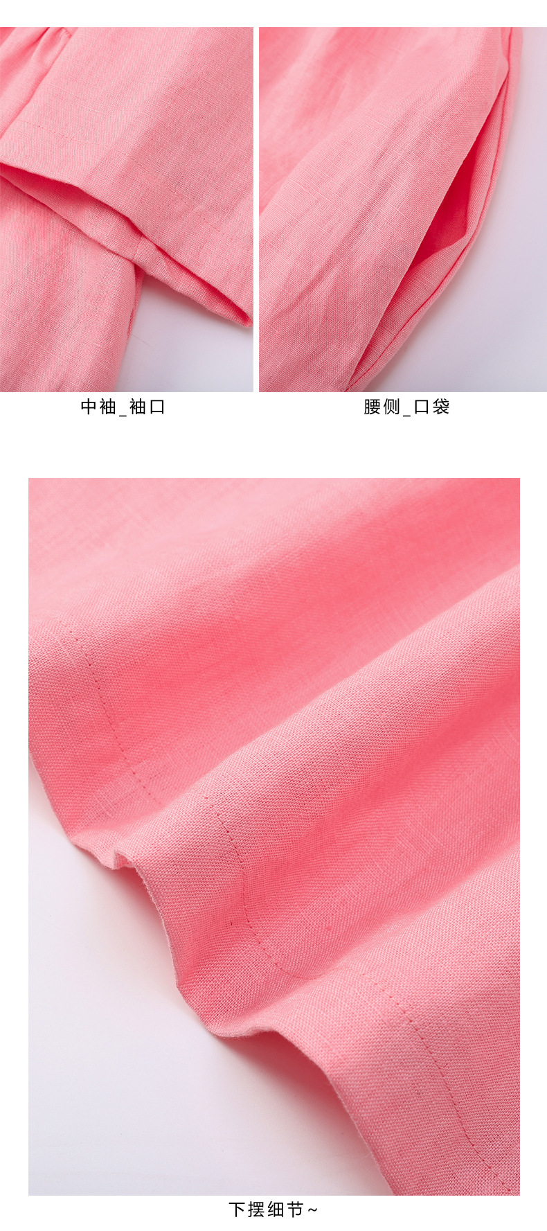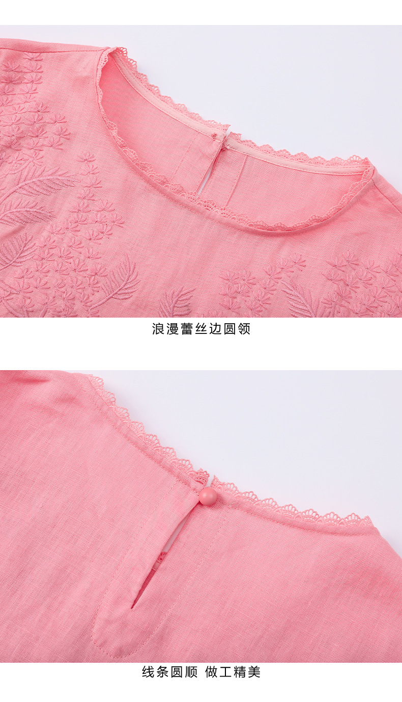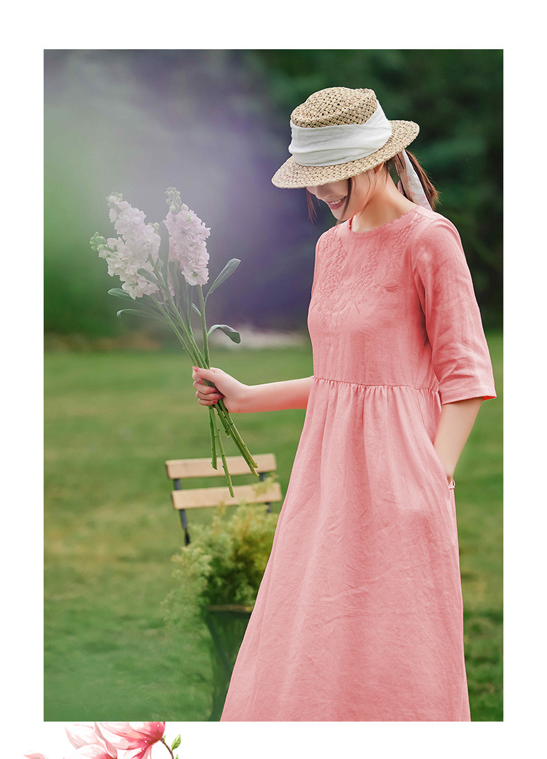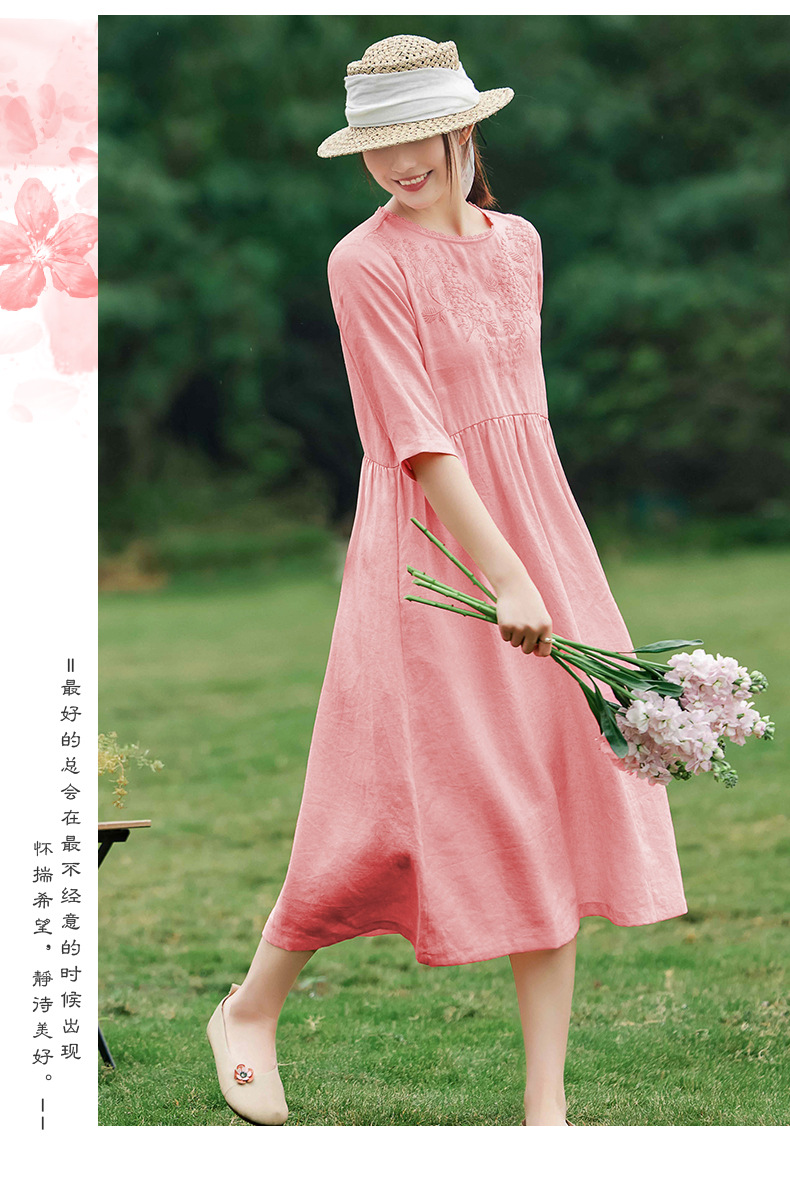 HM-C004春季新款 原创设计亚麻刺绣连衣裙仙女纯色高腰圆领长裙
