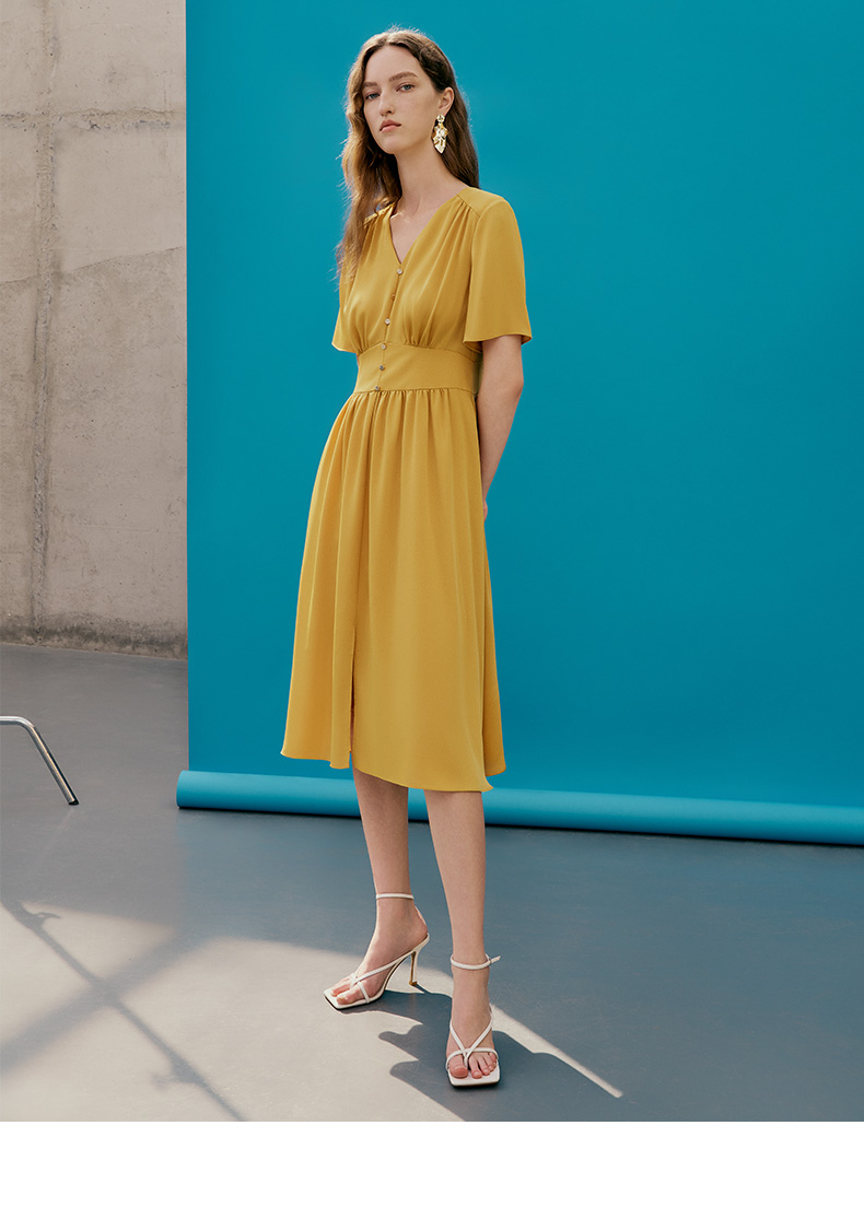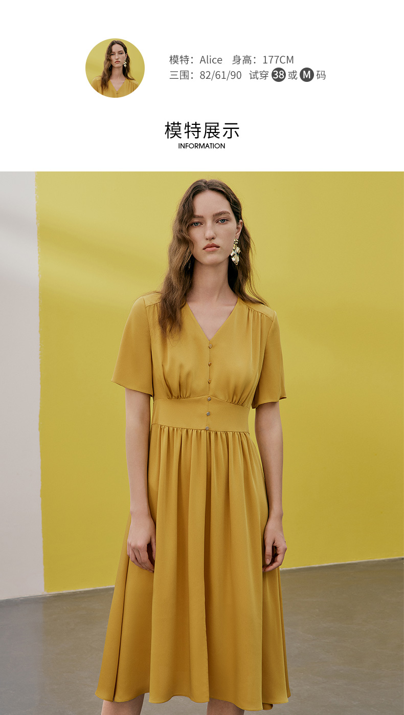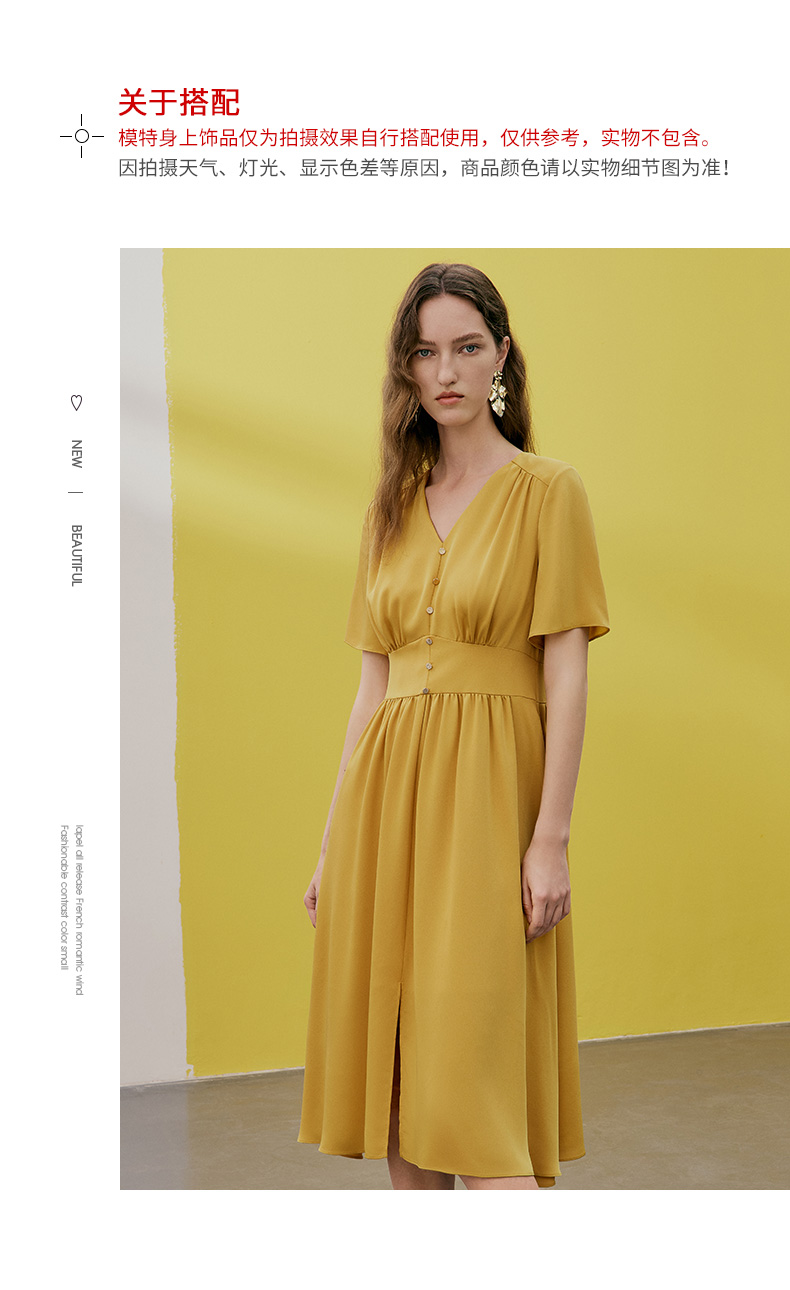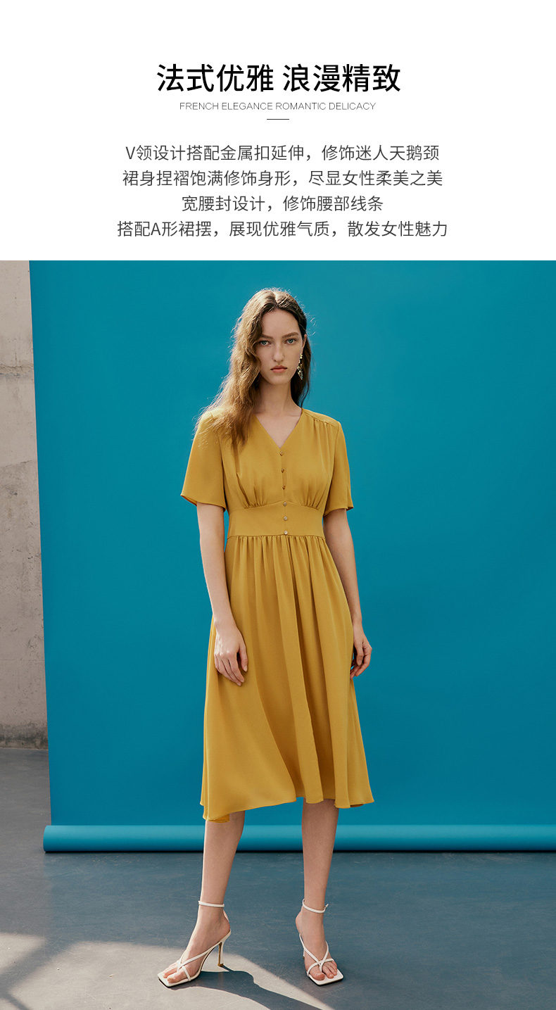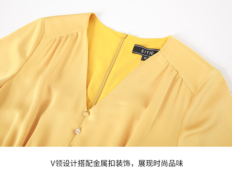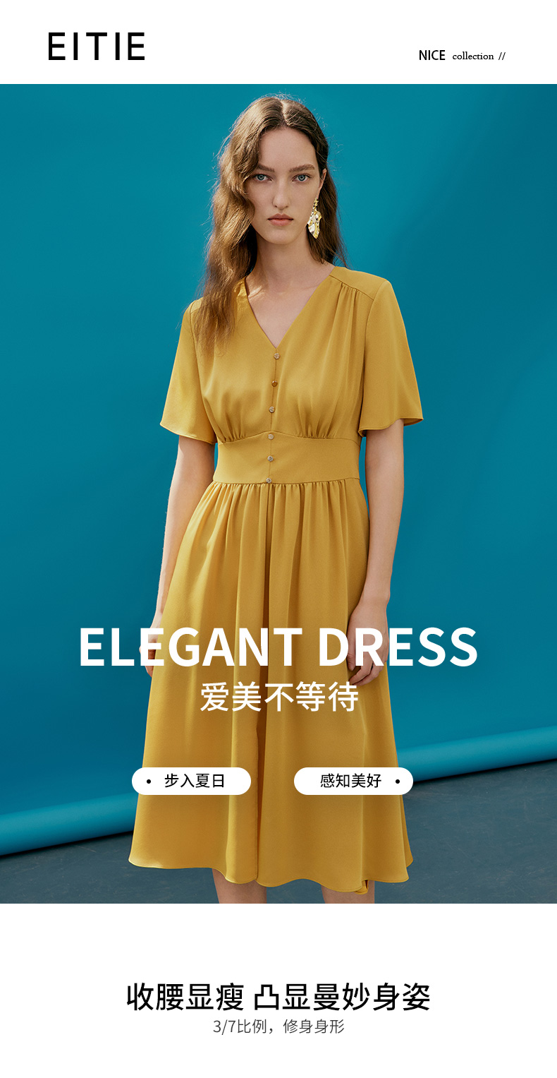 EITIE爱特爱夏季新款V领显瘦纯色百搭洋气收腰连衣裙7407146