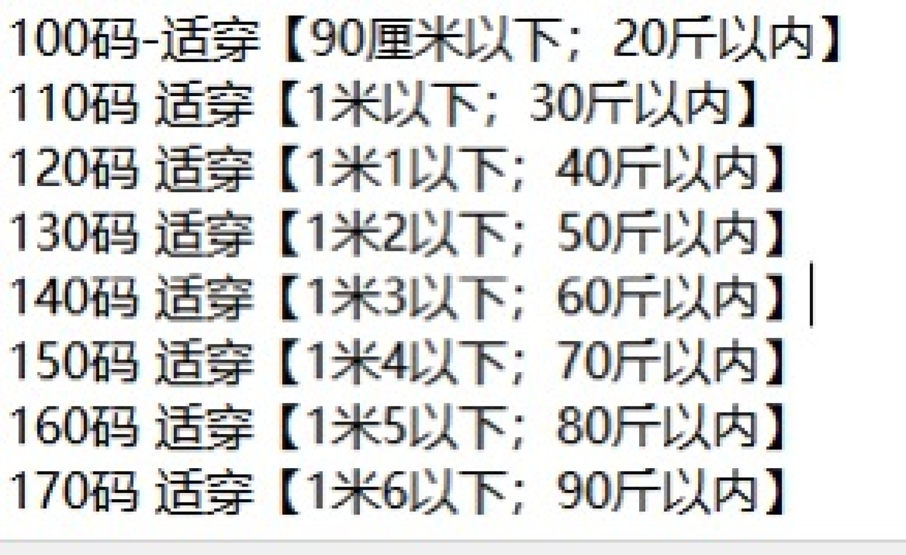 【尺码】100码,110码,120码,130码,140码,150码,160码,170码