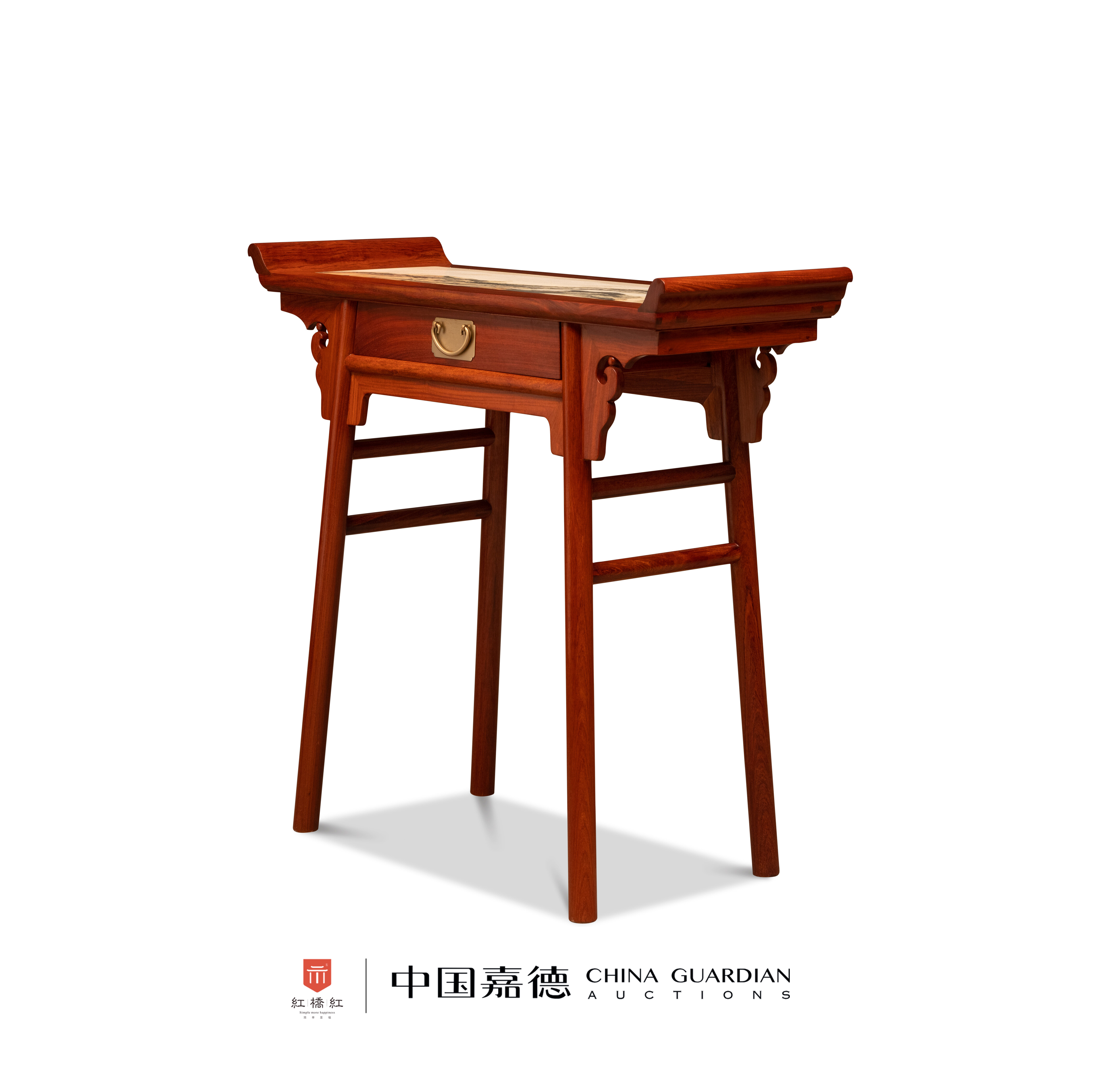 这是一件单联翘头案,即有抽屉一具,有翘头。橱面以格角榫攒边平镶大理石面心,纹理美观生动,如在案上观看水墨山水卷轴。面下抽屉脸安委角面叶,弧形吊牌拉手,抽屉架下安刀牙板,沿边不起线,朴质率真。整器简约,没有太多雕饰,仅在案面下安锼挖云文的牙子。四足圆材,侧脚显著,两侧安双梯枨,起到加固作用。