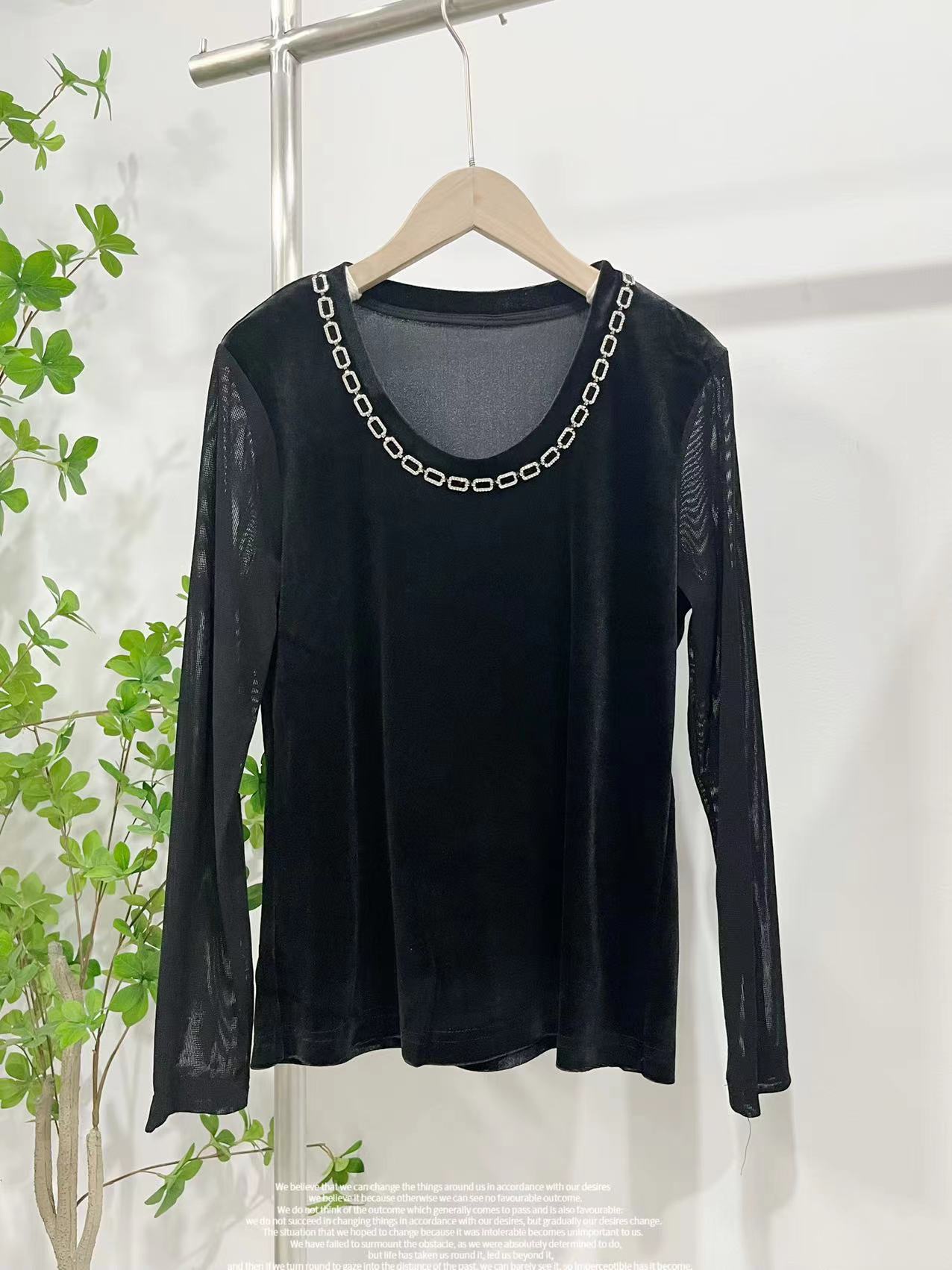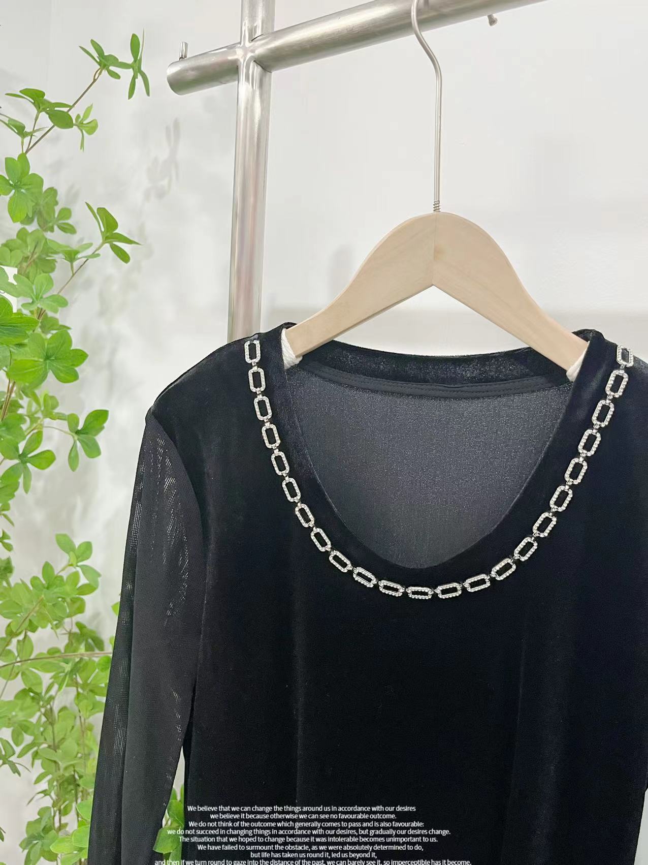 元旦福利 8858 金丝绒圆领链条钻小衫上衣-喜出