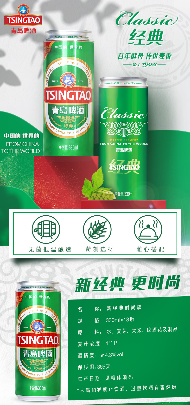 青岛啤酒经典11度330ml*18纤体罐/箱(电商尊享) 商品图2