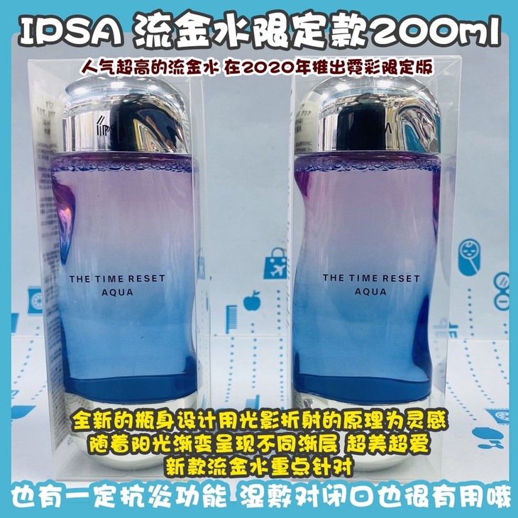IPSA 流金水限定款200ml👍人气超高的流金水🔥,在2020年推出霓彩限定版😍,全新的瓶身设计用光影折射的原理为灵感🌟,随着阳光渐变呈现不同渐层,超美超爱!新款流金水重点针对👉夏季皮肤由于紫外线和空调影响,皮肤容易干燥缺水而设计的。主打维稳的流金水,质地清爽🍃,基础保湿💦和治理毛孔的效果都极棒,也有一定抗炎功能,湿敷对闭口也很有用哦!