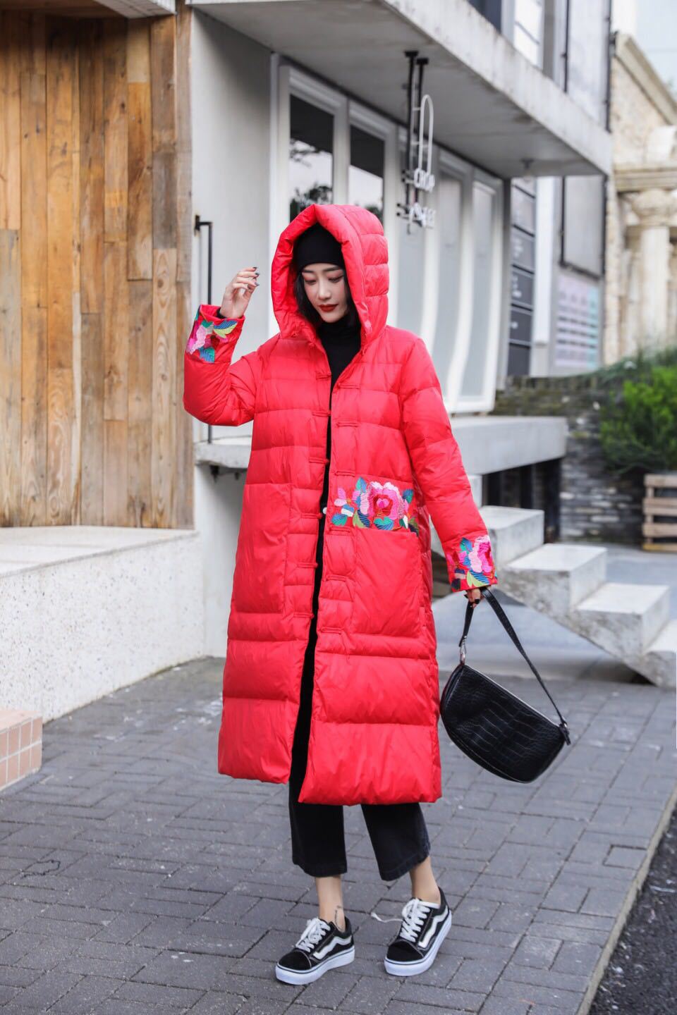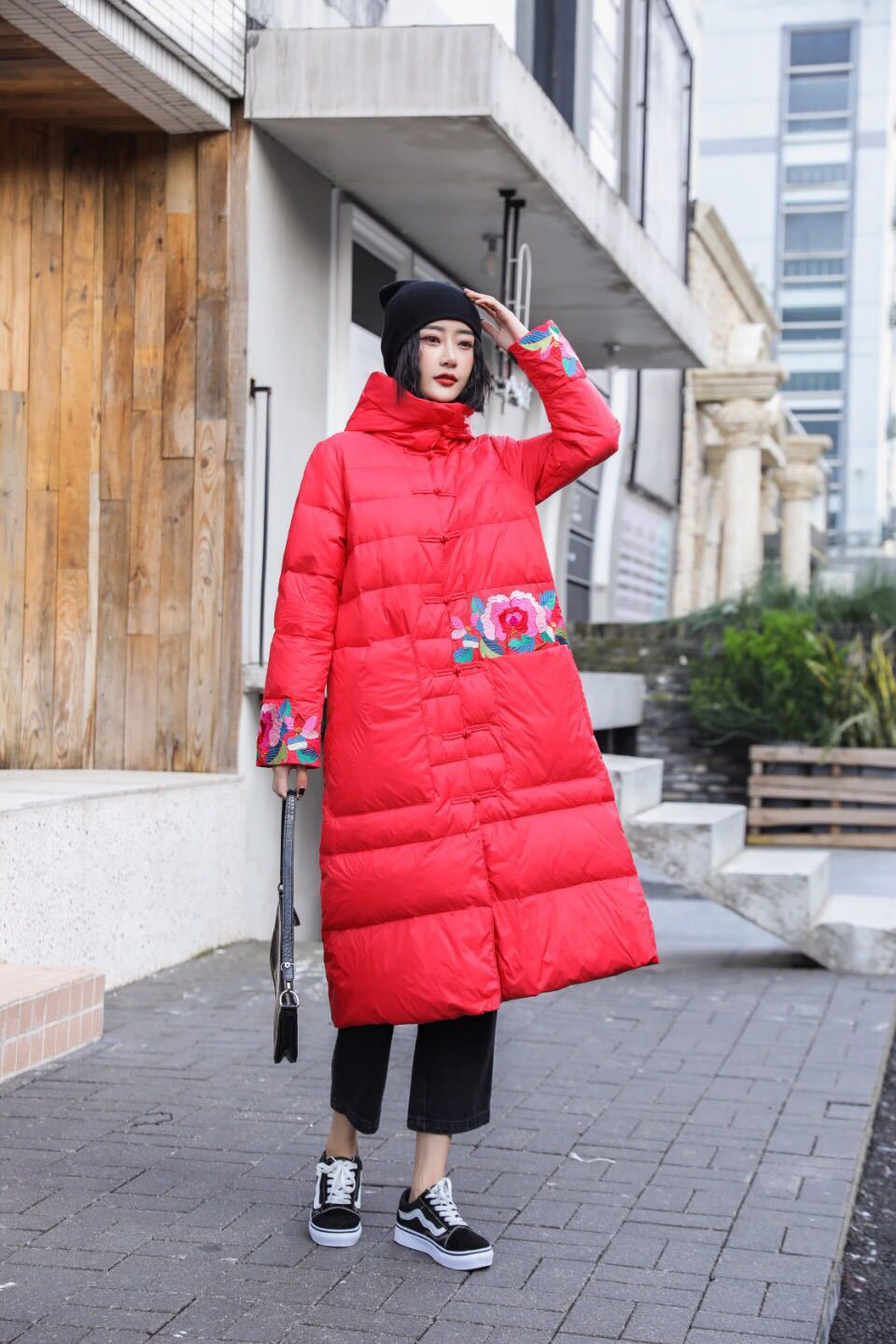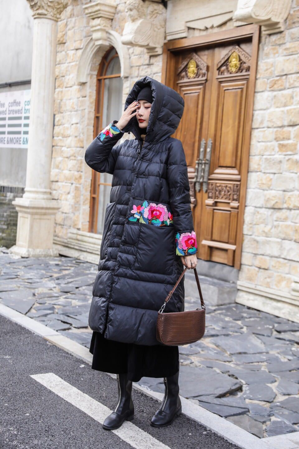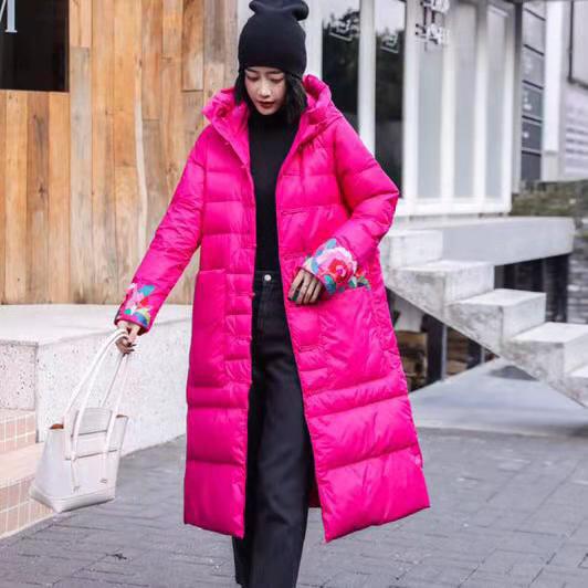 上海旗袍厂XJ-1911中国风冬季新款宽松大码百搭刺绣连帽羽绒服女长款过膝保暖外套