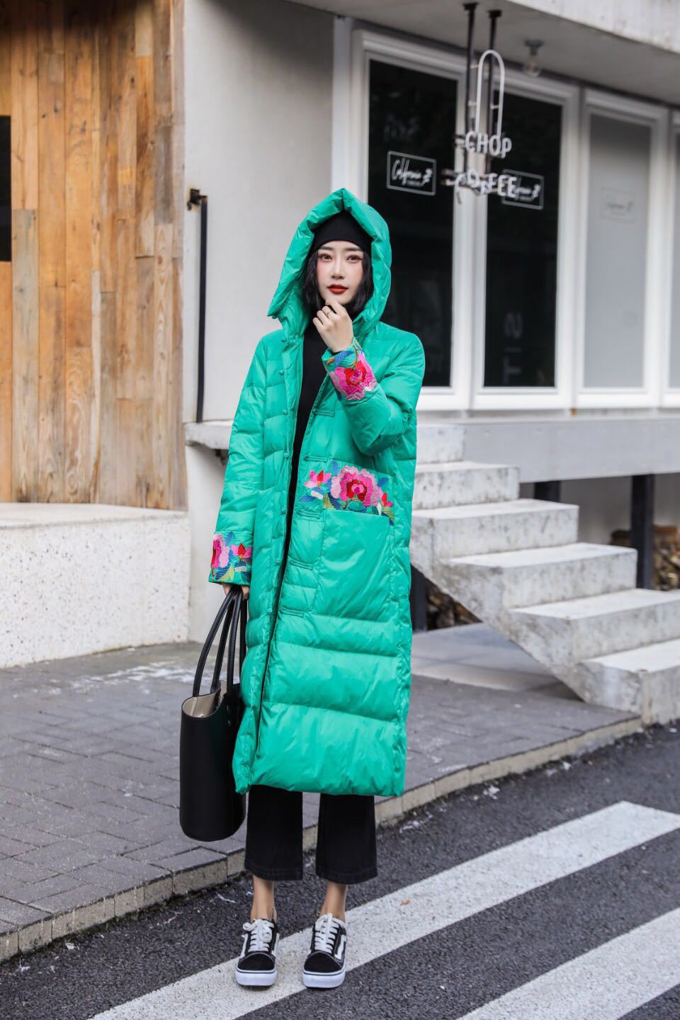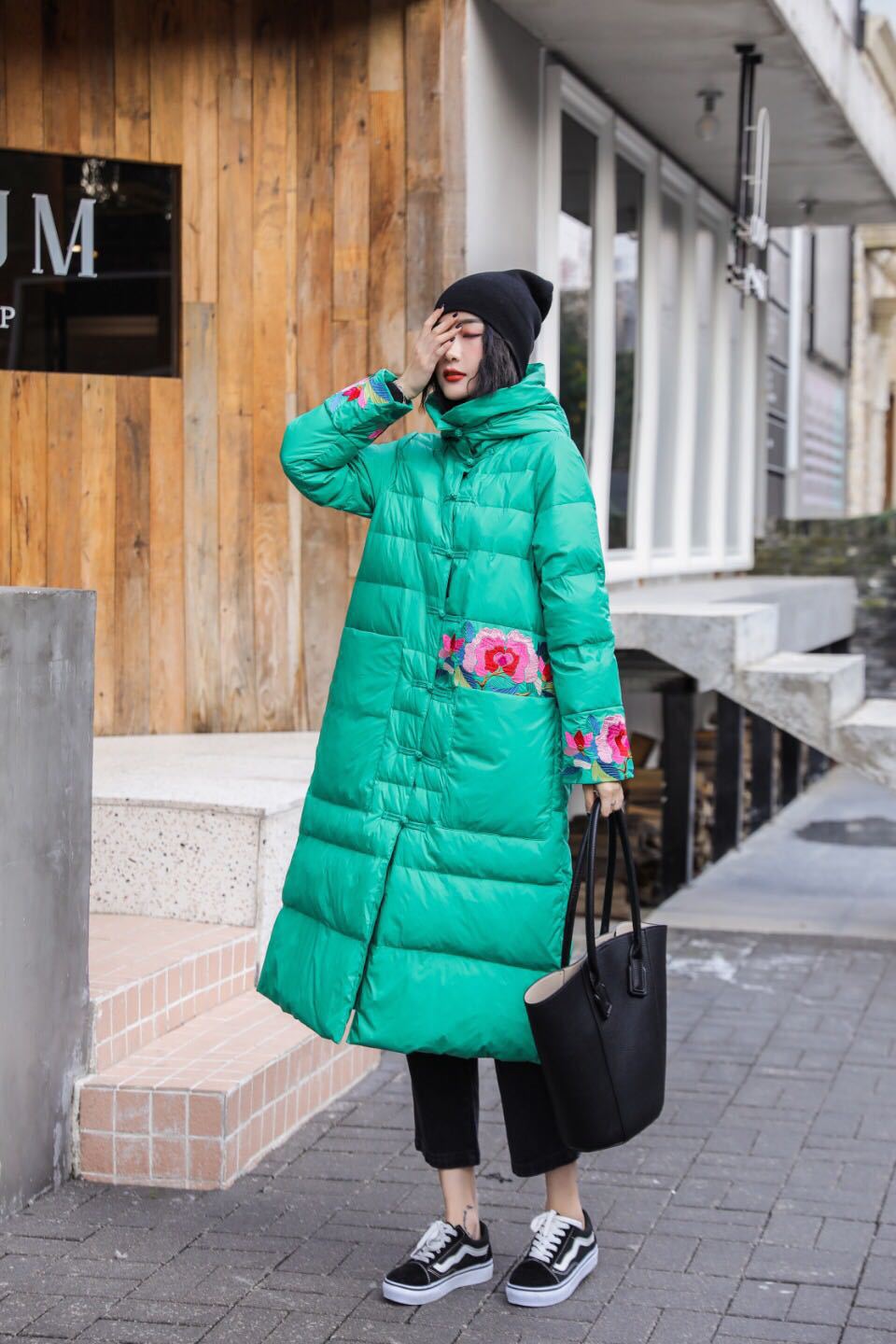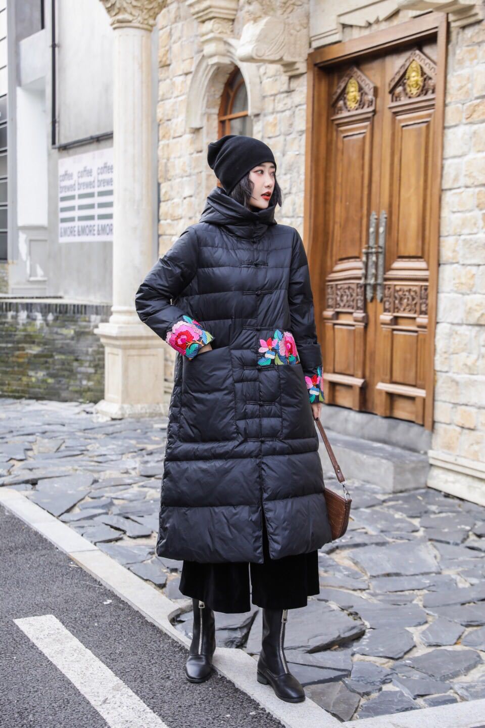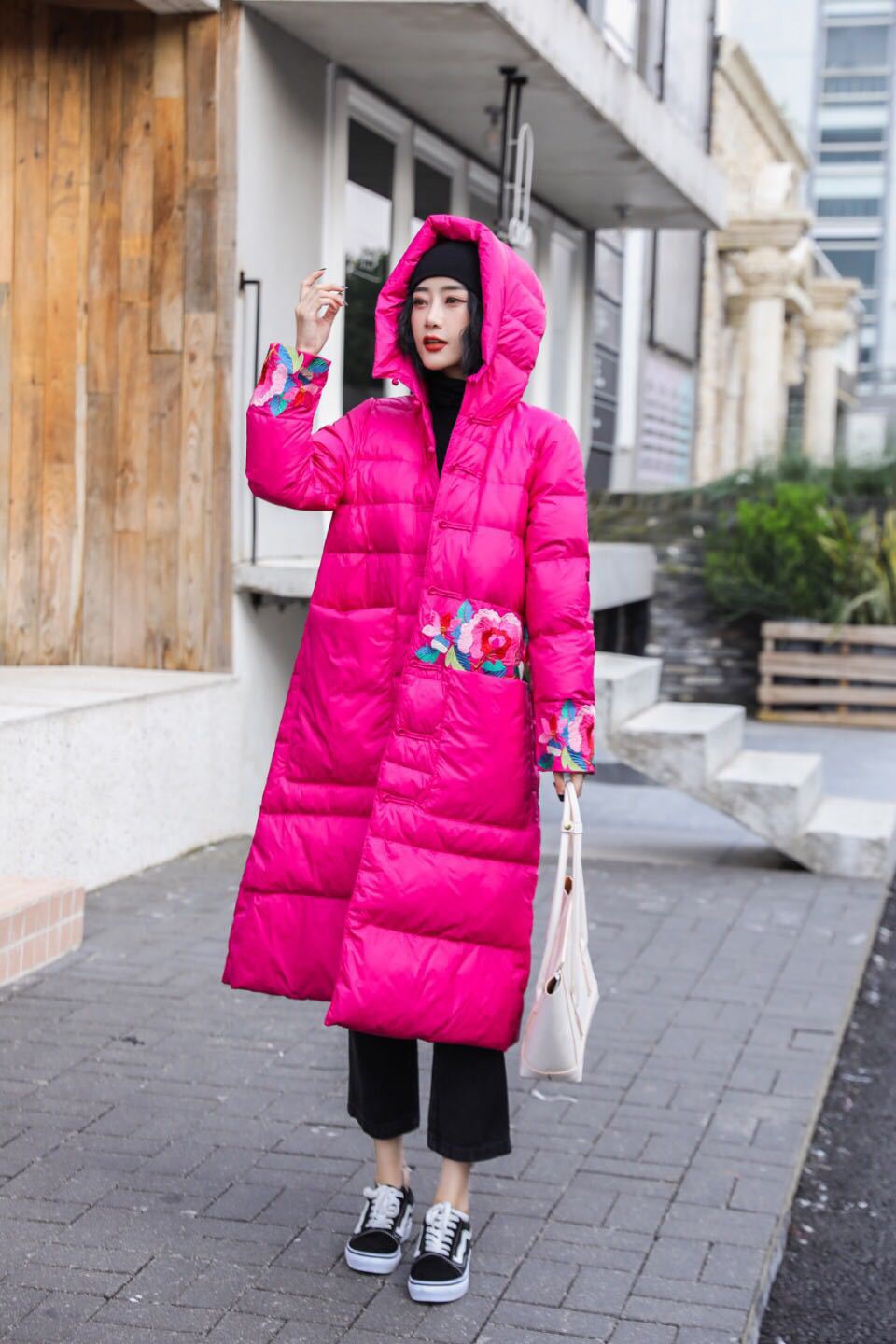 上海旗袍厂XJ-1911中国风冬季新款宽松大码百搭刺绣连帽羽绒服女长款过膝保暖外套