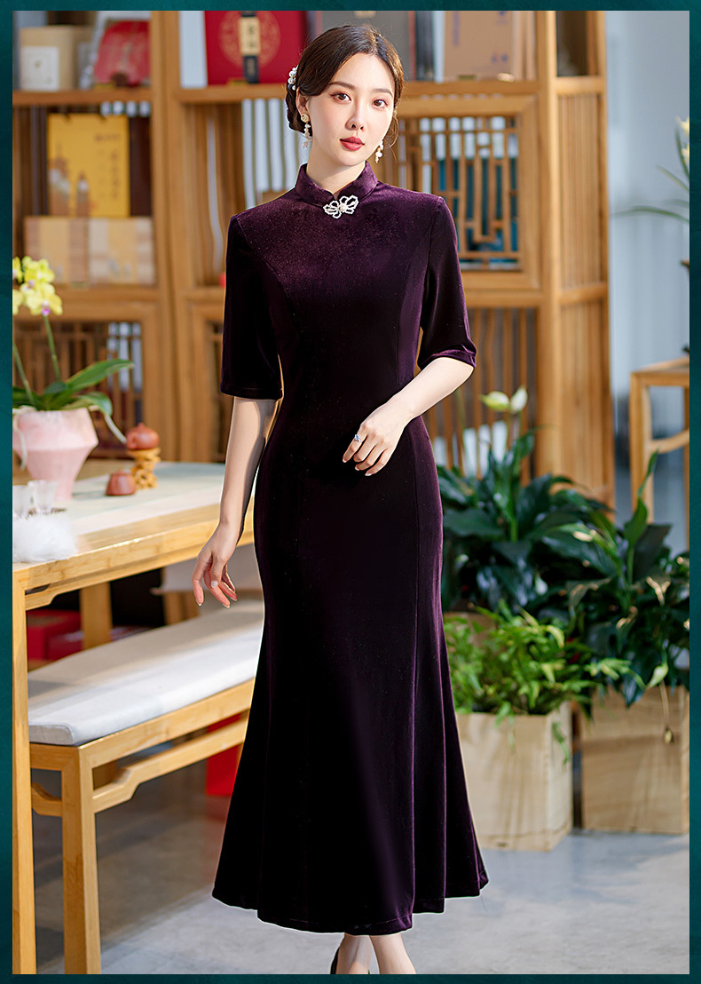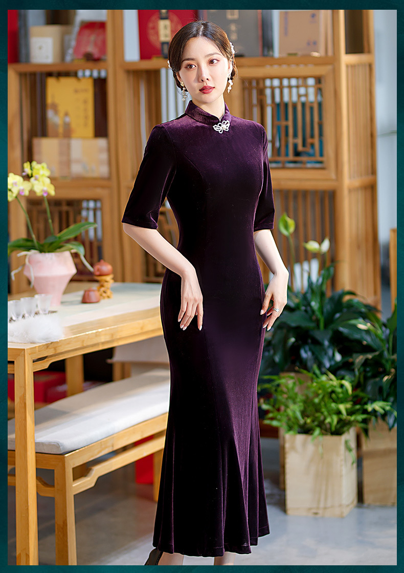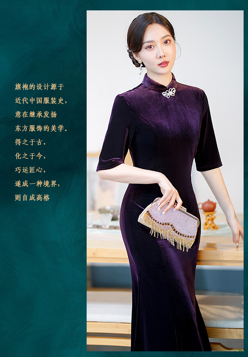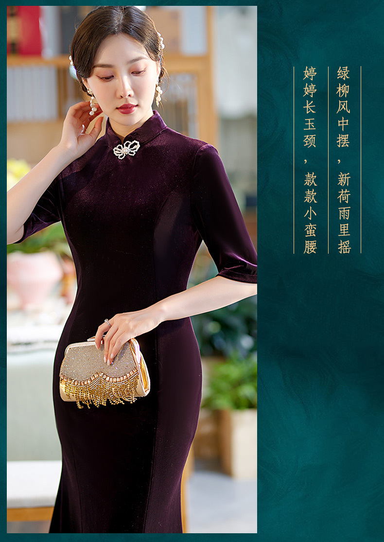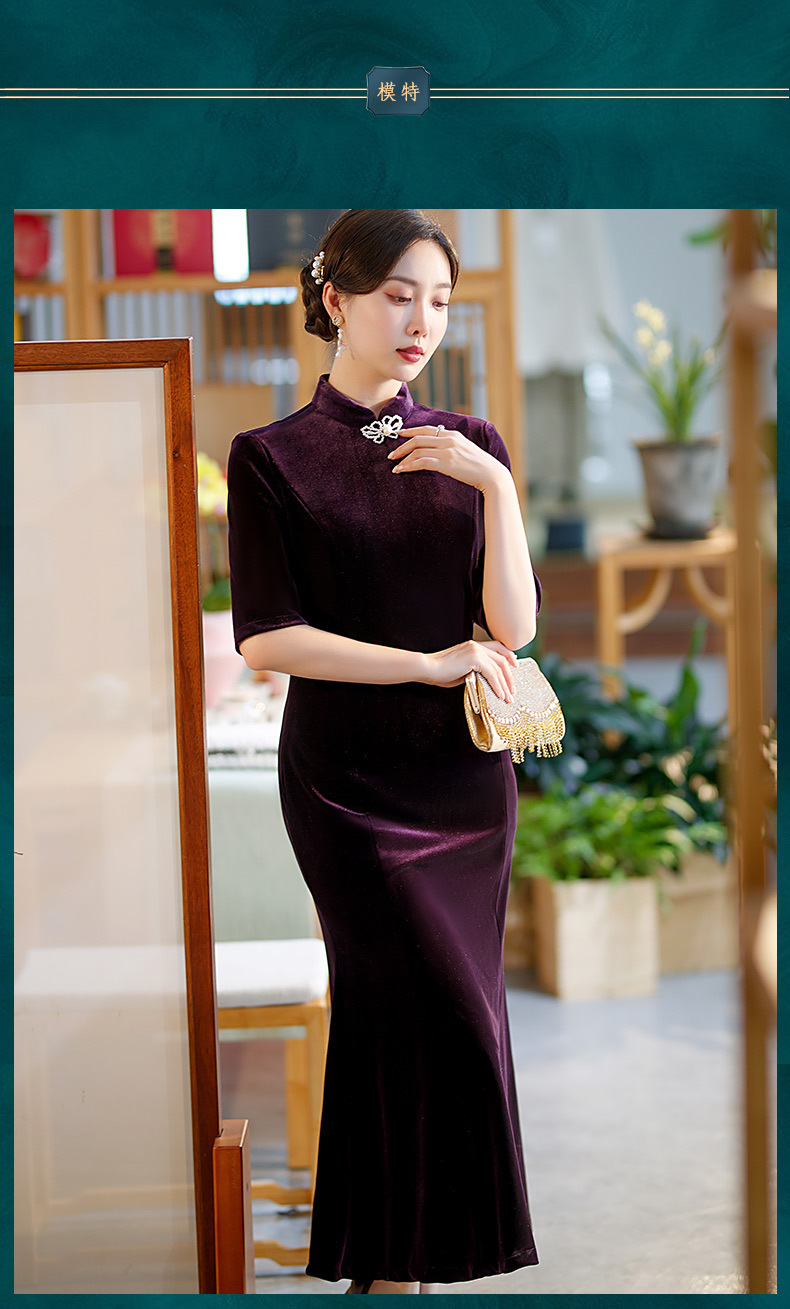 五分袖修身立领丝绒复古旗袍鱼尾连衣裙ST-C2168