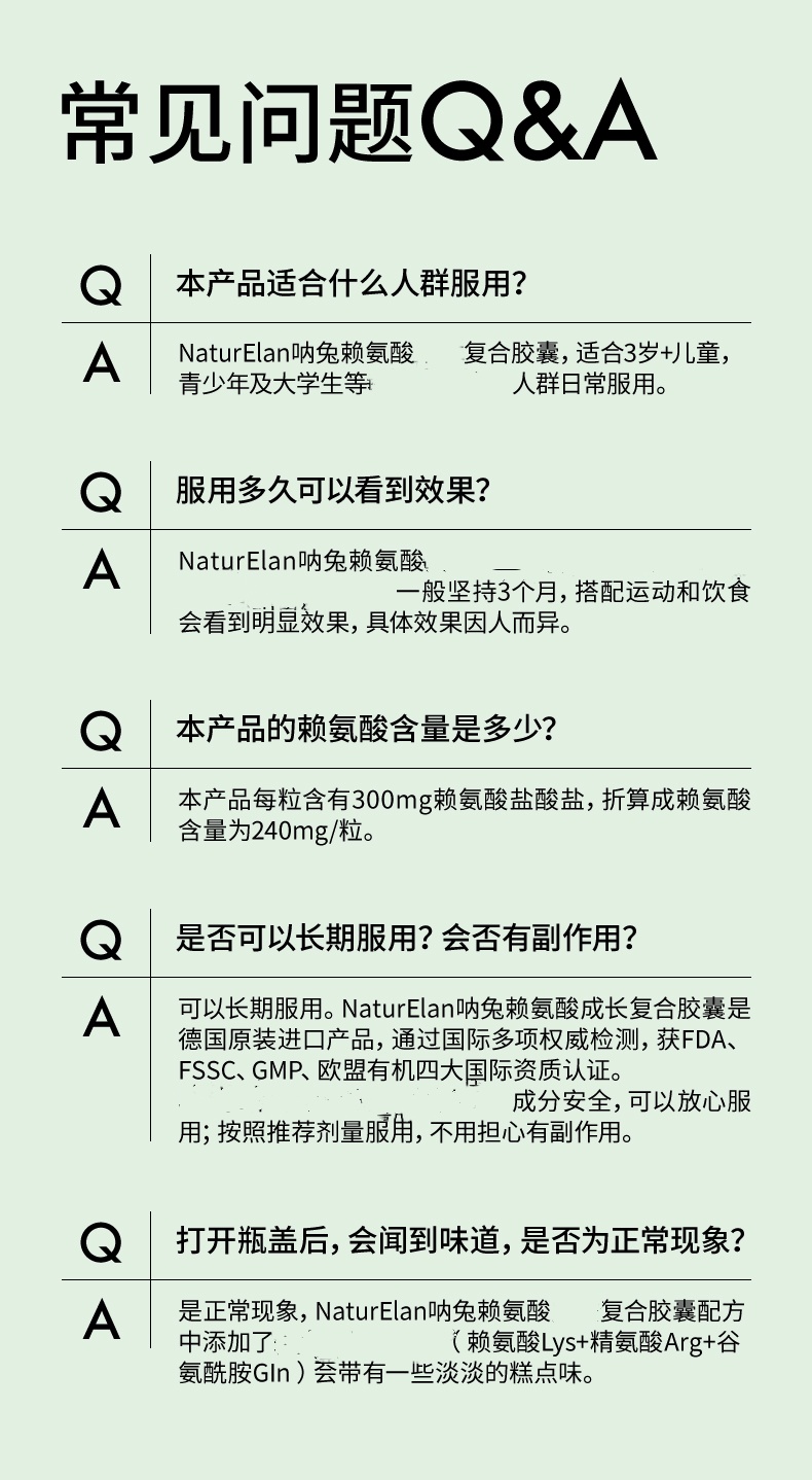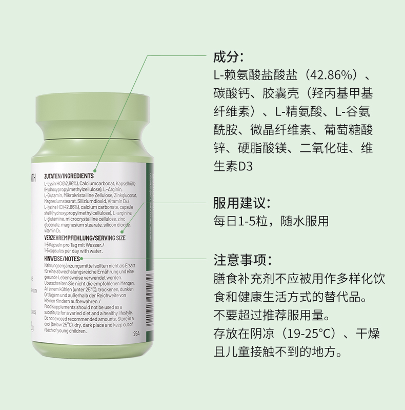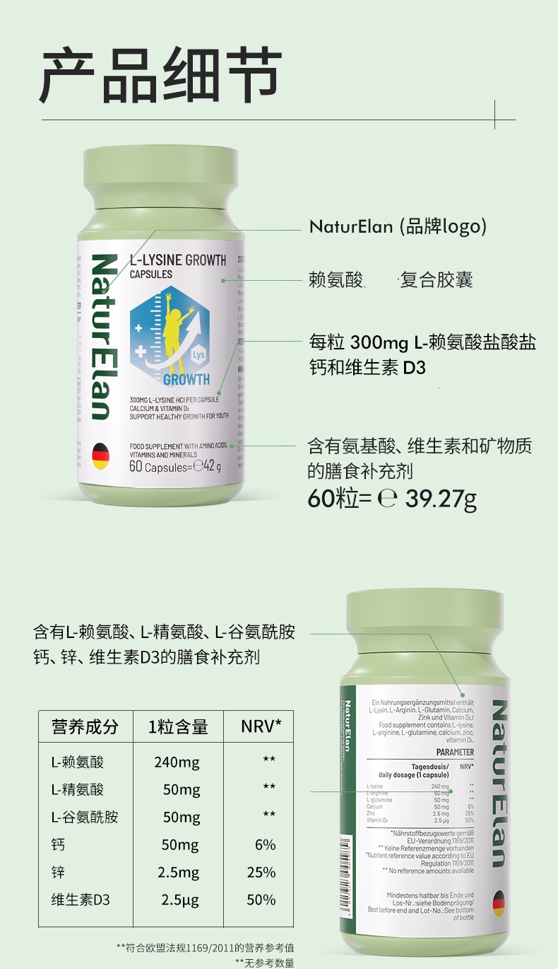【跨境】德国NaturElan 呐兔赖氨酸复合胶囊 60粒/瓶