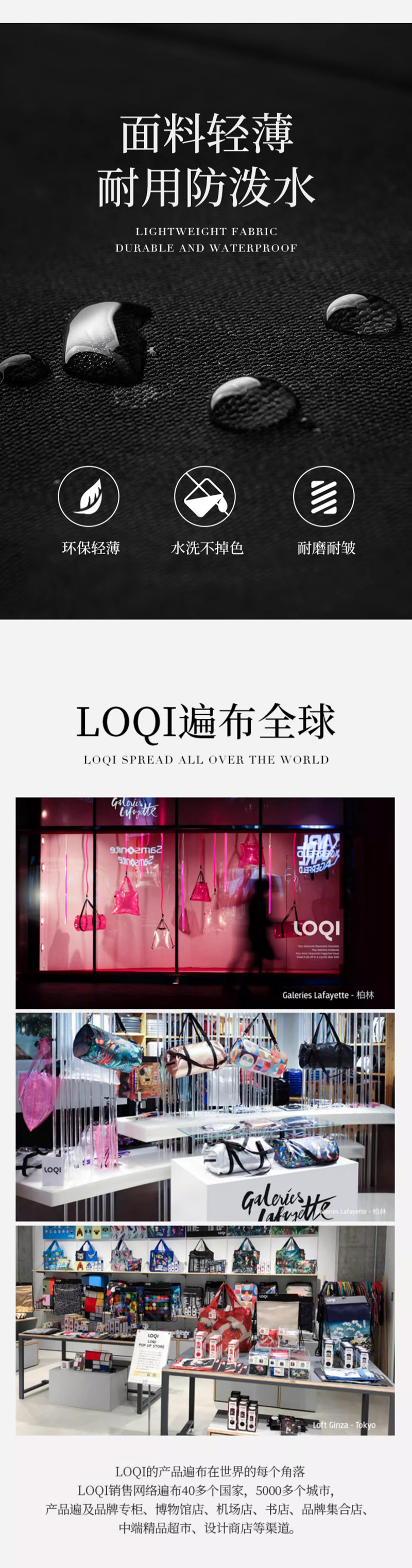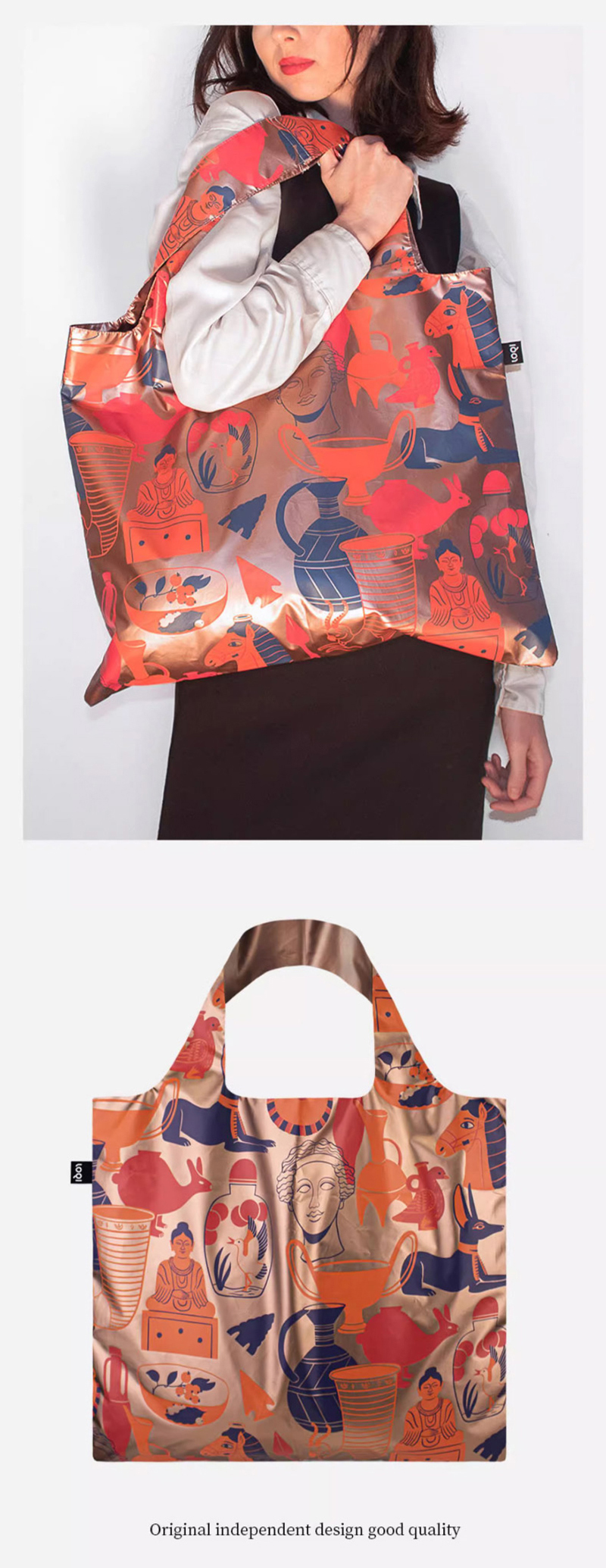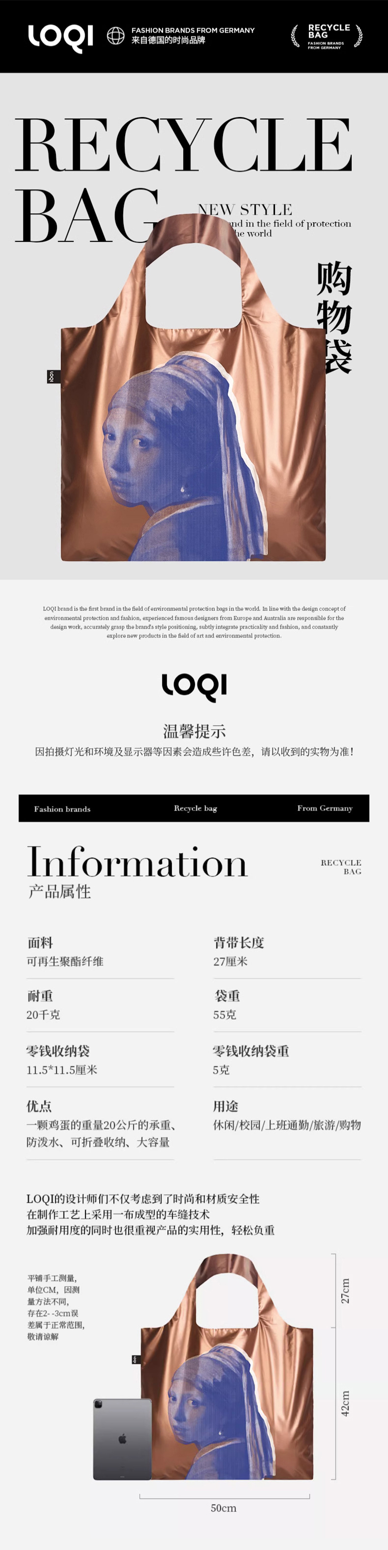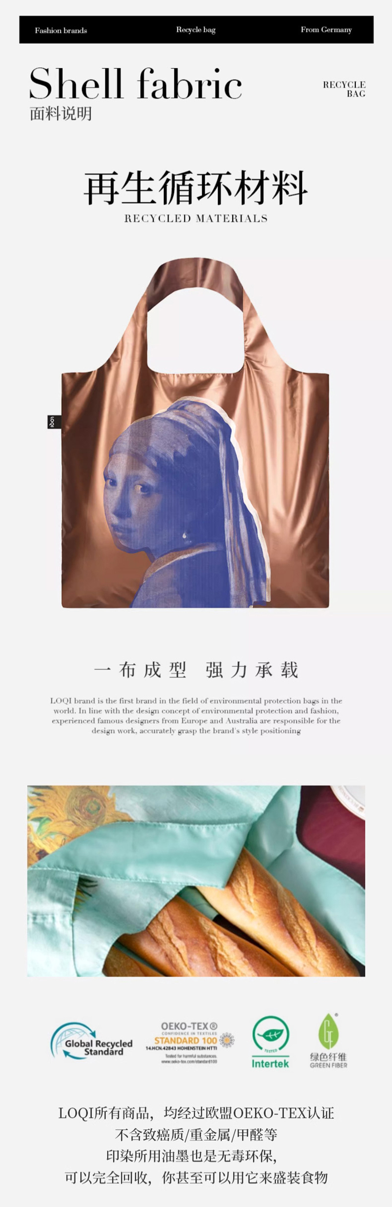 德国LOQI 涂层系列 潮流时尚艺术环保万用袋 折叠大容量单肩手提购物袋承重40斤防泼水