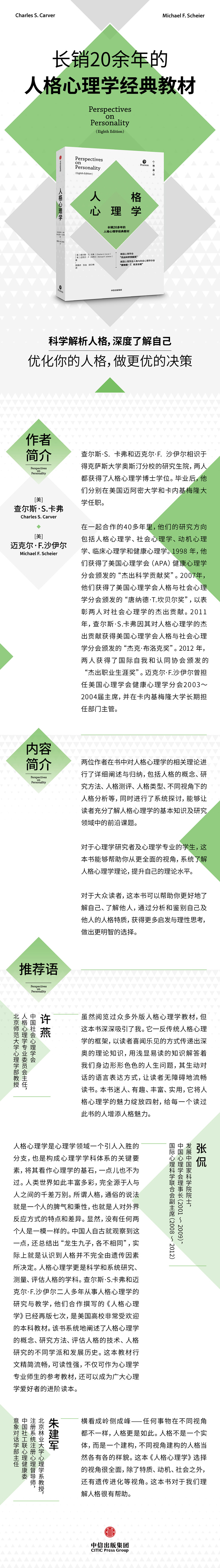 所谓人格,通俗的说法就是一个人的脾气和秉性,也就是人对外界反应方式的特点和差异。人格心理学是心理学领域的重要分支,也是构成心理学学科体系的关键要素,通常被认为是心理学科的基石。 在心理学派中,对于人格有很多不同的观点;对于人性,也有很多不同的思考方式。这本《人格心理学》描述了当今人格心理学家的一系列视角,其内容反映了两个坚定不移的信念。首先,思想是人格心理学课程中重要的一课。出于这个原因,本书强调理论而非理论家。这本书的主要任务是尽可能清晰地呈现构成每个理论观点的思想。其次,研究在人格心理学中很重要。想法和直觉是有价值的,但是需要有人检查一下它们是否真的有用。因此,每种理论都伴随着有关该理论的研究讨论。对研究的作用强调突出了这样一个事实,即人格心理学是一个正在进行的充满活力的科学探索过程。 人格心理学更是科学和系统研究、测量、评估人格的学科。查尔斯·S.卡弗和迈克尔·F.沙伊尔二人多年从事人格心理学的研究与教学,他们合作撰写的《人格心理学》已经再版七次,是美国高校非常受欢迎的大学本科教材。该书系统地阐述了人格心理学的概念、研究方法、评估人格的技术、人格研究的不同学派和发展历史。这本教材行文精简流畅,可读性强,不仅可作为心理学专业师生的参考教材,还可以成为广大心理学爱好者的进阶读本。