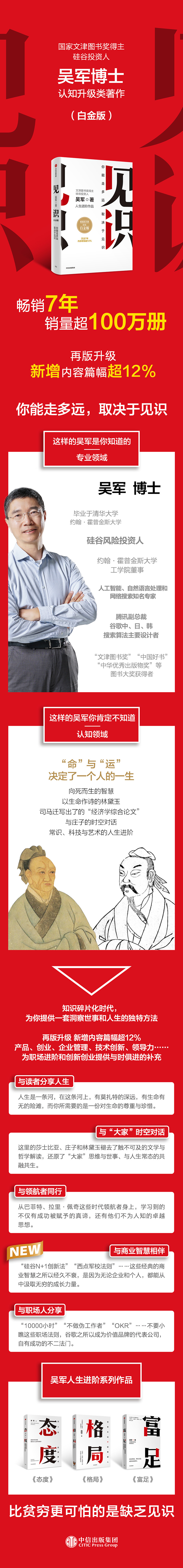 《见识》是硅谷投资人、文津图书奖得主吴军博士部认知升级类著作。吴军认为,与其他外部资源或者个人因素相比,个人的成就首先取决于见识。因此在书中,他将自己的经历和身边那些时代先行者的经验,以鲜明睿智的方式阐述出来,为读者提供了一个与众不同的、值得深度思考的看待世界与看待问题的视角。《见识》首版问世7年来,销量已逾百万册。本次再版升级,新增内容篇幅超12%,涵盖产品、创业、企业管理、技术创新、领导力等方面,为职场进阶和创新创业提供了与时俱进的补充。