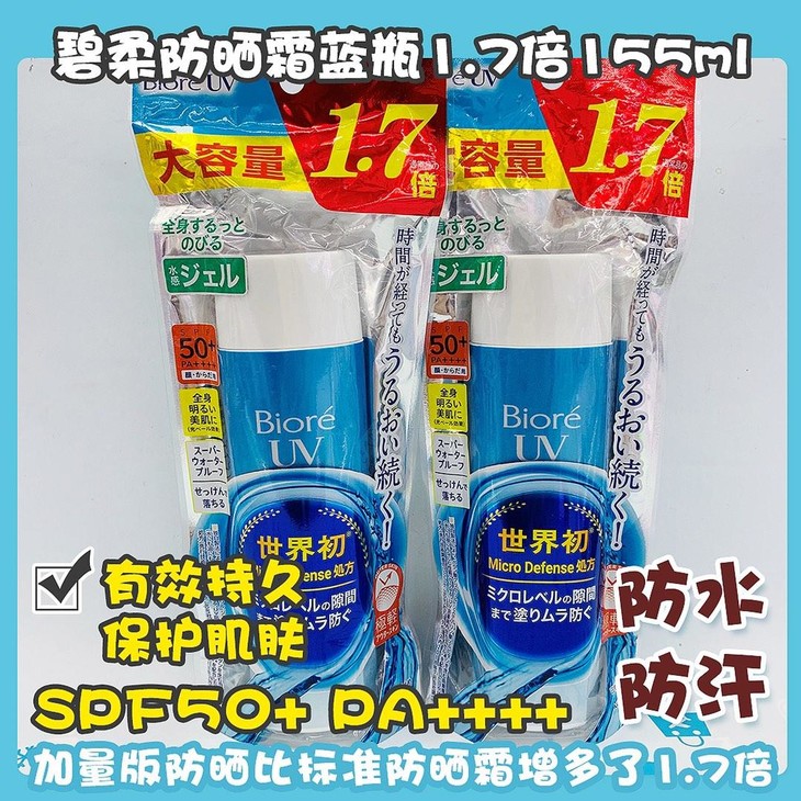 柔防晒霜蓝瓶1.7倍155ml(2019新款)👍19年升级版微米防护技术⬆,防护膜更紧密➰。拥有SPF50+ PA++++☀高倍数防晒指数,有效持久保护肌肤💆,免受UVA/UVB伤害。新版增加了玻尿酸和柑橘🍊类保湿精华提取物💦,使用感清凉温和🍃~防水防汗配方持续性更久🧐,洗面奶和沐浴露即可清洗干净啦👏,无需卸妆,不必担心因无法卸除而造成的毛孔阻塞。加量版防晒比标准防晒霜增多了1.7倍的量💨,好值耶推荐推荐~