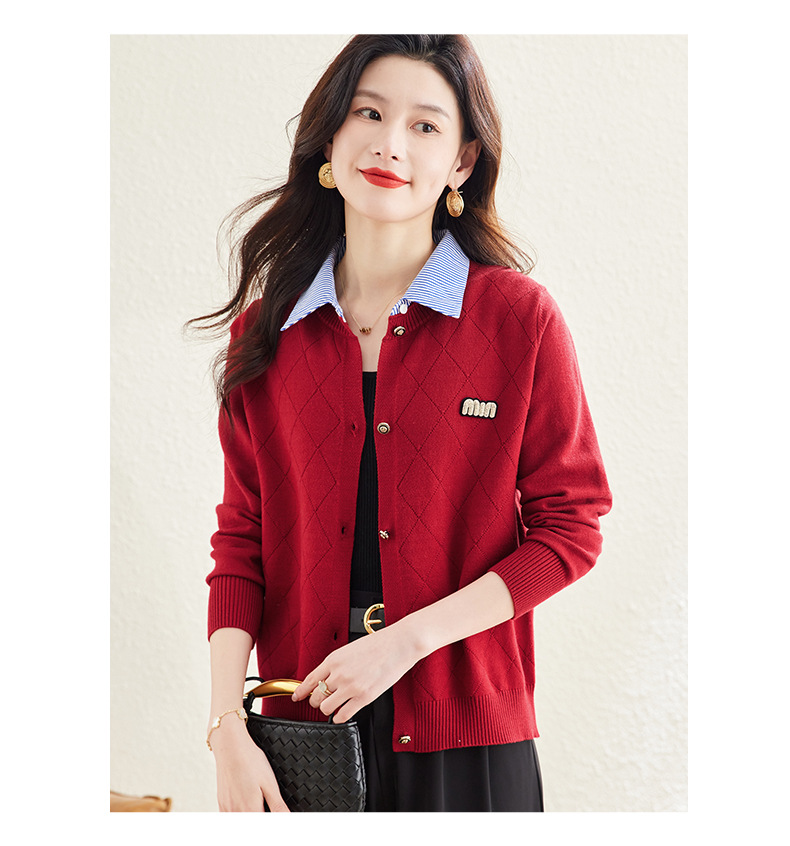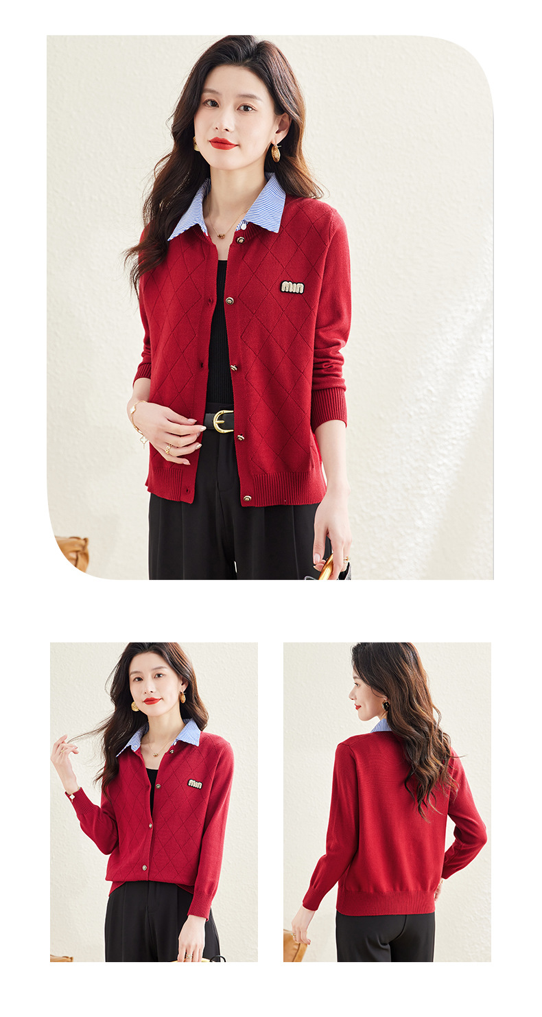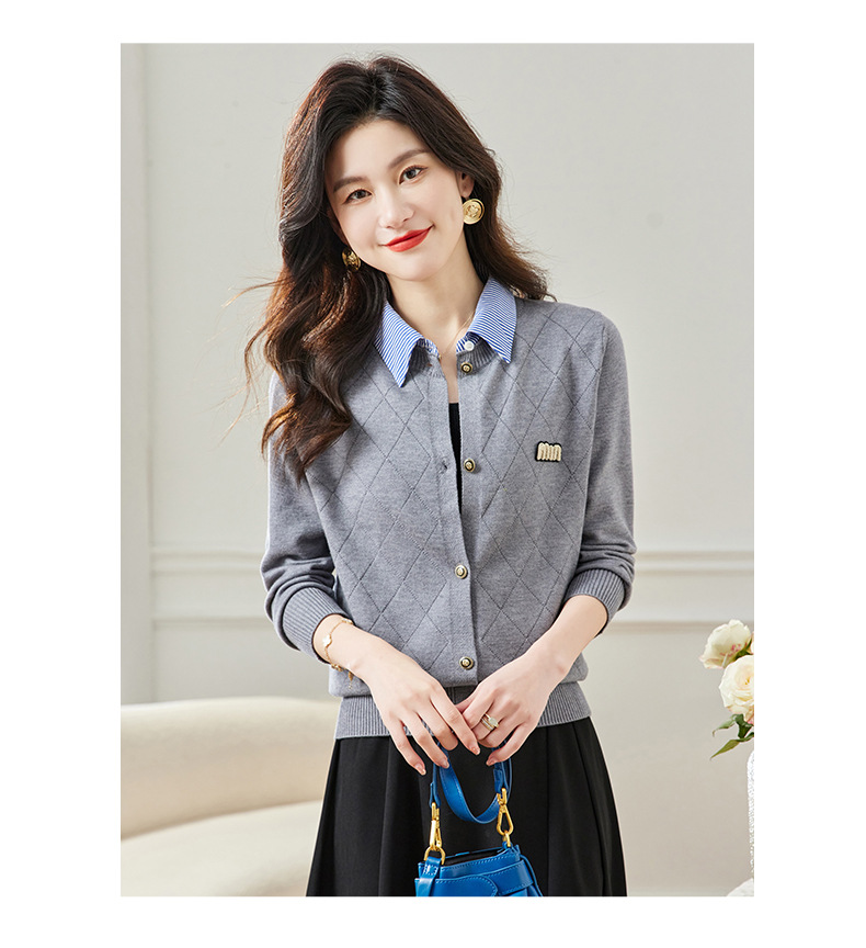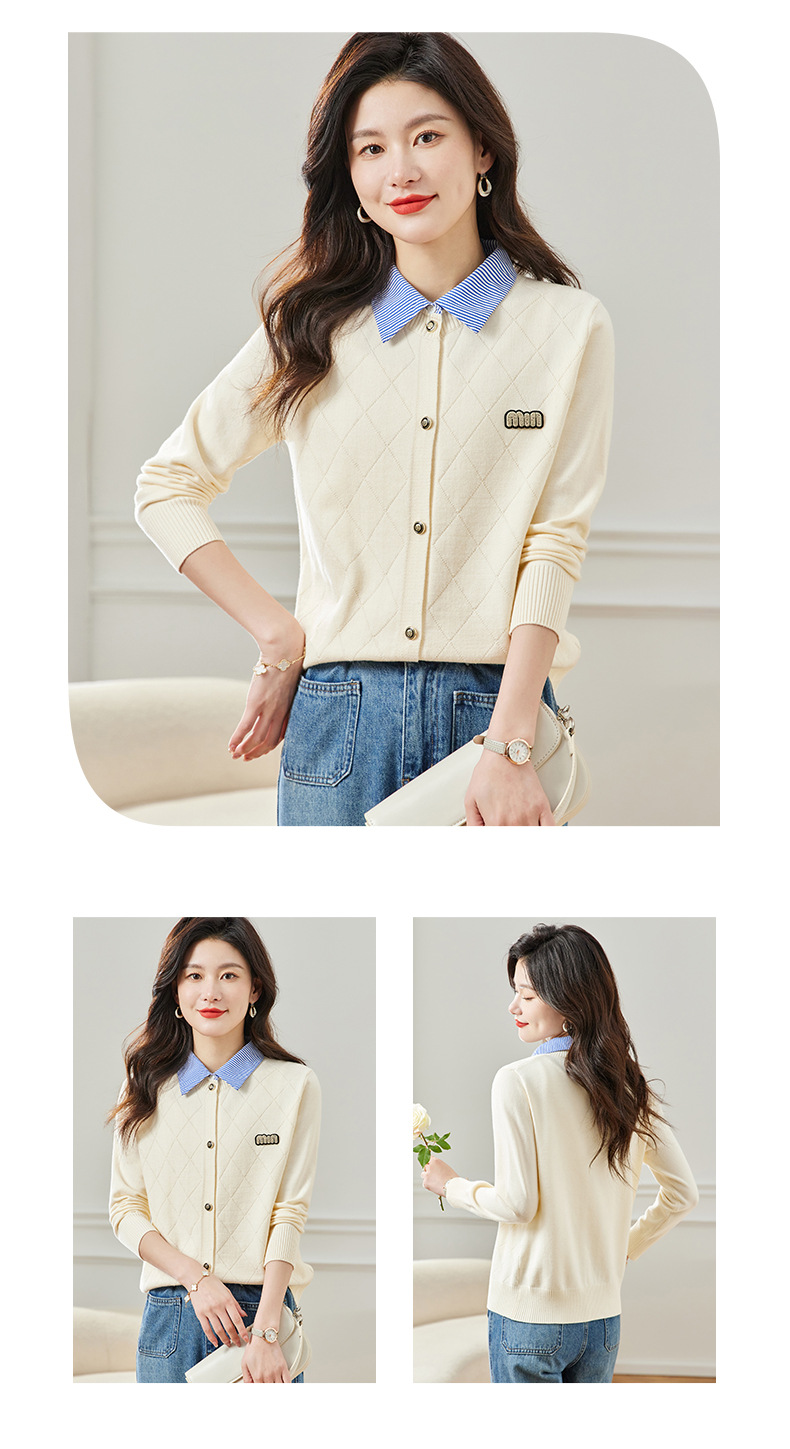 CC66-5801 衬衫领针织衫假两件上衣女2024春秋新款翻领洋气时尚开衫外套