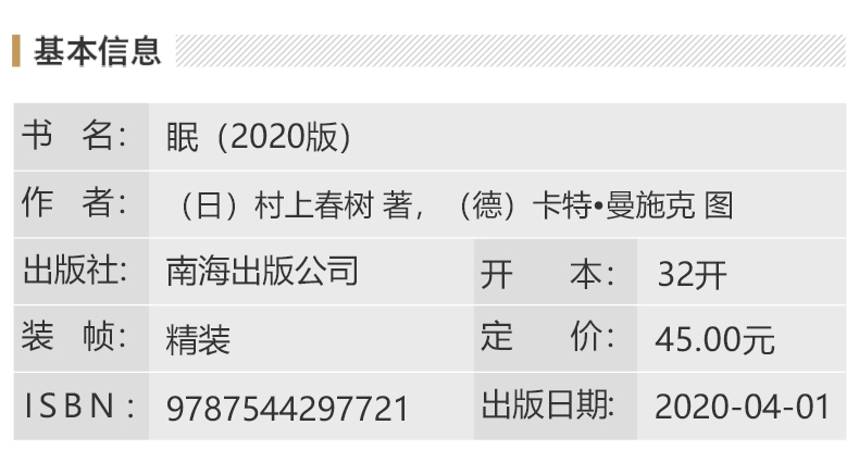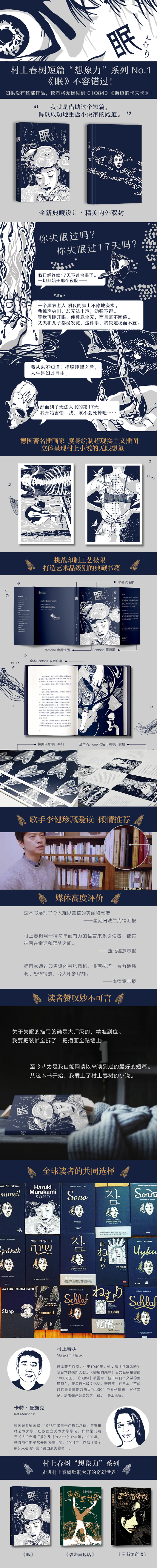 《眠》是村上春树40岁遭遇写作与人生低潮时期创作的一部短篇小说,并且凭借其成功重新返回小说家的跑道。故事由德国知名插画家卡特·曼施克度身绘制超现实主义风格的精美插画,展现出村上小说瑰丽的想象力与冒险精神。