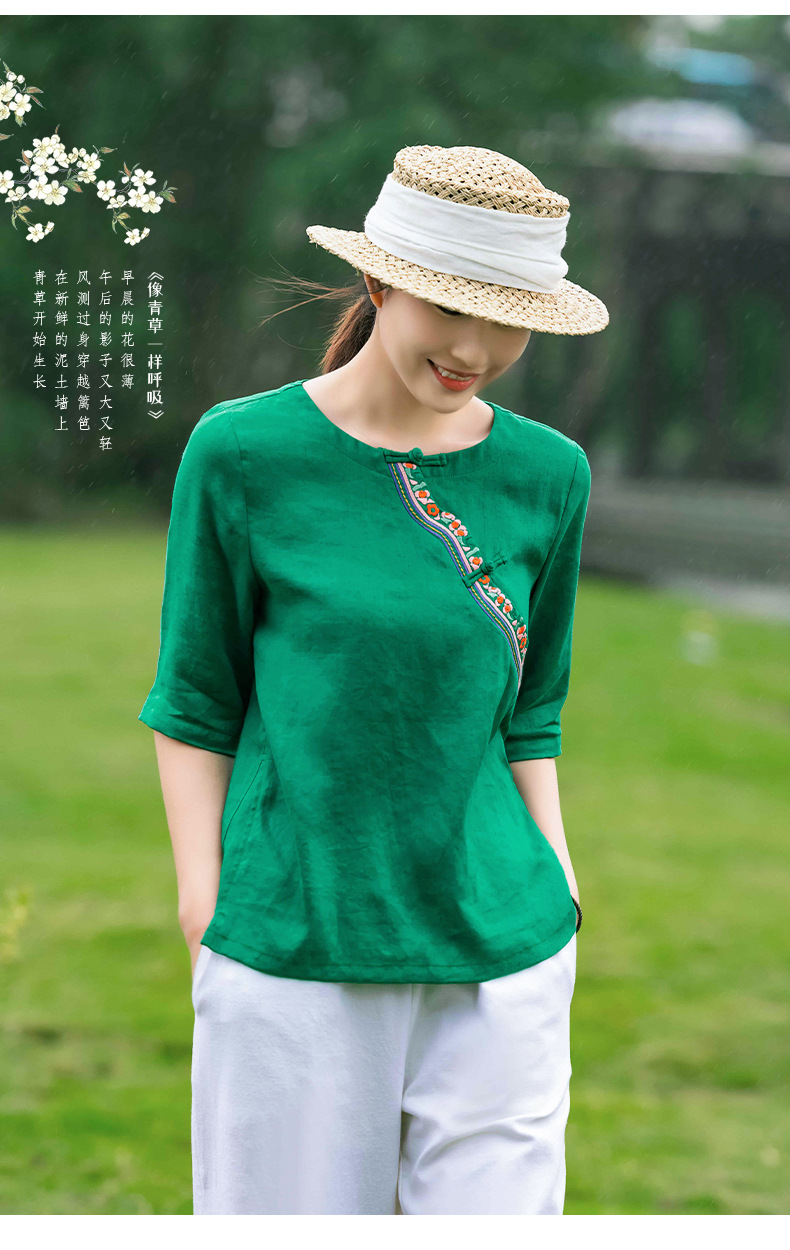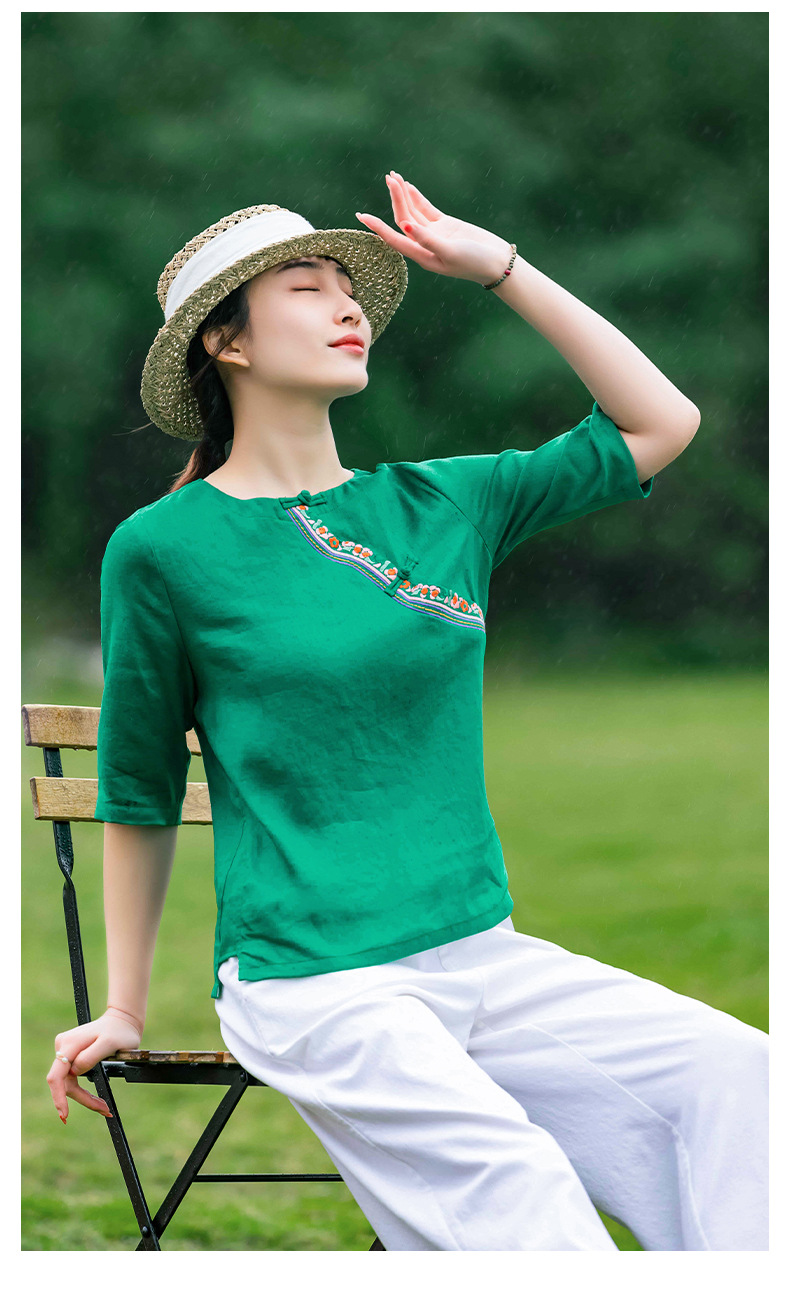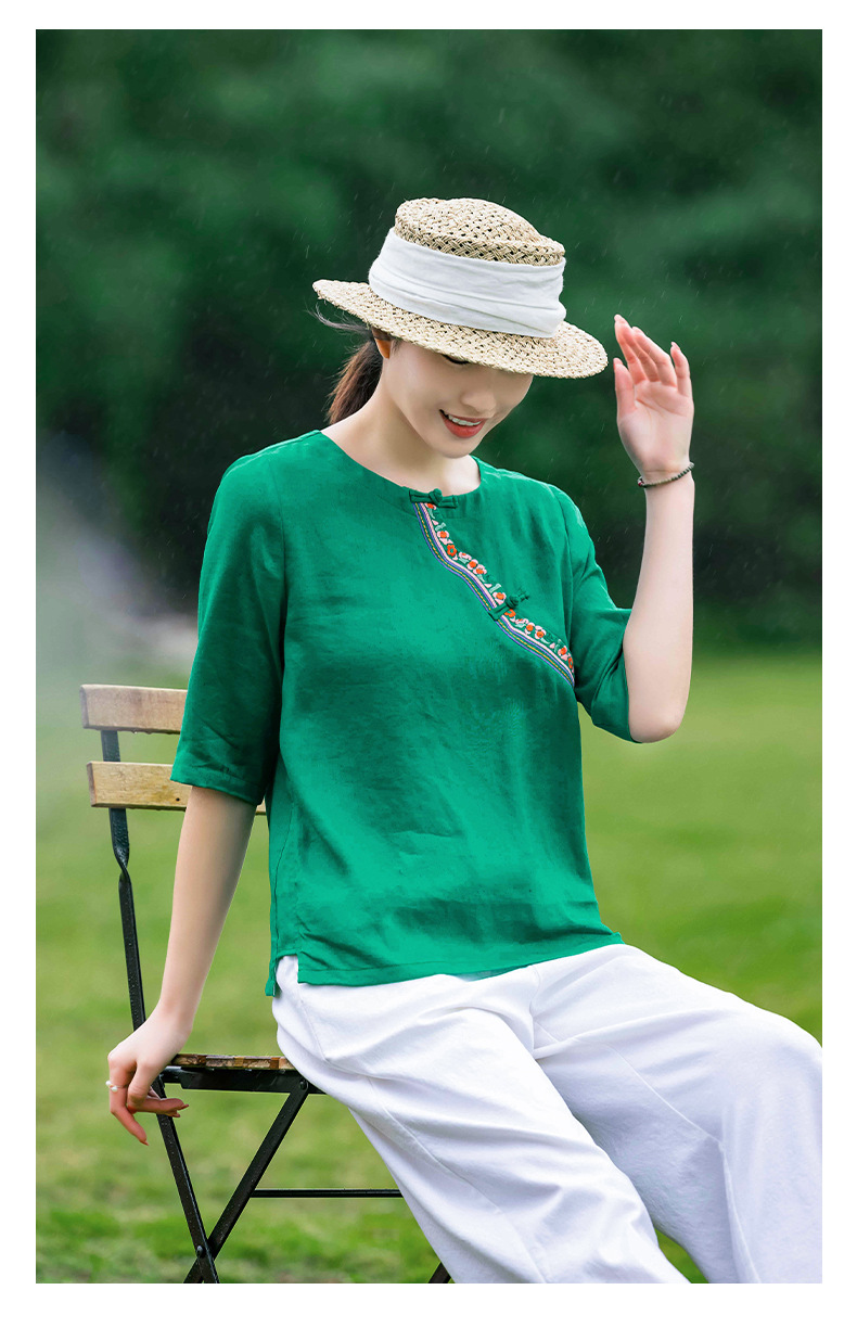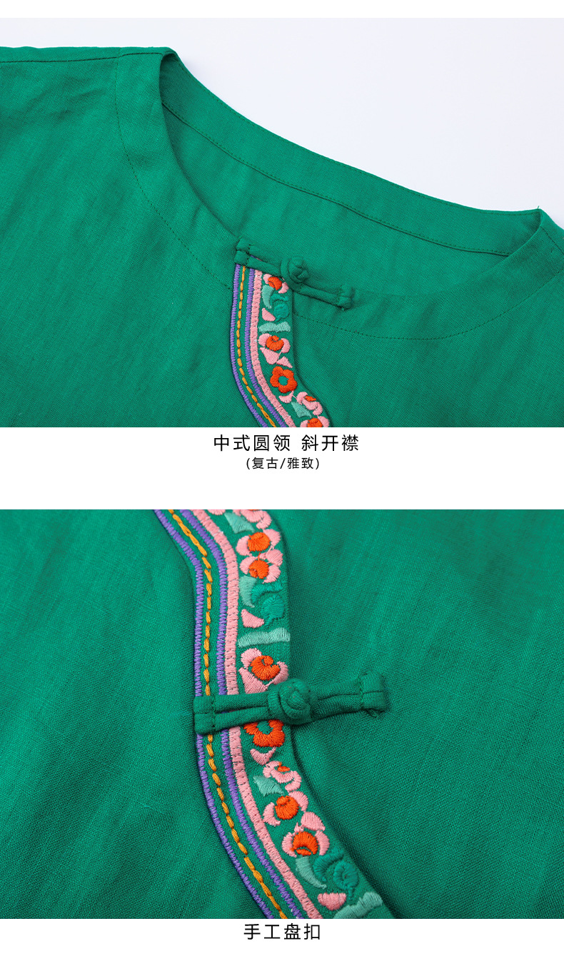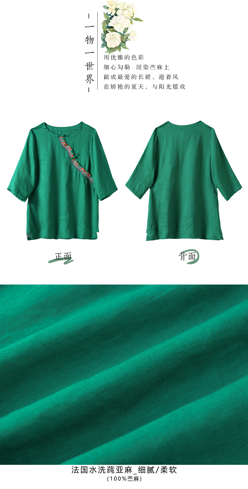 民族风刺绣t恤,中式盘扣改良斜襟上衣前短后长文艺亚麻中袖套头衫YM-C001