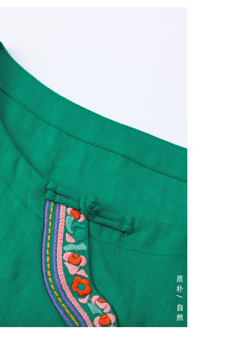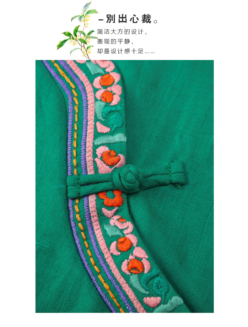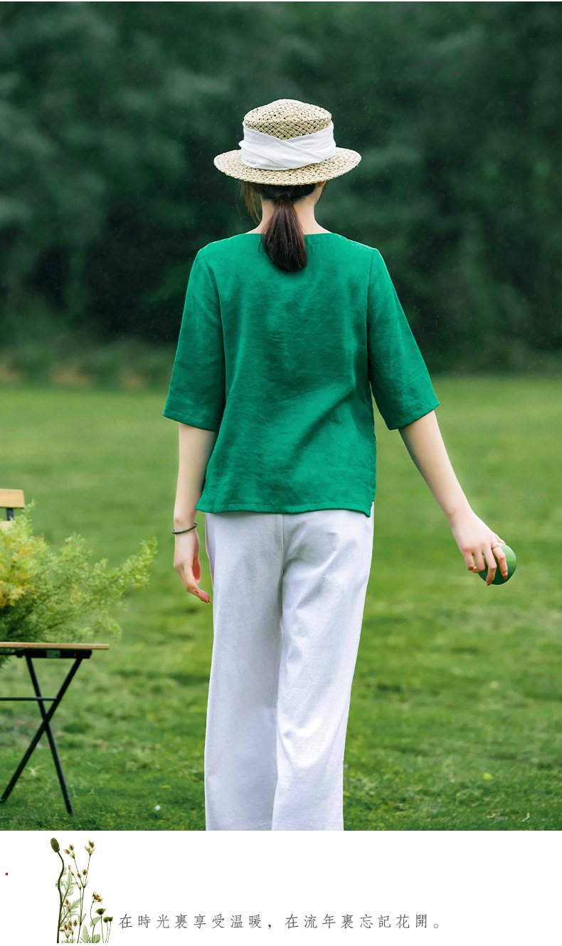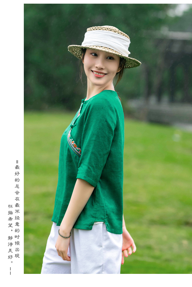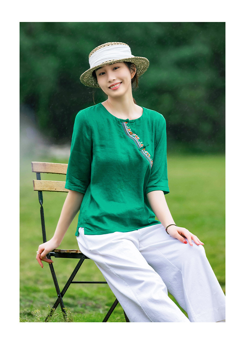 民族风刺绣t恤,中式盘扣改良斜襟上衣前短后长文艺亚麻中袖套头衫YM-C001