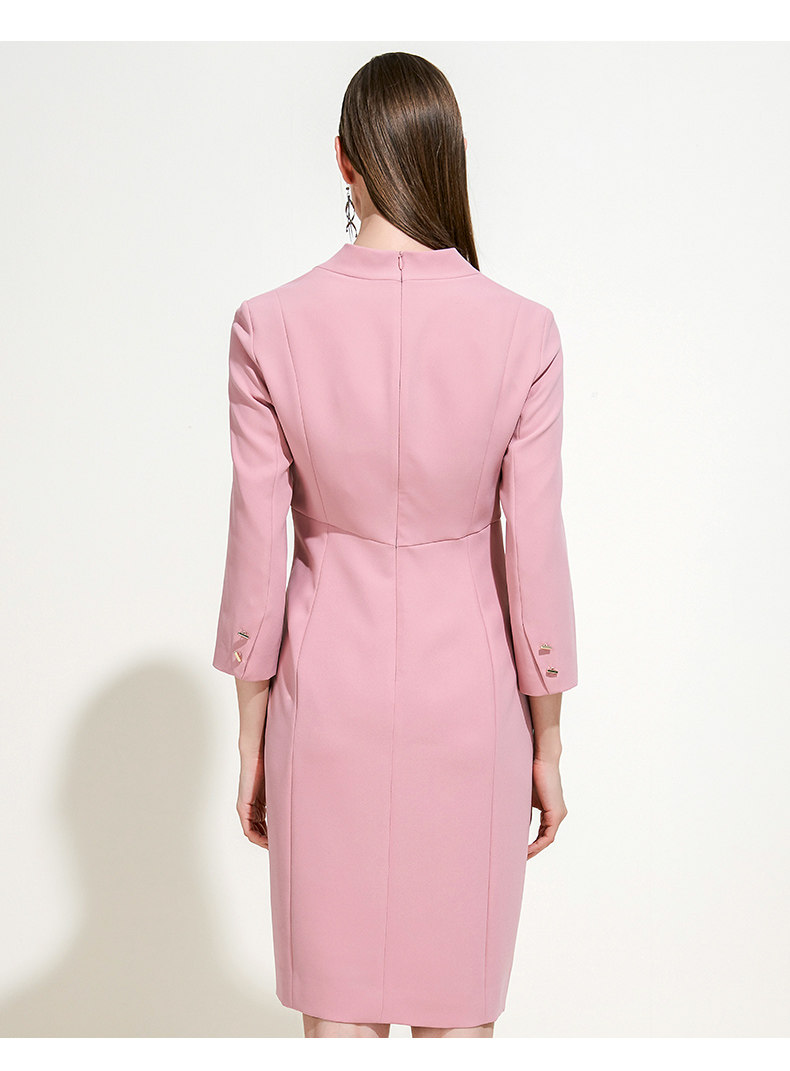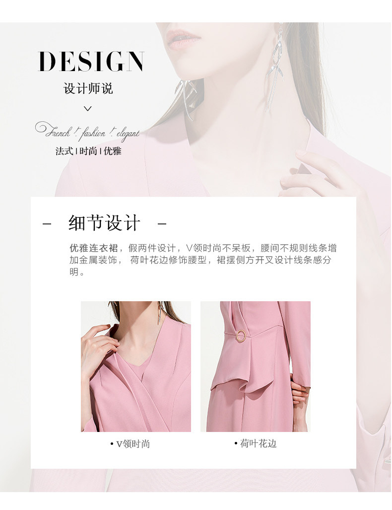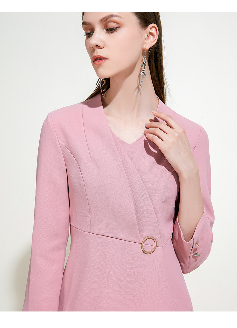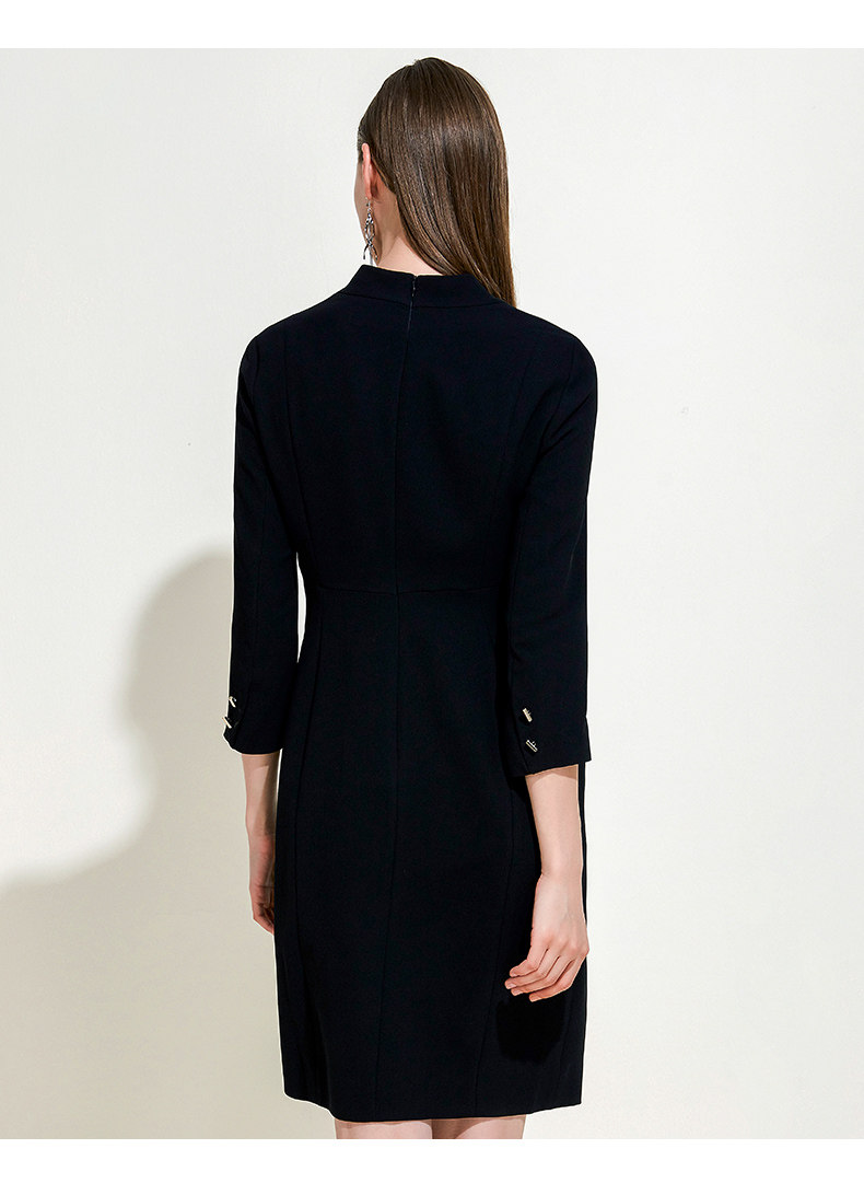 EITIE爱特爱女装春秋季新品V领七分袖高腰纯色假两件连衣裙5907614