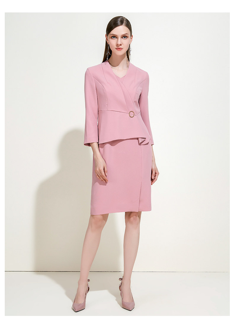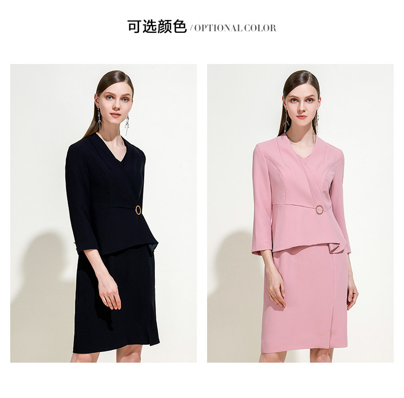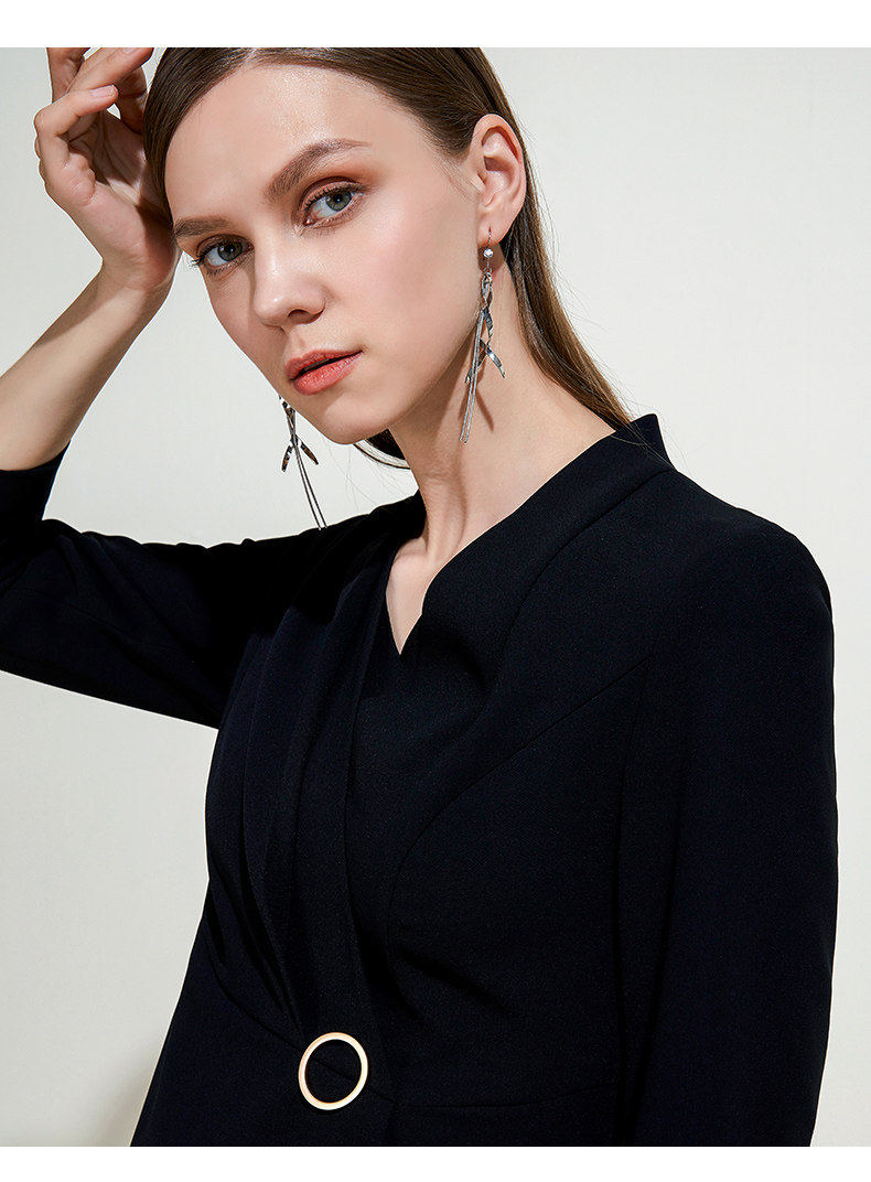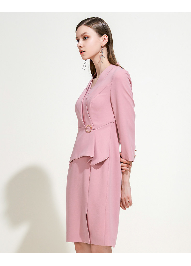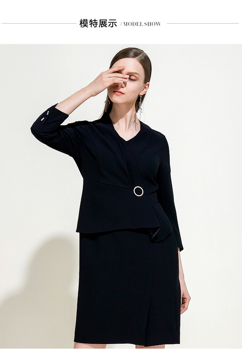 EITIE爱特爱女装春秋季新品V领七分袖高腰纯色假两件连衣裙5907614