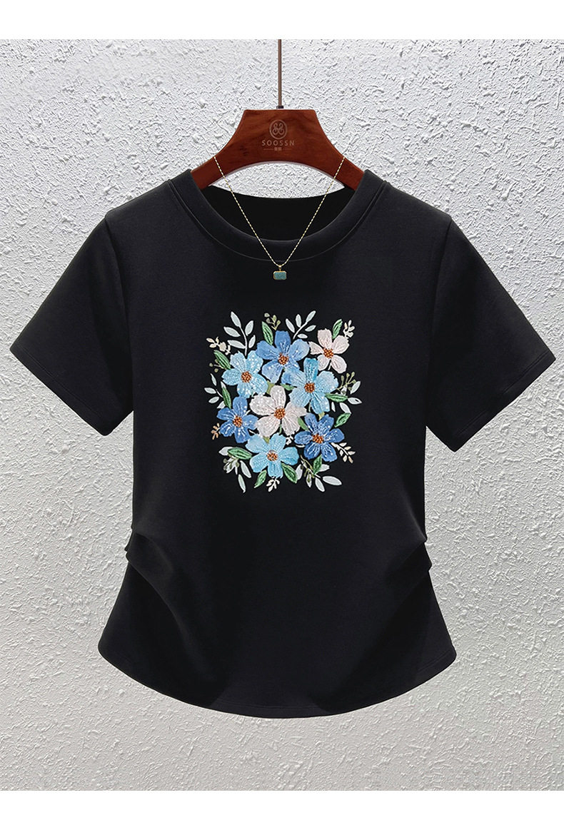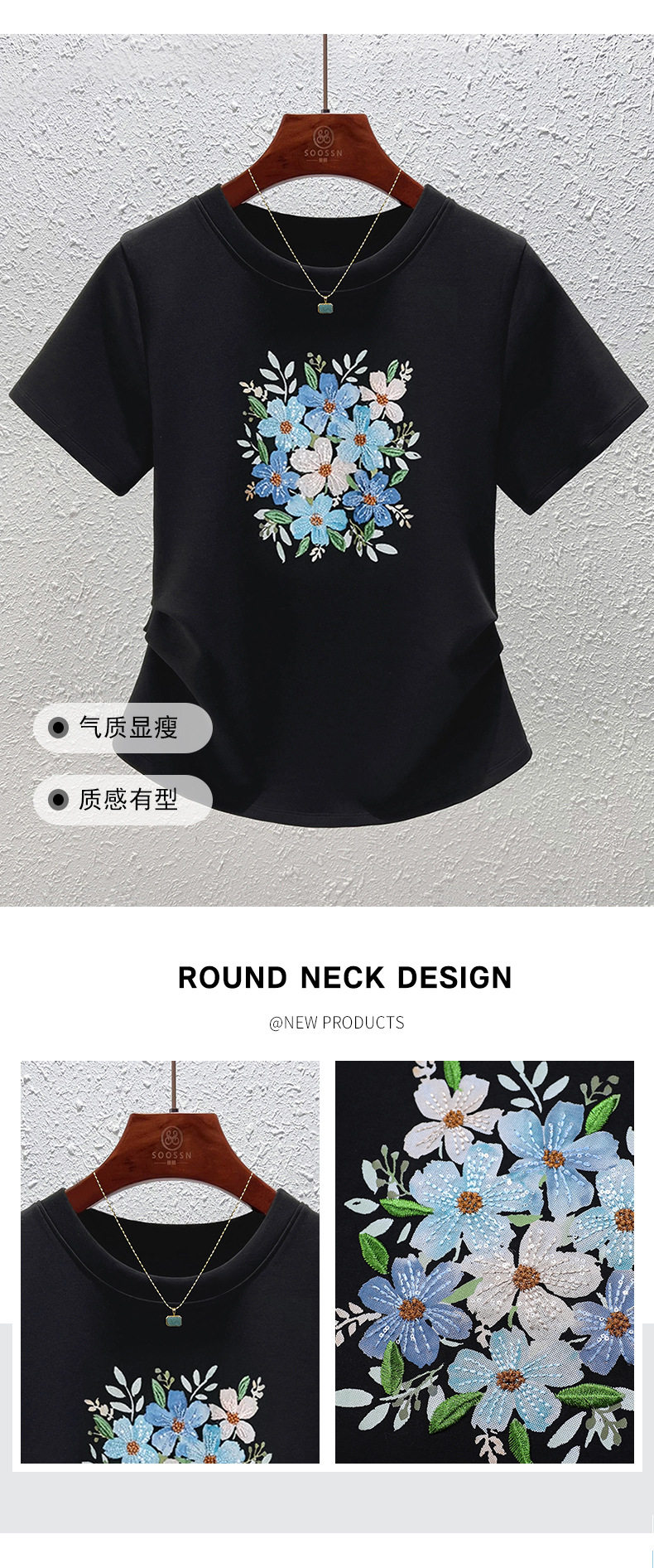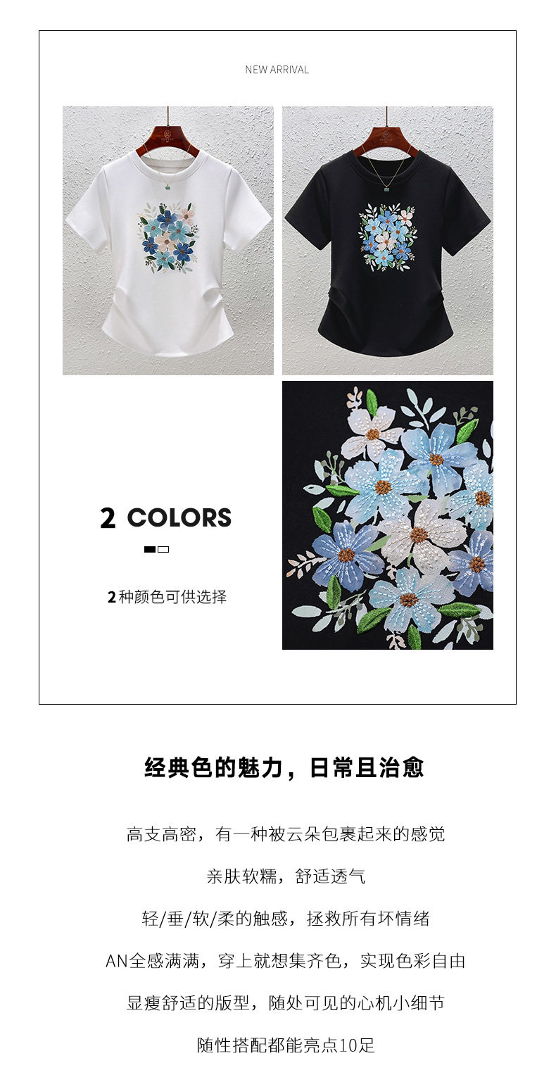 白色圆领T恤衫女短袖棉上衣重工刺绣花复古显瘦设计百搭夏季 BY-M824
