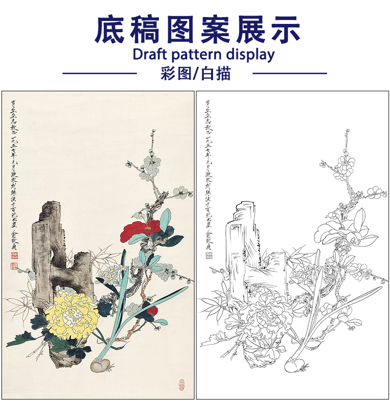 俞致贞花鸟工笔画白描底稿《玉堂富贵》临摹勾线高清打印稿ZZ89