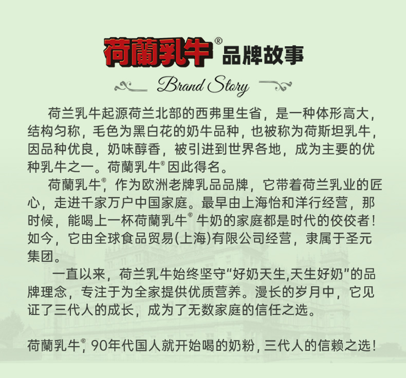 - 荷兰乳牛品牌于1990年进入中国,相伴31年始终致力于为更多家庭奉上优种荷兰乳牛带来的营养与美味。秉承“珍选至纯营养,传承经典醇香”的理念,打造一个覆盖全人群、多品类、高品质的国际化品牌。