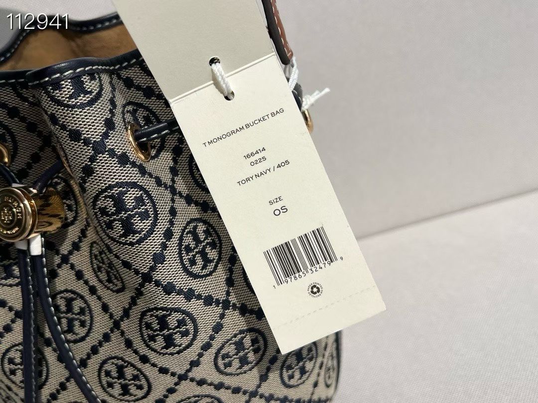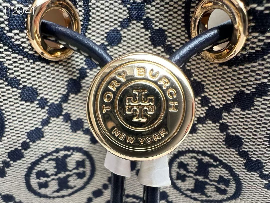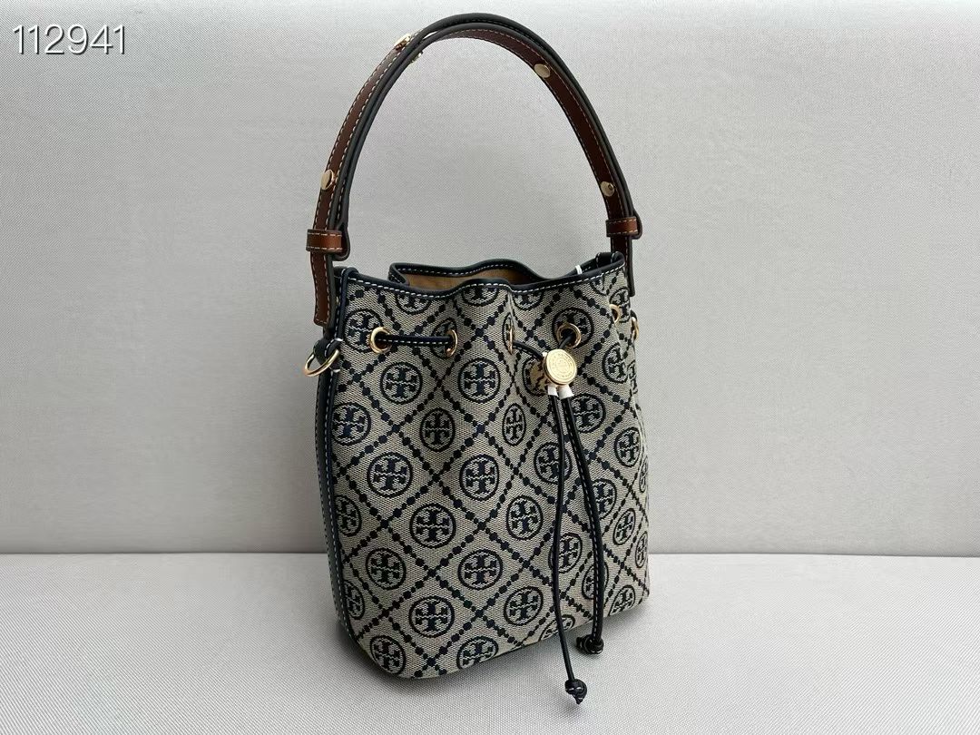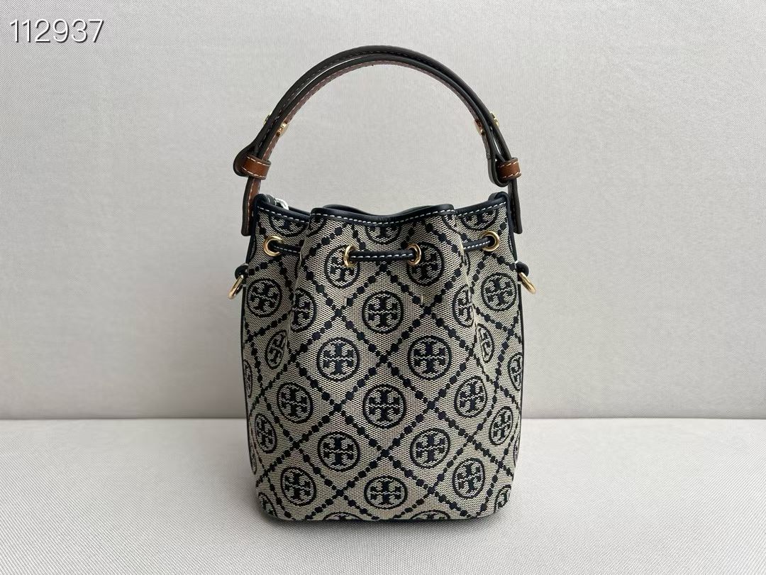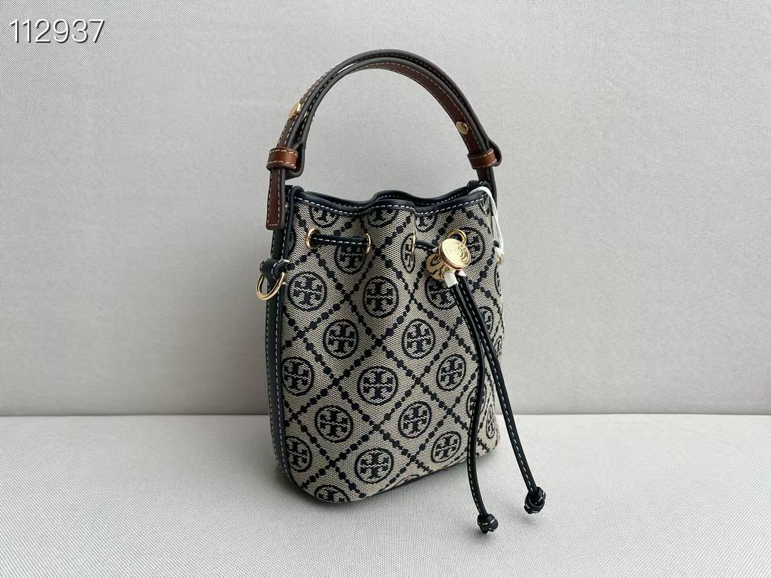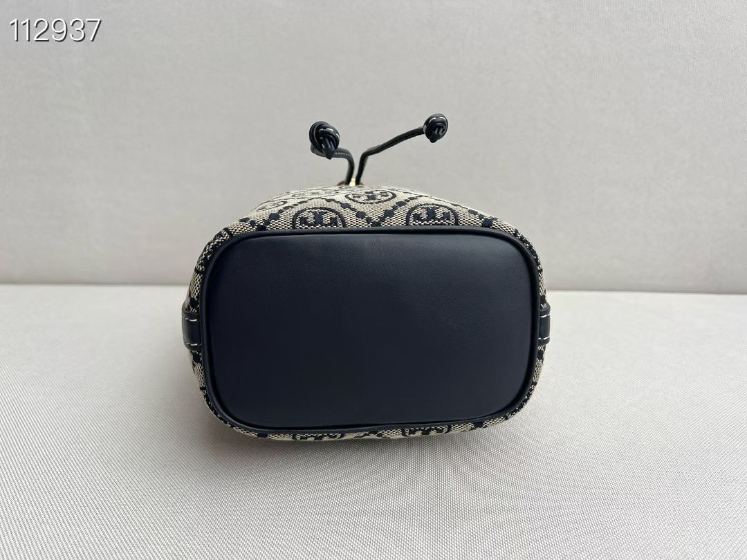 TB新款 T MONOGRAM 老花迷你水桶包,经典 T Monogram 图案,融合提花织物。这款迷你水桶包采用细腻皮革饰边,配有顶部提柄和可拆卸斜背带。可通过金属双 T Logo 按扣调节抽绳长度,上身百搭。尺寸:14/18/9