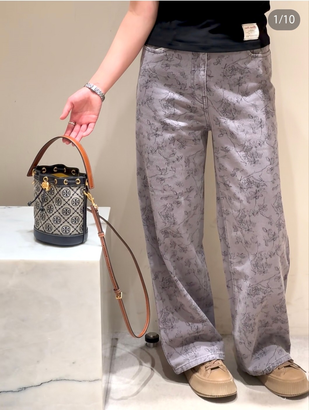 TB新款 T MONOGRAM 老花水桶包,经典 T Monogram 图案,融合提花织物。这款迷你水桶包采用细腻皮革饰边,配有顶部提柄和可拆卸斜背带。可通过金属双 T Logo 按扣调节抽绳长度,上身百搭。尺寸:18/21/11