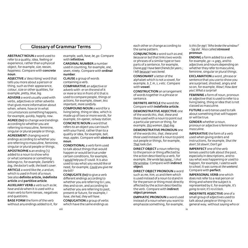 Designed for all those learning French at school, at work or at home. It provides easily accessible information in an attractively presented layout. Key grammatical points are highlighted throughout the text as a means of reinforcement. In addition, a full glossary gives clear explanations of grammatical terminology.
