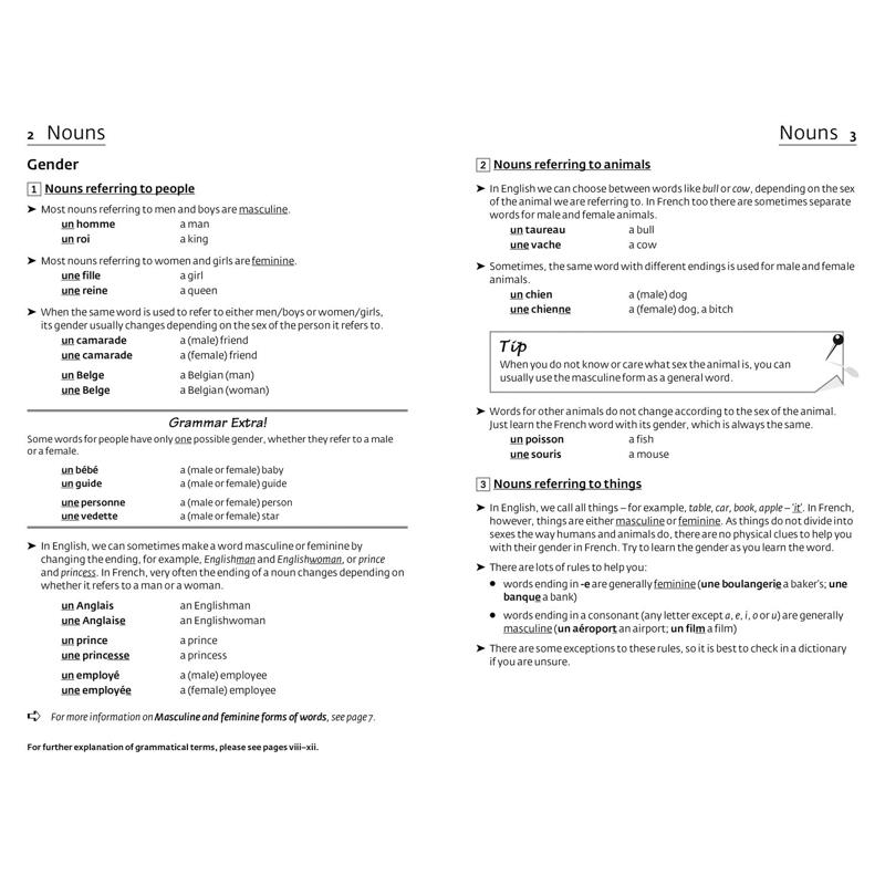 Explains the essential points of French grammar using simple language throughout.