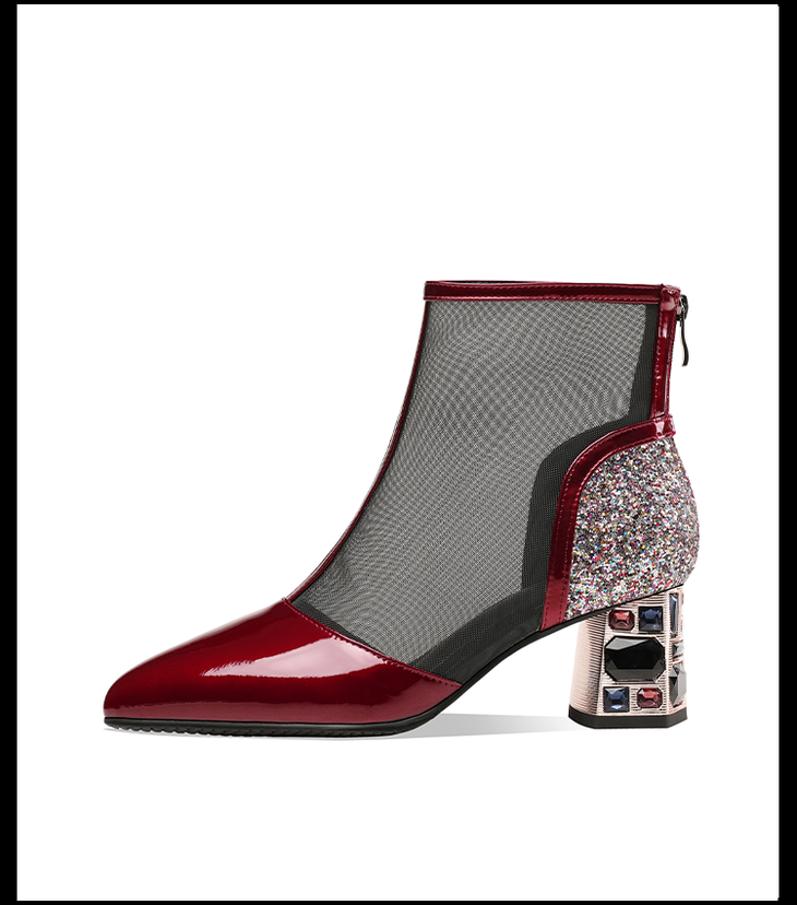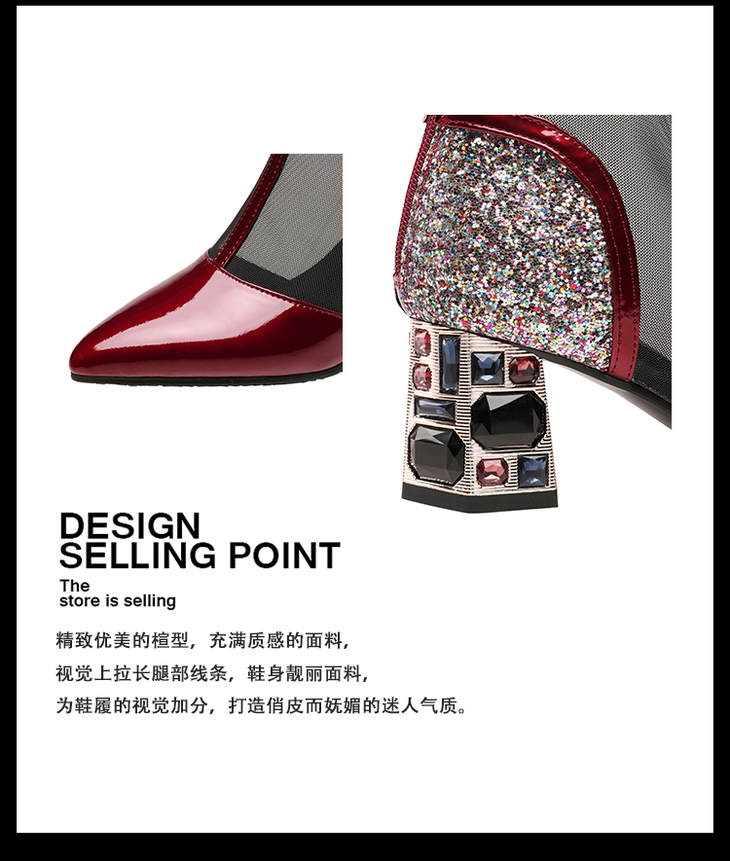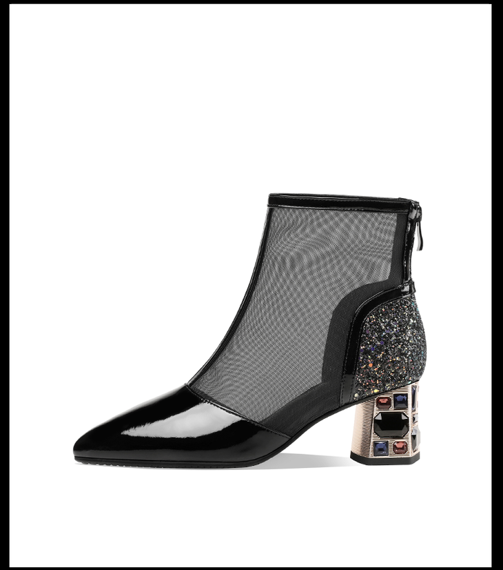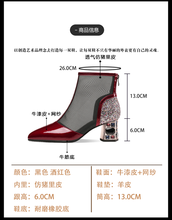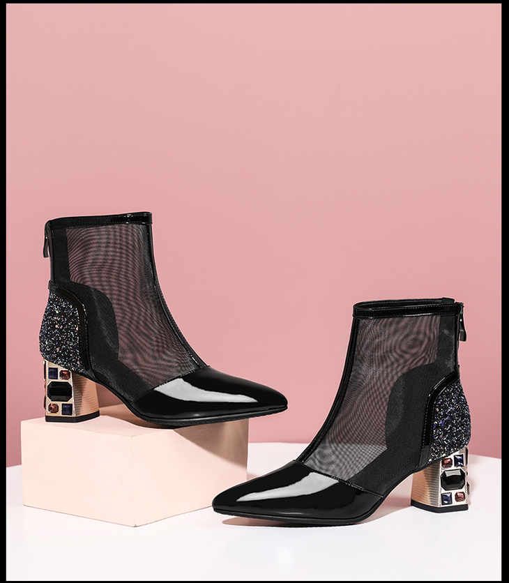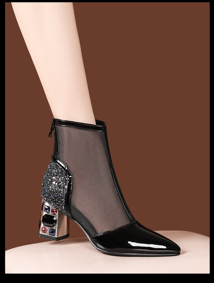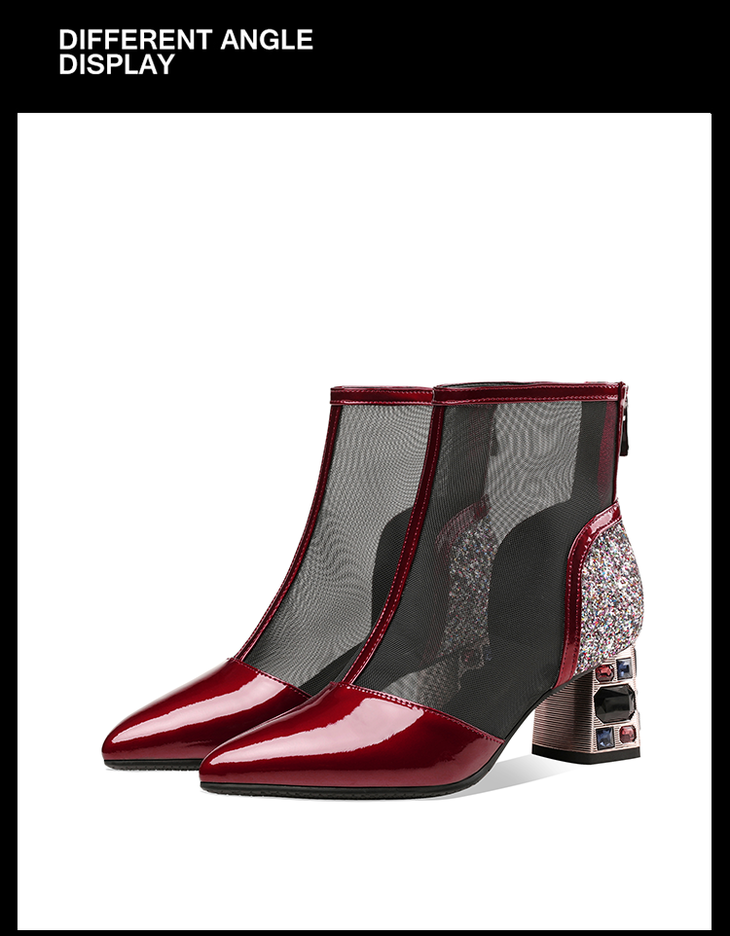 【预售7天】新款粗跟漆皮网靴女镂空妈妈网纱中跟水钻凉靴包头凉鞋女 PLGZ D1-1