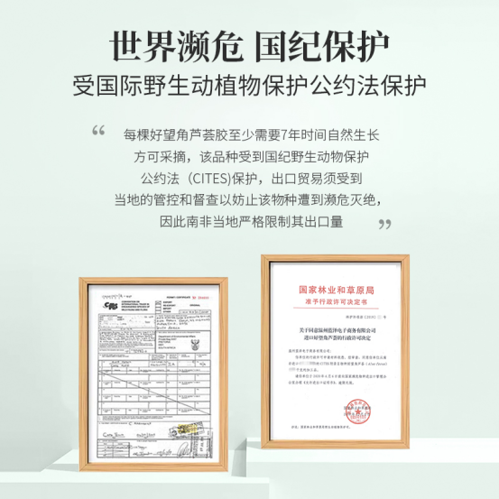 好望角芦荟(Aloe Ferox)仅在西开普敦一带山脉生长 无法存活于其他地方,所以被列为国际II类濒危物种 南非政府仅发放几张濒危开采许可证 AMC正是其中一家能够正规开采的公司 每棵好望角芦荟树都有政府登记 而且只能收割7年以上树龄的芦荟叶,避免该物种灭绝。 如出口到中国,还必须经过南非林业局的出口许可 之后去国际上的CITES公约组织备案 再到中国林业局申请濒危进口许可 最终才能拿到一张印有中国大熊猫的许可证 (这流程跟出借大熊猫一样困难繁琐)